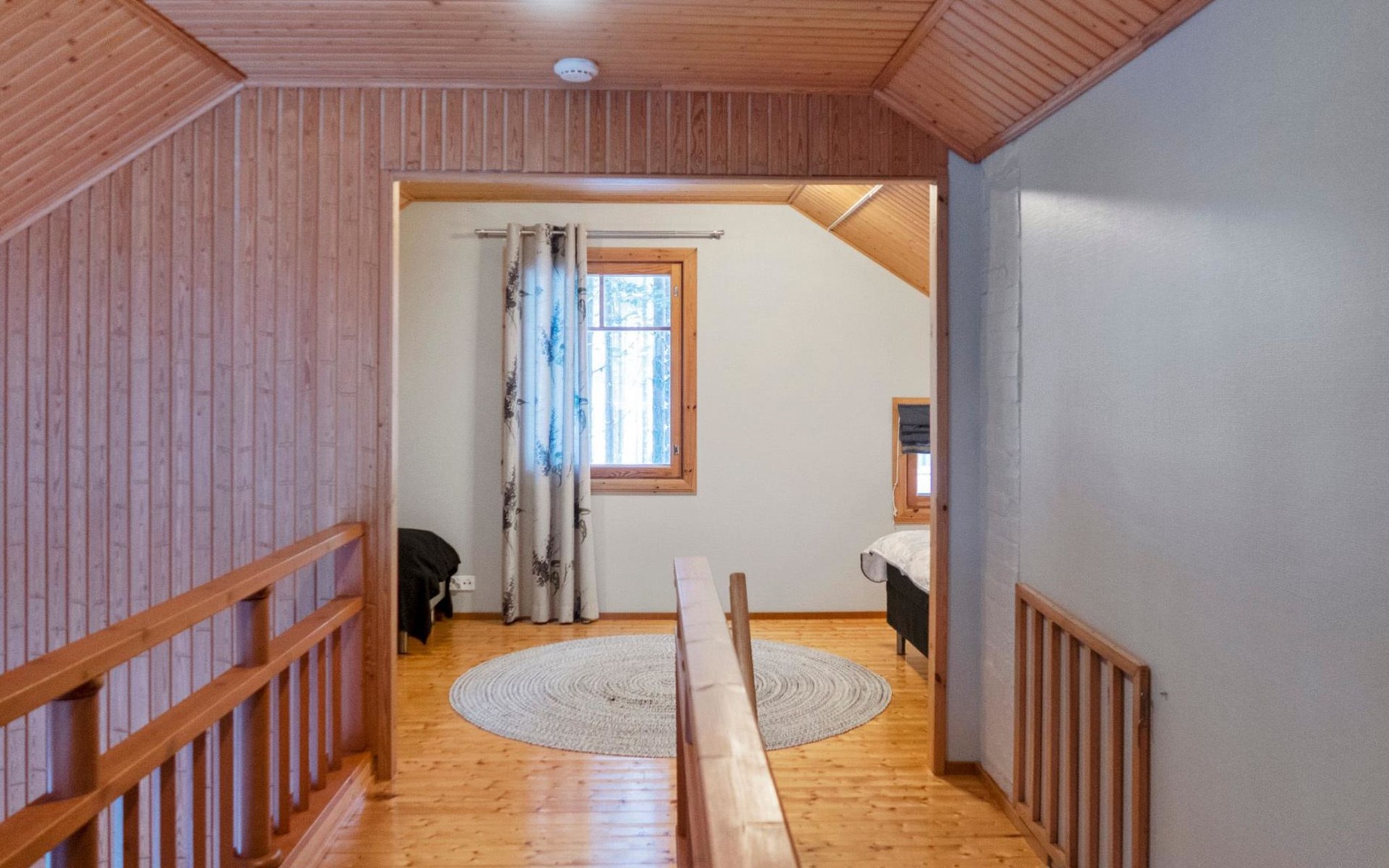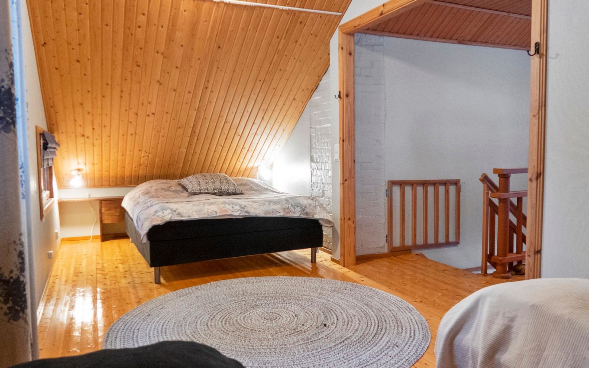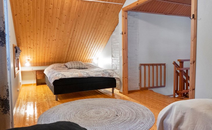 On the upper floor, a doorless bedroom with a double bed and two single beds. In addition, access from the loft to a small windowless sleeping loft with alternative beds for 2 (separate 80 cm beds).
