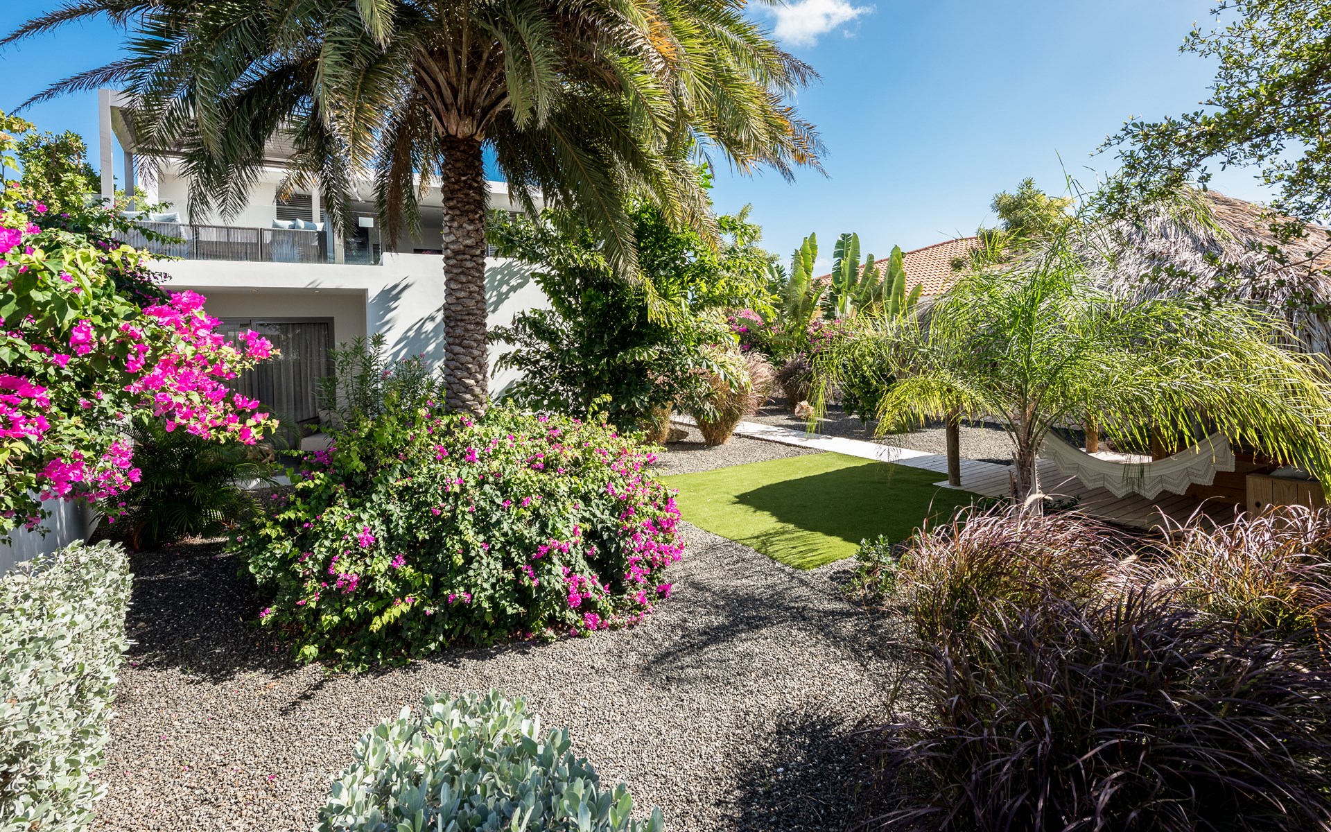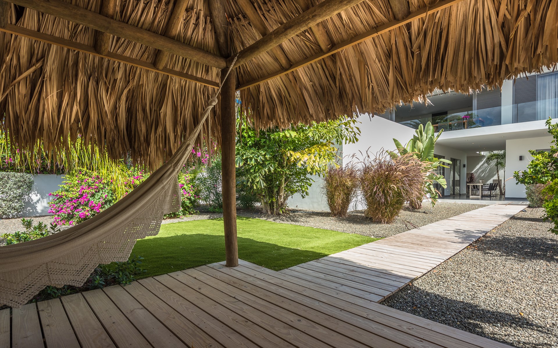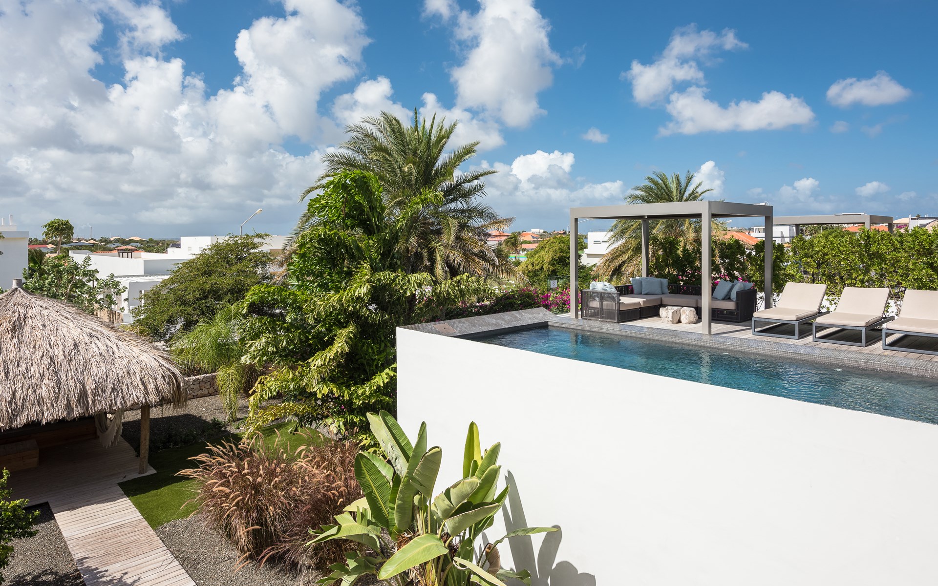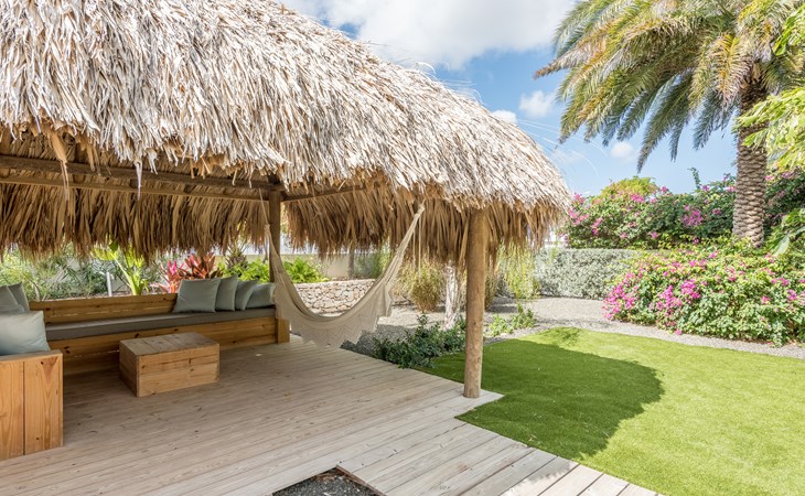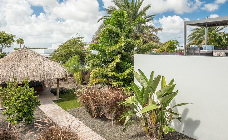 The spacious villa consists of 2 floors. You enter the house from the first floor. The villa has 4 bedrooms, all with an en-suite bathroom. On the first floor are the master bedroom, patio with lounge sofa and sunbeds and of course the lovely swimming pool. The kitchen and living room are also on the first floor. The other 3 bedrooms are on the ground floor. Through the bedrooms you can reach the tropical garden with palapa with lounge sofa and hammock. There is also a large dining table and outdoor barbecue in the garden.