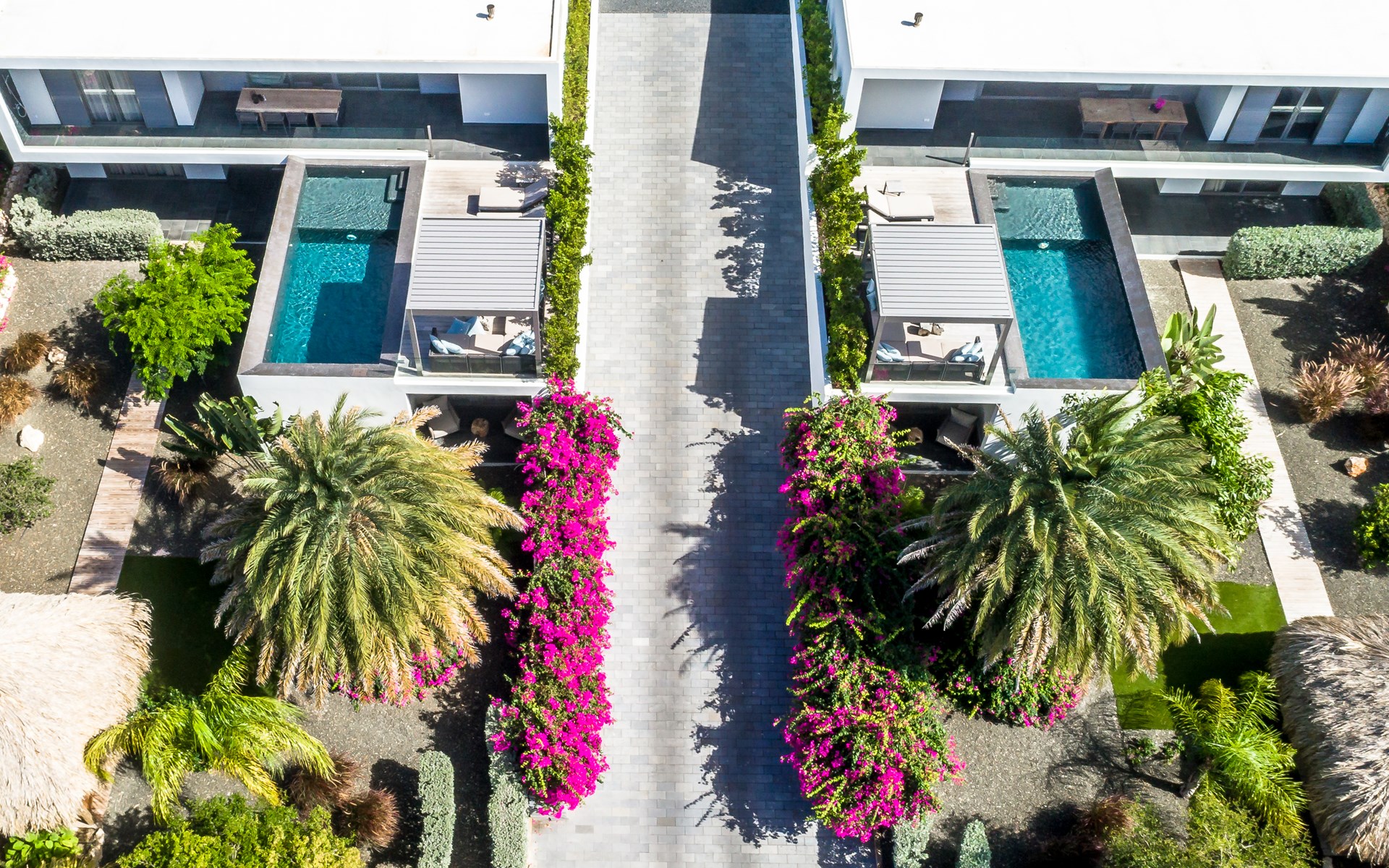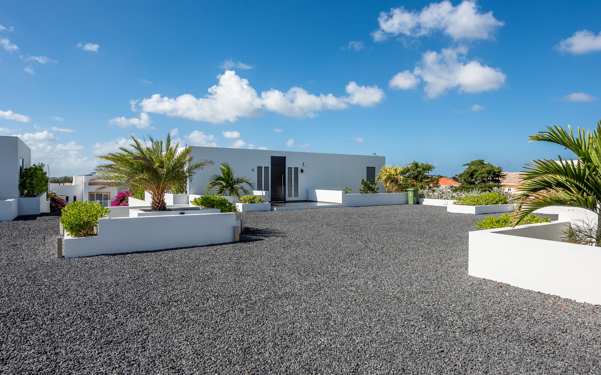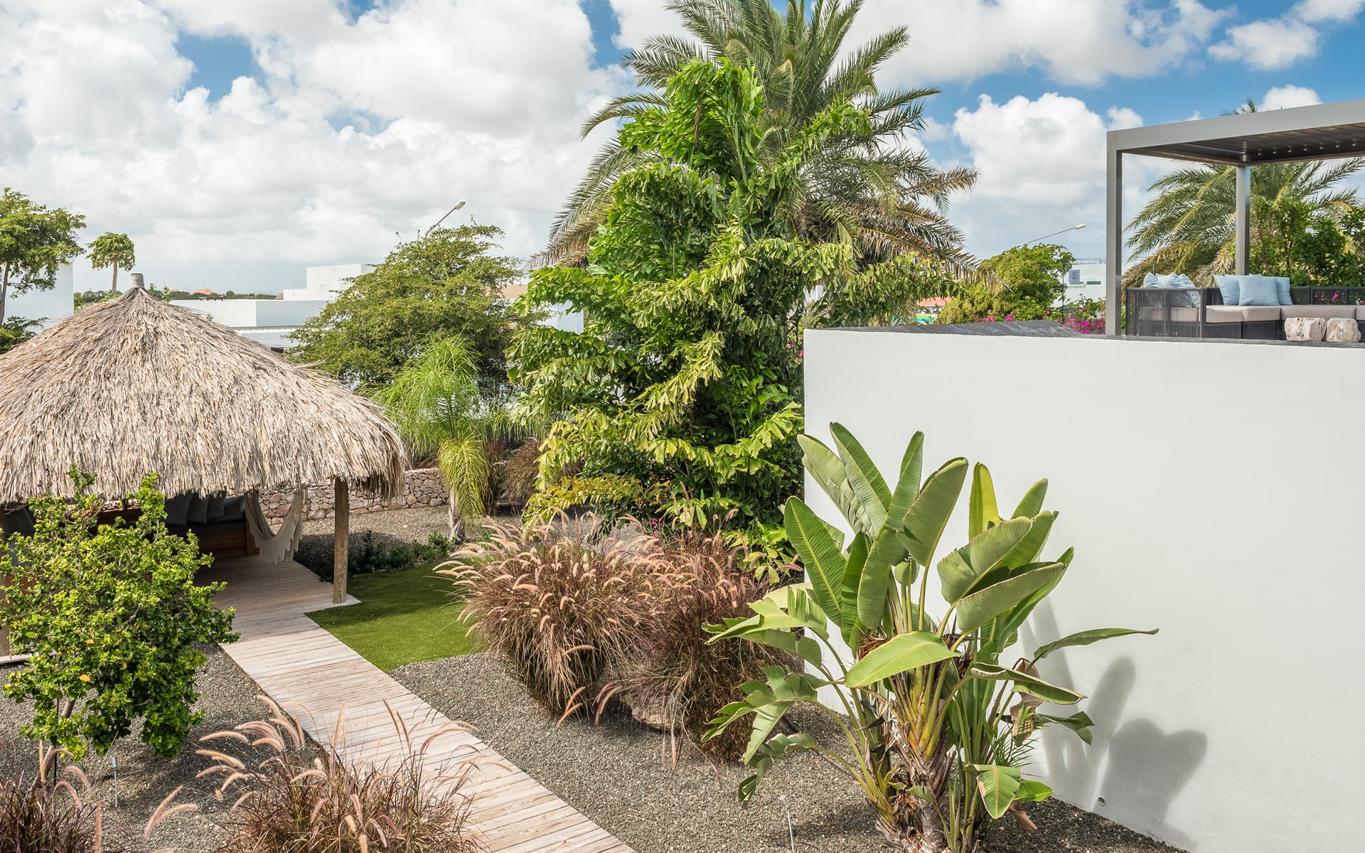 The spacious villa consists of 2 floors. You enter the house from the first floor. The villa has 4 bedrooms, all with an en-suite bathroom. On the first floor are the master bedroom, patio with lounge sofa and sunbeds and of course the lovely swimming pool. The kitchen and living room are also on the first floor. The other 3 bedrooms are on the ground floor. Through the bedrooms you can reach the tropical garden with palapa with lounge sofa and hammock. There is also a large dining table and outdoor barbecue in the garden.