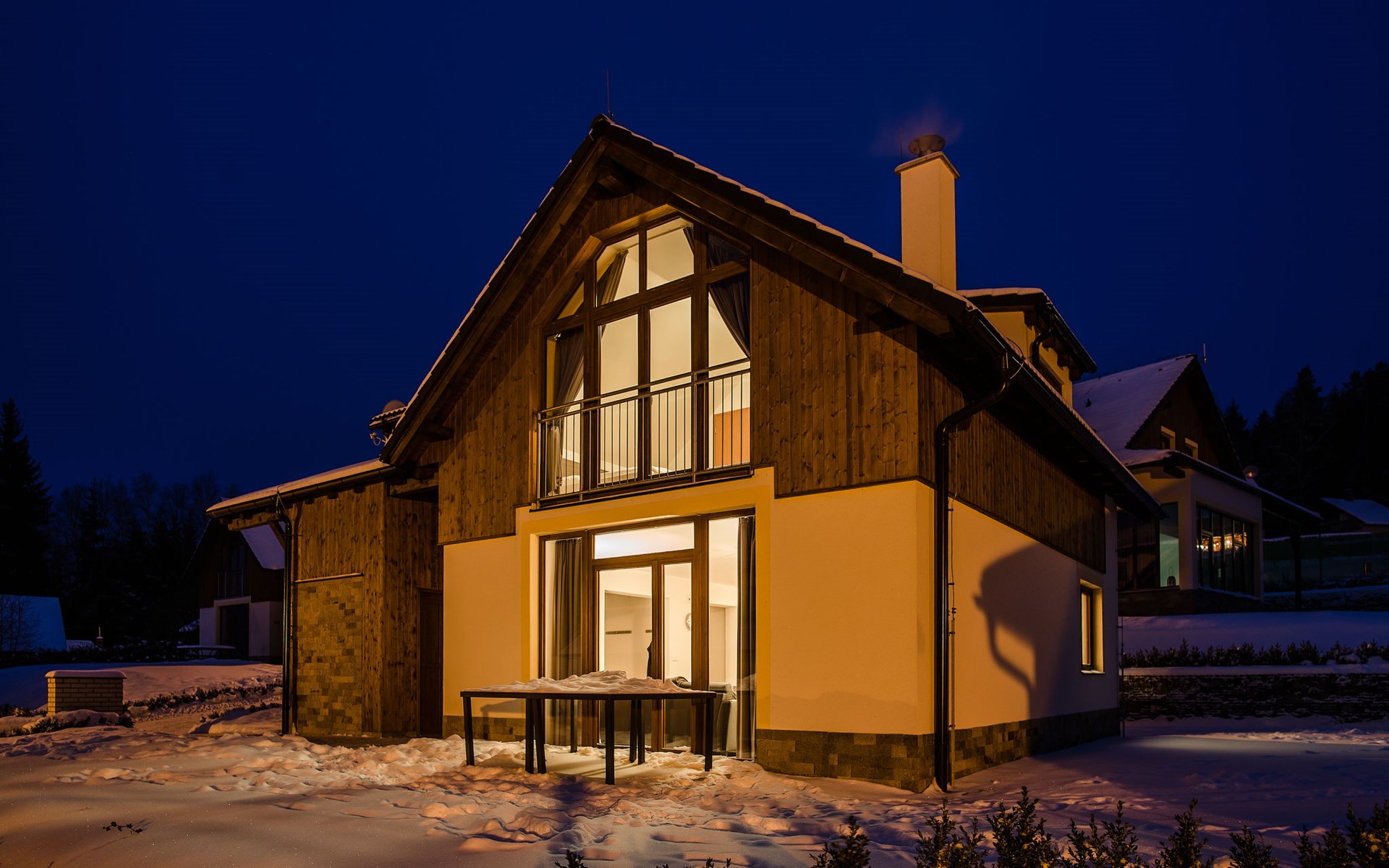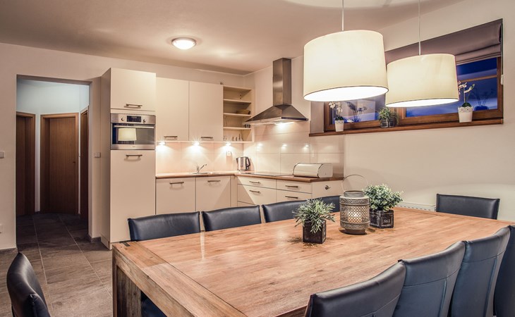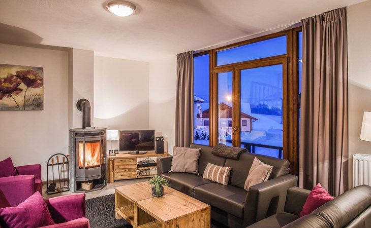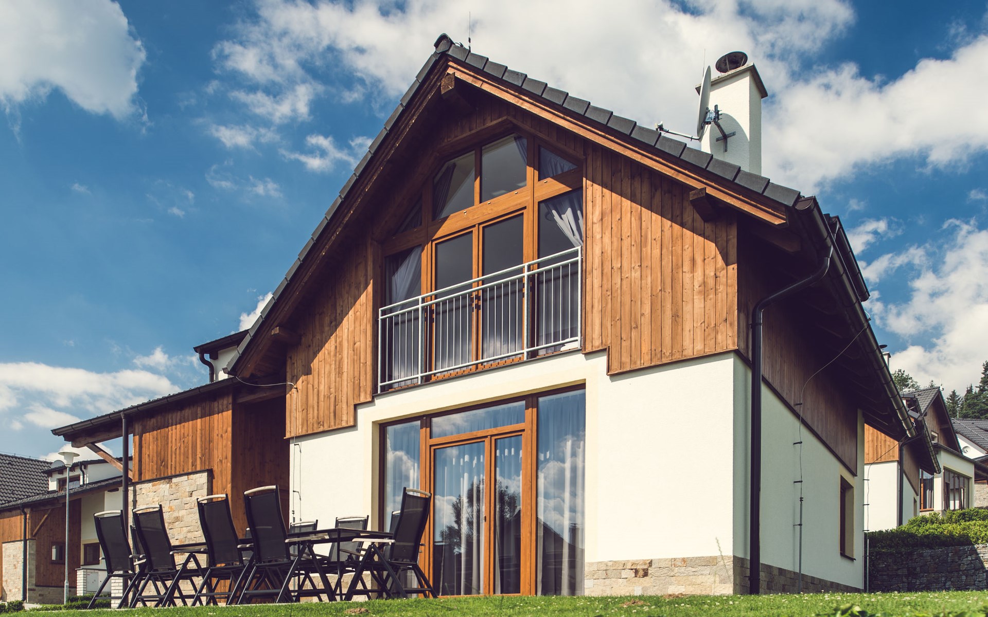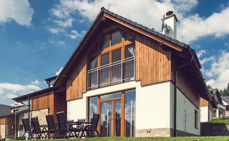 Child friendly, modern holiday village "Residence Lipno". 40 houses in the resort. On the outskirts, 1.5 km from the centre of Lipno nad Vltavou, in a sunny, elevated position, 250 m from the lake, 2 km from the skiing area. For shared use: property. Children's playground (slide, swing). Private: garden. Terrace, garden furniture. In the complex: reception, storage room for bicycles, washing machine, tumble dryer (for shared use, extra). Parking at the house. Grocery 1.2 km, restaurant 200 m, bus stop "Lipno nad Vltavou, Kobylnice" 200 m, grass beach 250 m, indoor swimming pool 2 km. Sports harbour 1.5 km, walking paths from the house 10 m, cycle lane, chair lift 2 km, skisport facilities 2 km, ski bus stop 200 m, ski school 2 km. Nearby attractions: Aquaworld Lipno 2 km, Hopsárium 2 km, Bobová dráha 2.5 km, Stezka korunami stromů 3.5 km, Království Lesa 3.5 km. Well-known ski regions can easily be reached: Skiareál Lipno 2 km. All houses/apartments are individually designed/furnished. Marina Lipno (1,5 km) with a yacht harbor and a indoor water park (not in operation from 1.11.- 30.11.). Golf course and ski lift to Kramolin 1 km (5 ski slopes, snowboard park, 50 km cross-country skiing). Yacht, ski and bicycle rental.