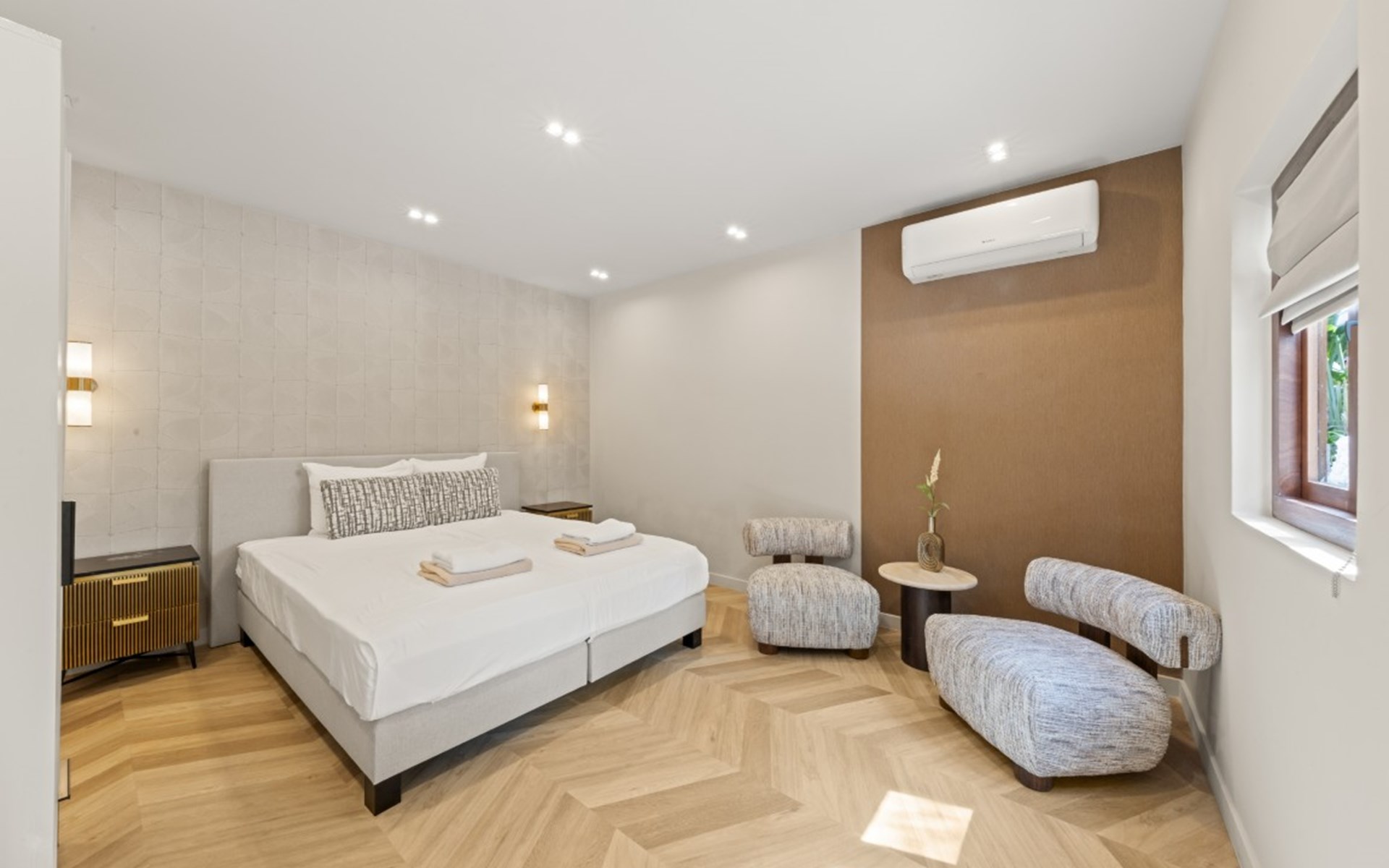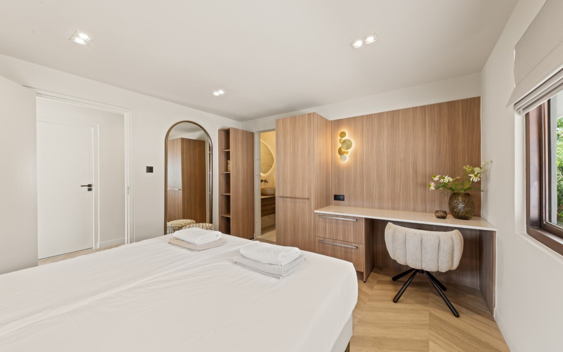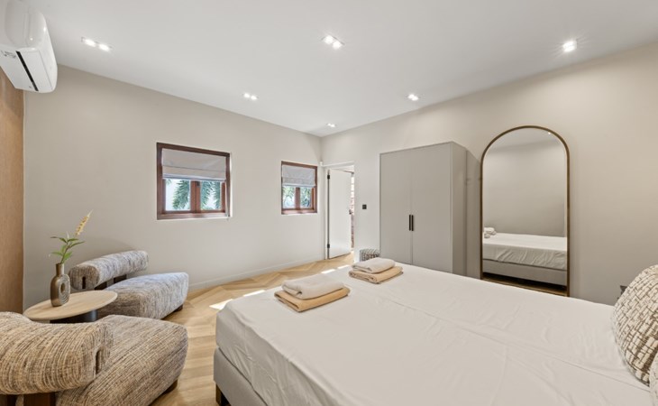When you drive into the garden, you step into a paradise. Colorful flowers, swaying palms, a swimming pool with sunbeds, a lovely garden bench and a large dining table outside under the veranda. The villa has a spacious, bright living room with kitchen, equipped with all modern appliances, sitting area and dining table. In addition, the villa has 3 bedrooms, 2 bathrooms with shower and toilet and is of course equipped with air conditioning. There is a large dining table both inside and outside.