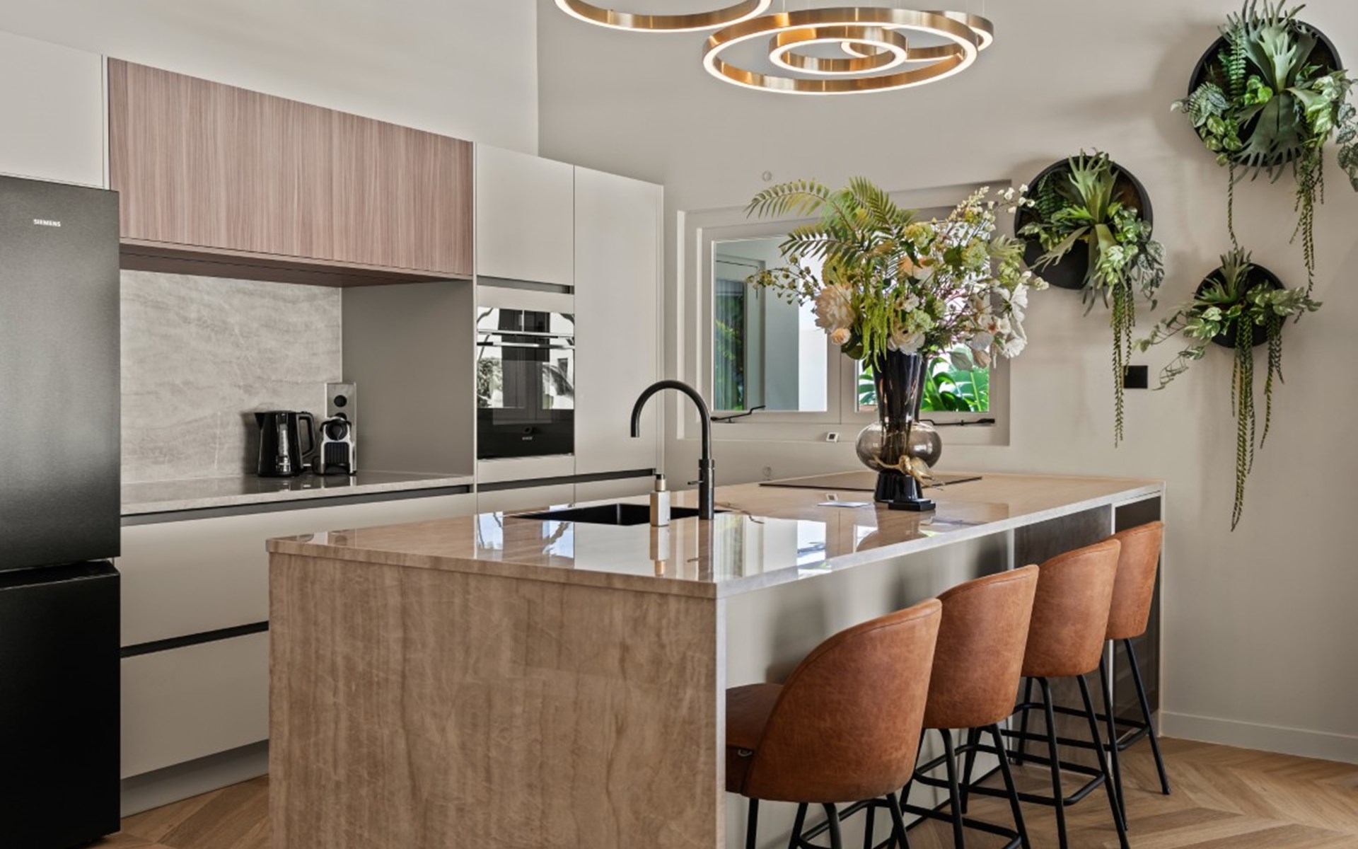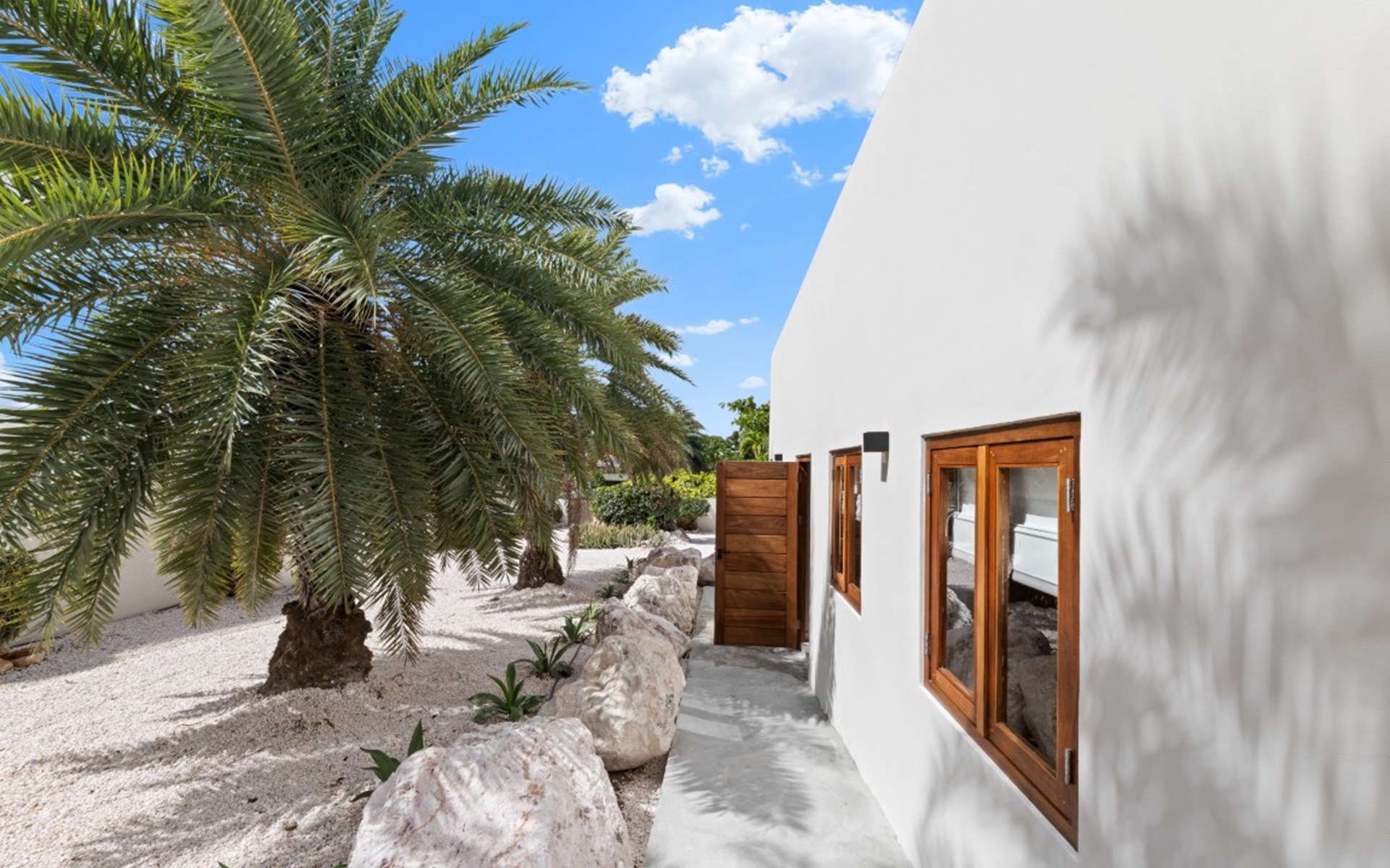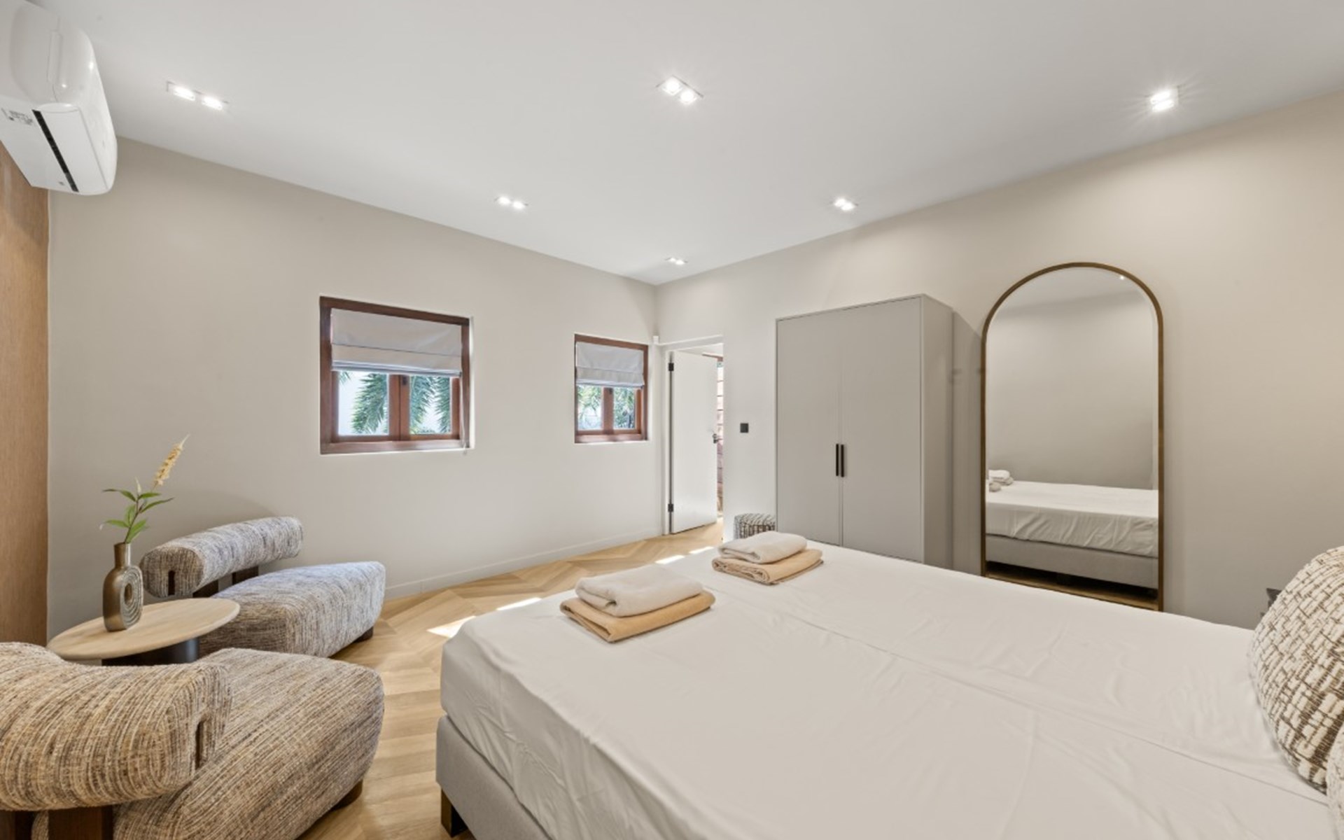 When you drive into the garden, you step into a paradise. Colorful flowers, swaying palms, a swimming pool with sunbeds, a lovely garden bench and a large dining table outside under the veranda. The villa has a spacious, bright living room with kitchen, equipped with all modern appliances, sitting area and dining table. In addition, the villa has 3 bedrooms, 2 bathrooms with shower and toilet and is of course equipped with air conditioning. There is a large dining table both inside and outside.