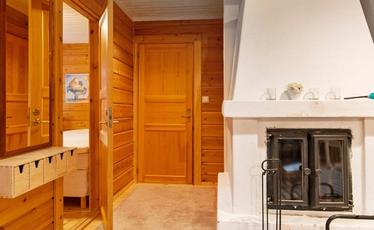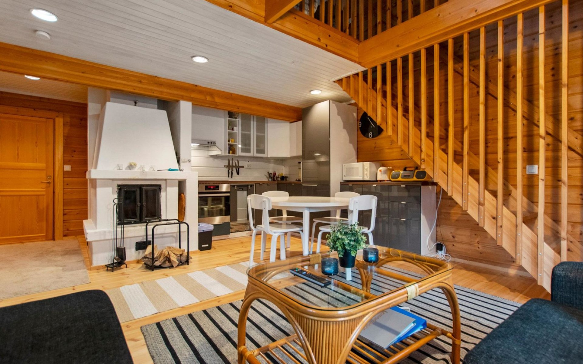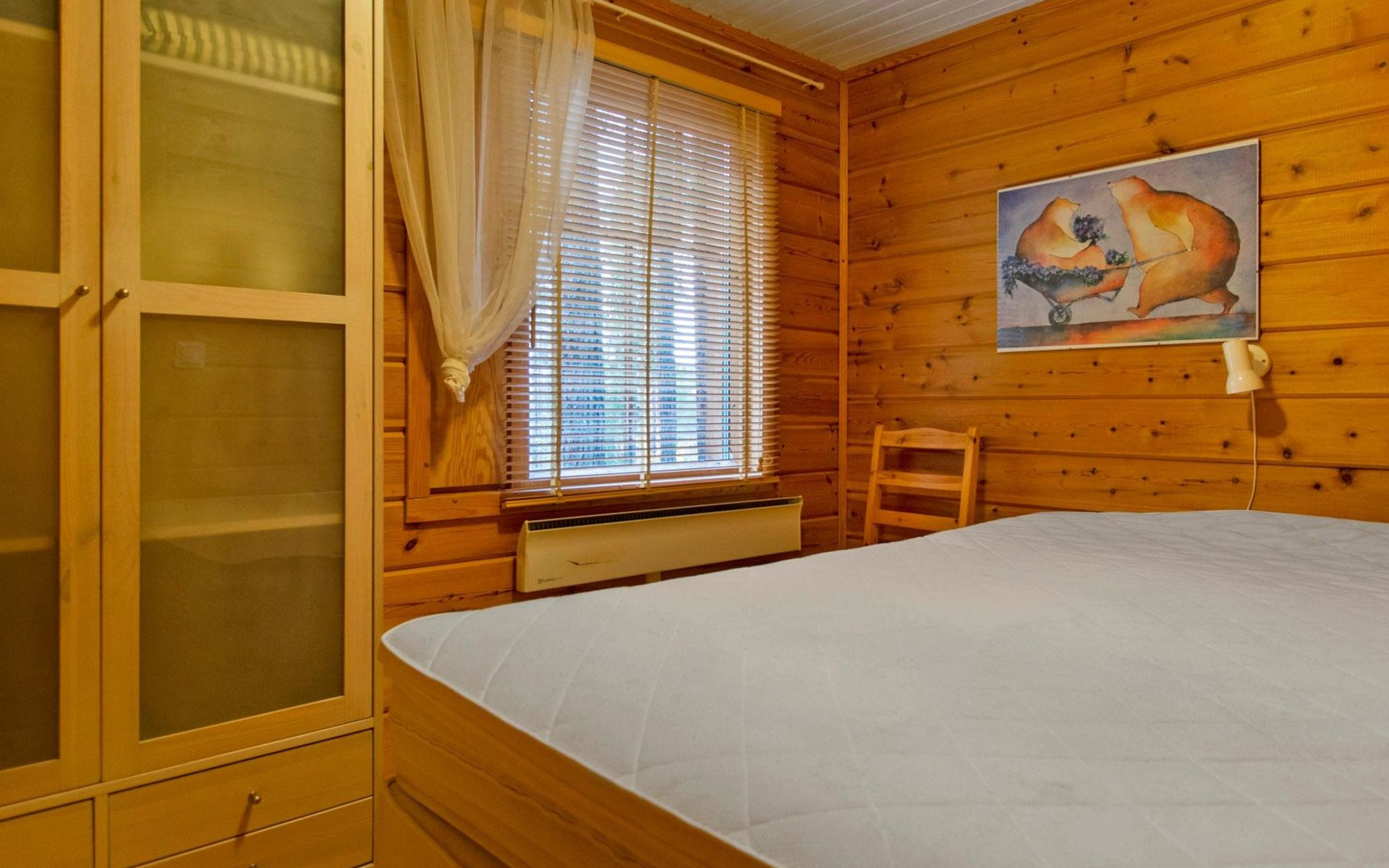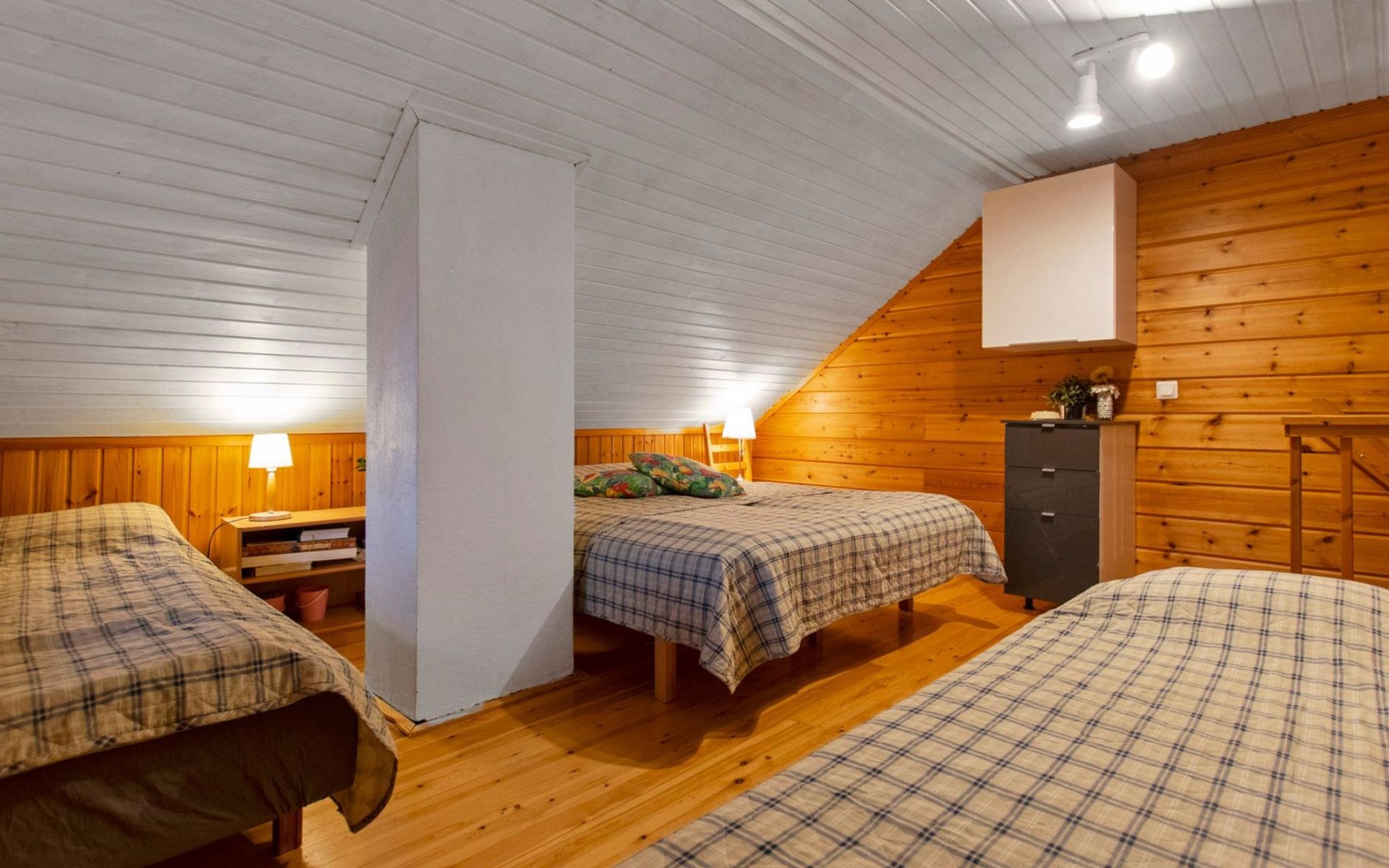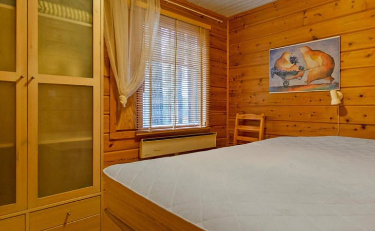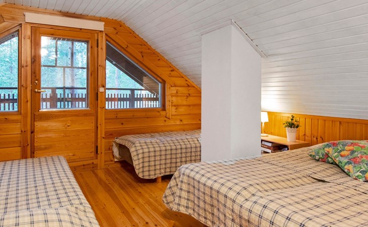 Log panel semi-detached house with living room/kitchen, downstairs bedroom with 140 cm wide double bed, toilet, washroom and sauna (electric stove), loft with 4 beds, open porch.