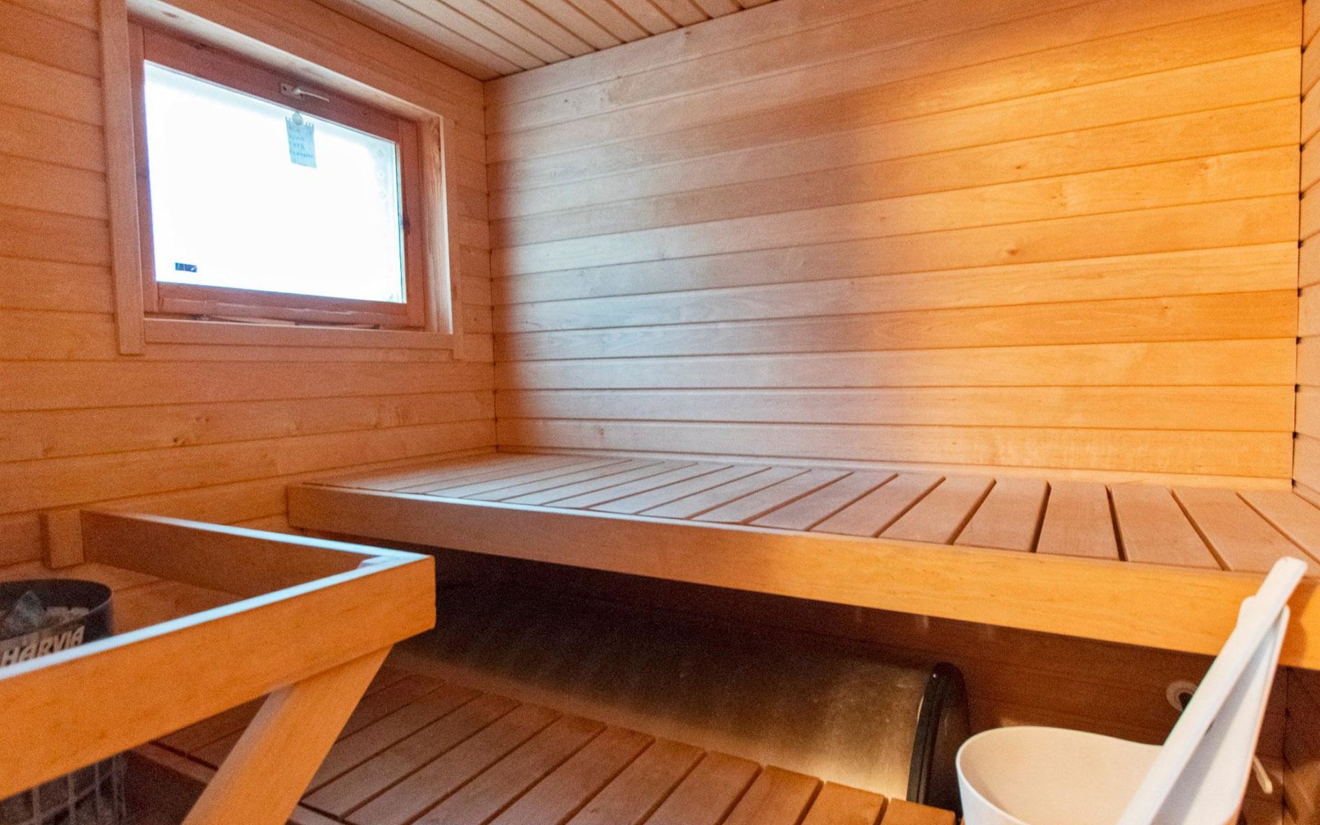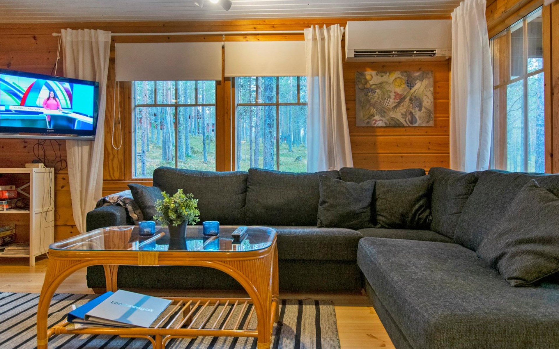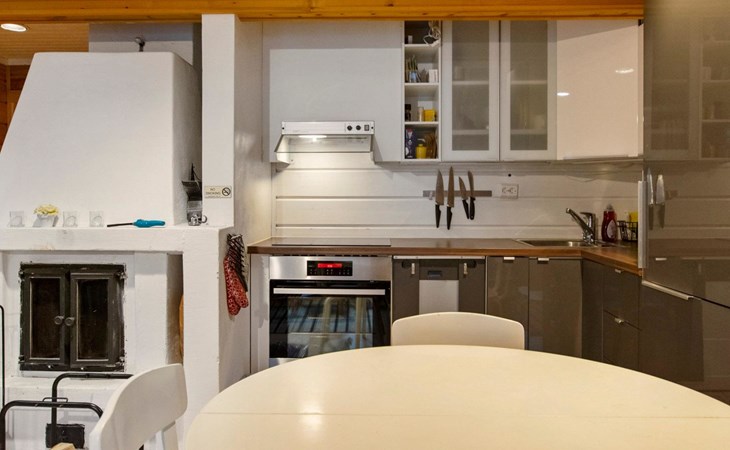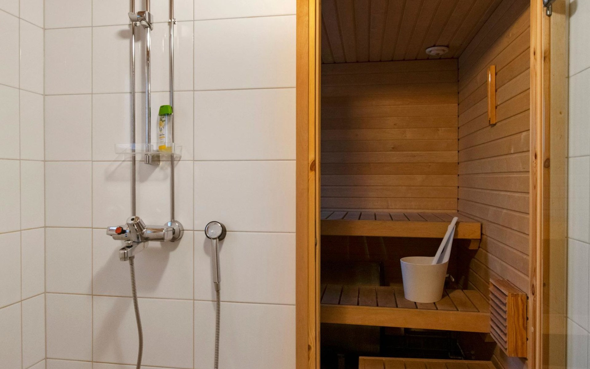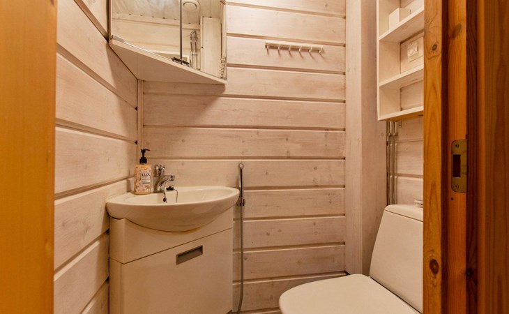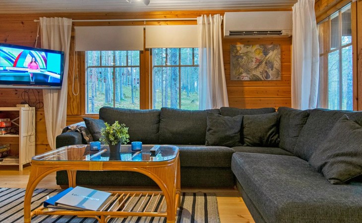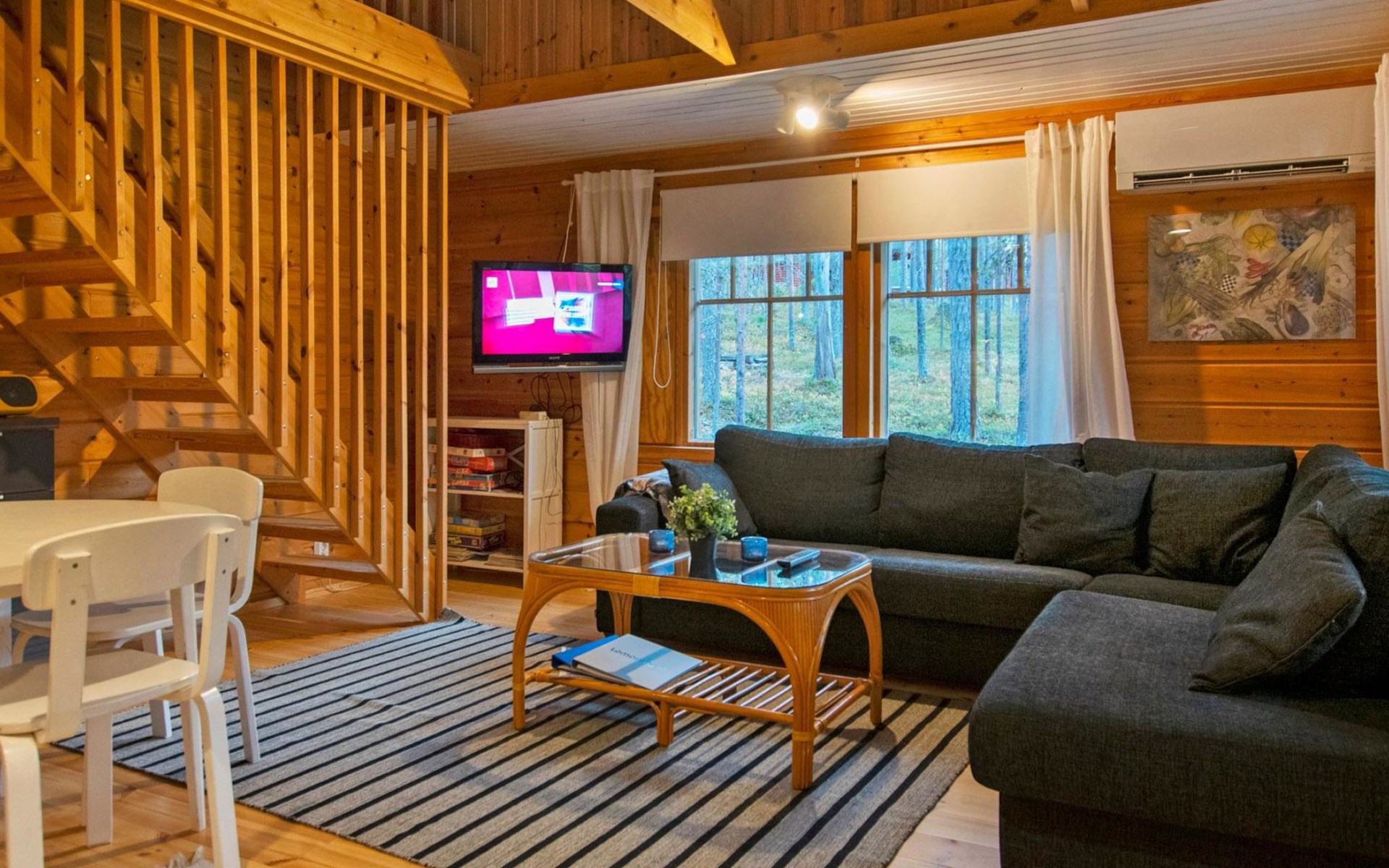 Log panel semi-detached house with living room/kitchen, downstairs bedroom with 140 cm wide double bed, toilet, washroom and sauna (electric stove), loft with 4 beds, open porch.