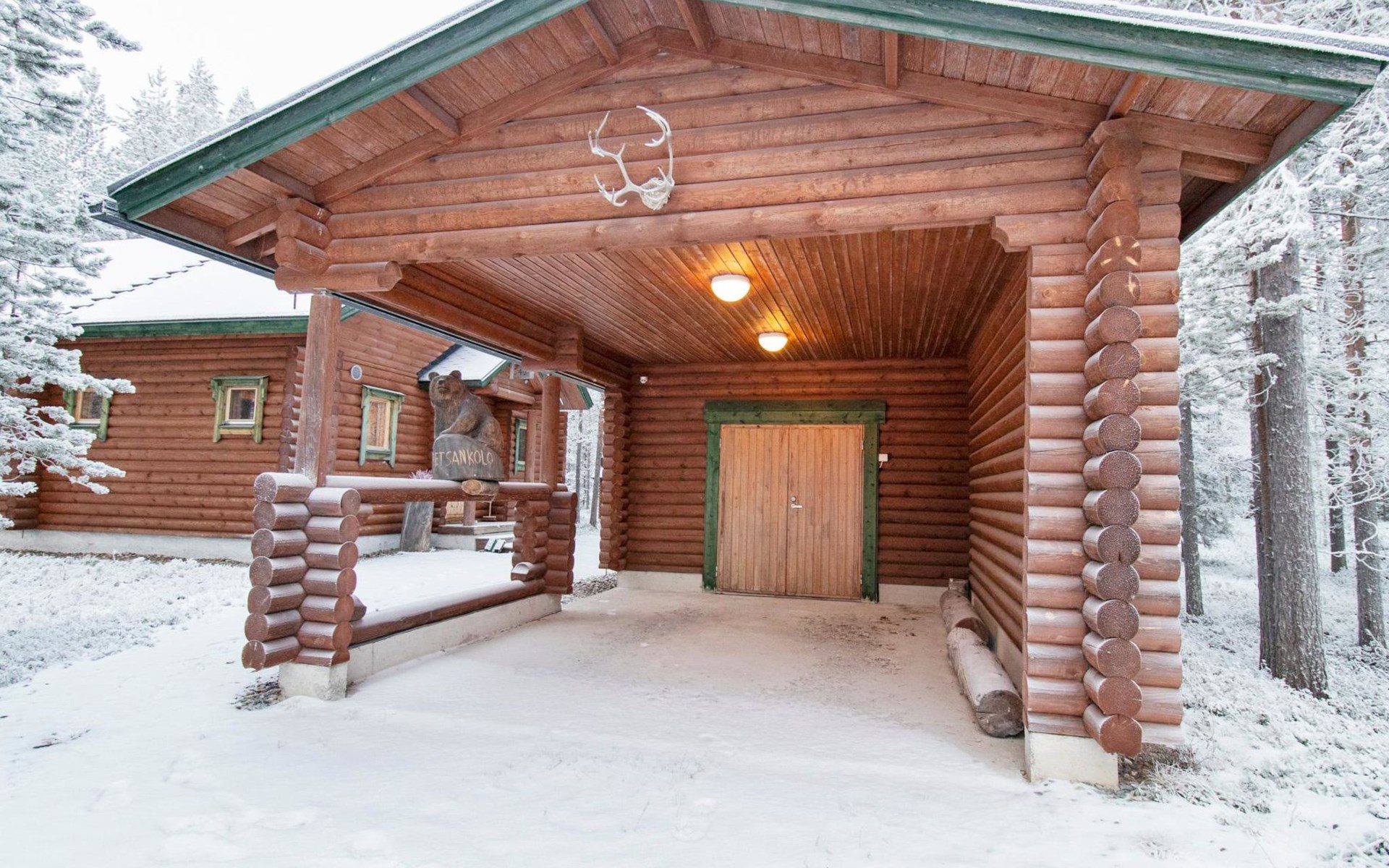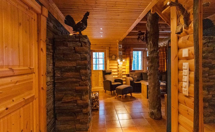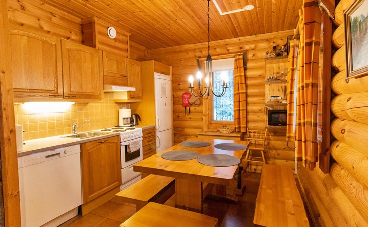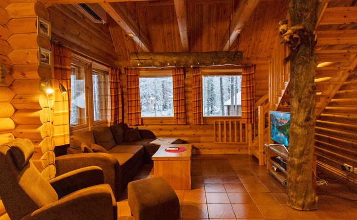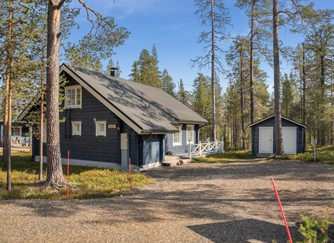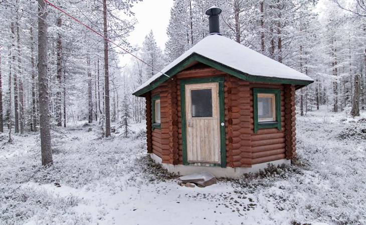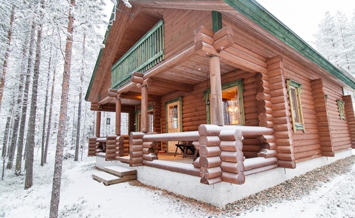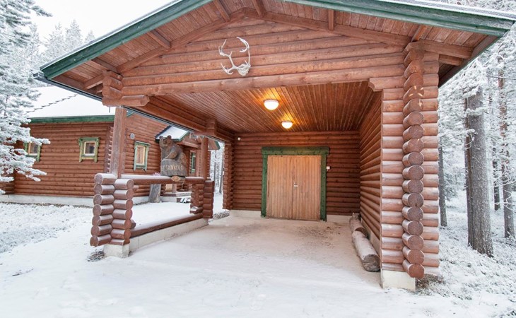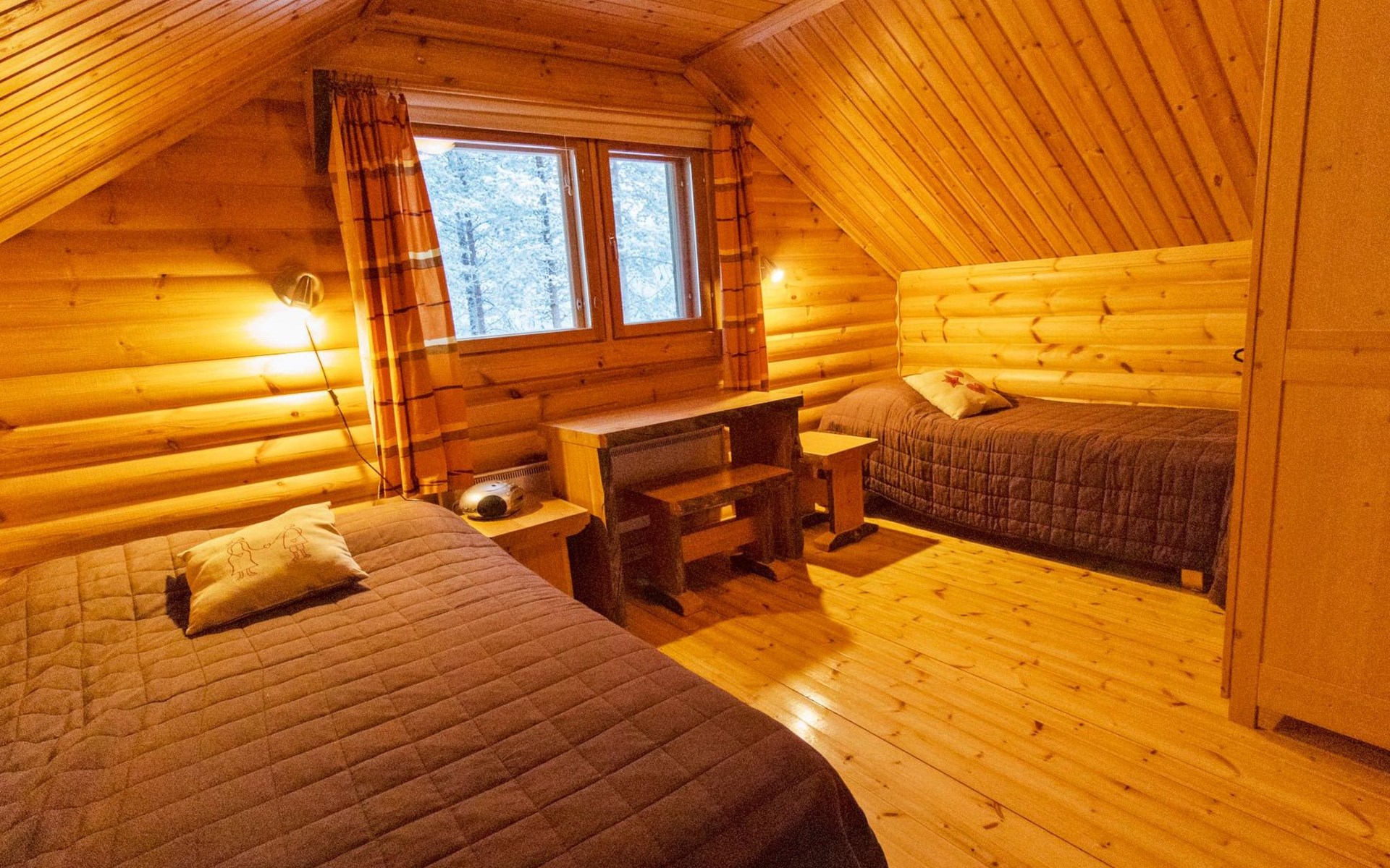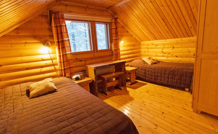 53 km north from Kemijärvi, round log cabin built in 2008. Living room/kitchen, bedroom with double bed, washroom, sauna (electric stove), toilet. Upstairs: open balcony with convertible sofa/bed for two persons and bedroom with two separate beds. There are open porches on each floor, car shelter.