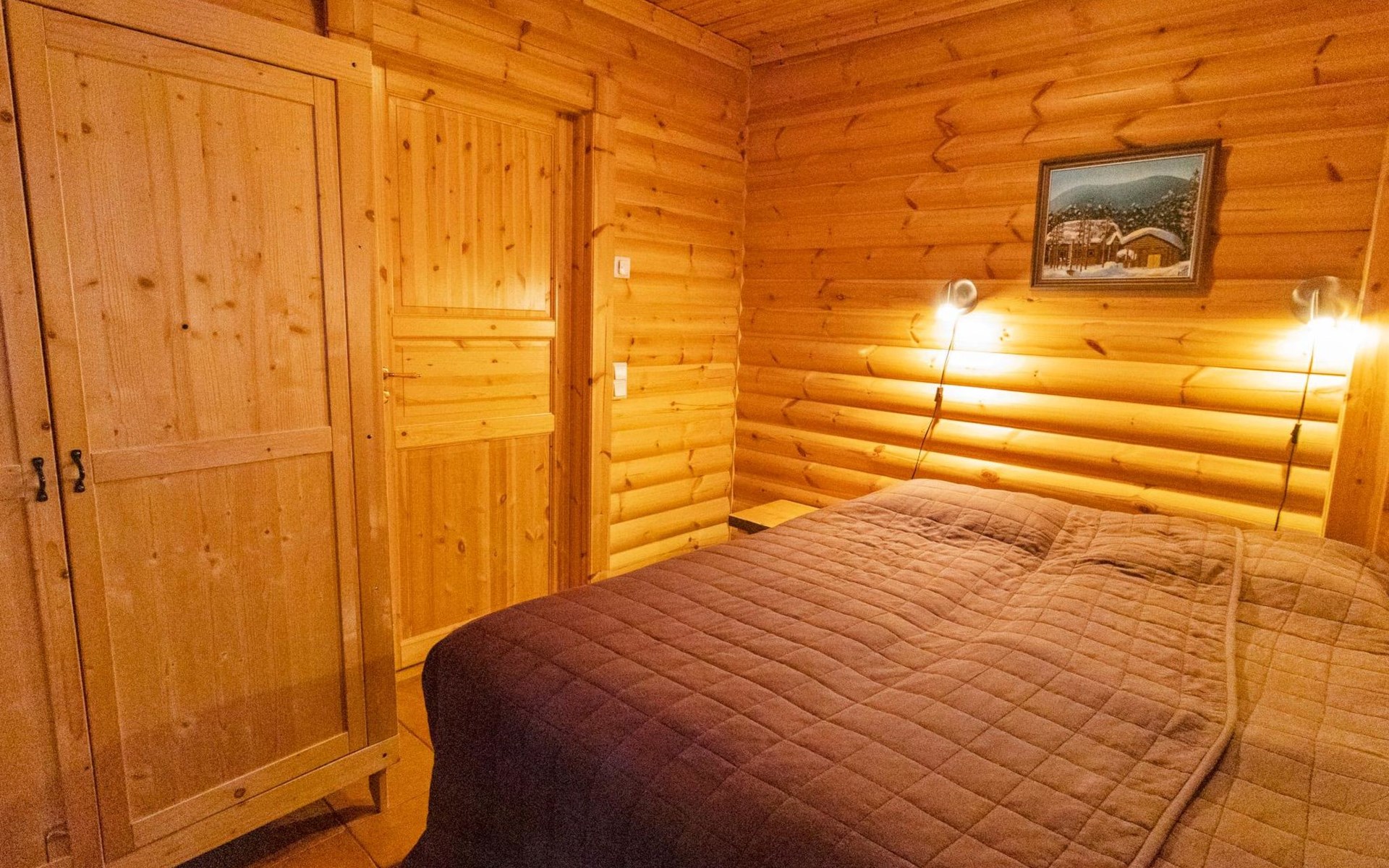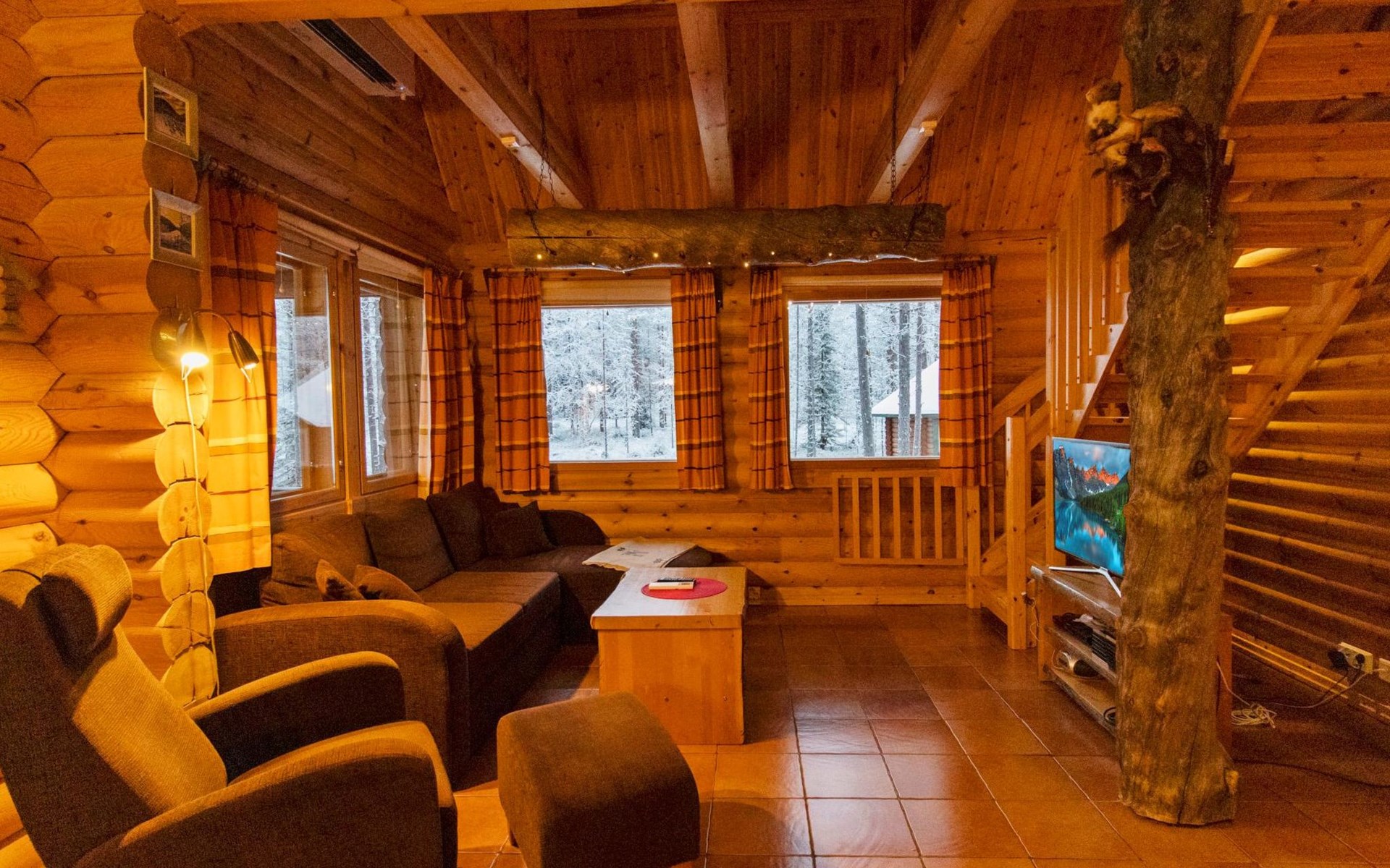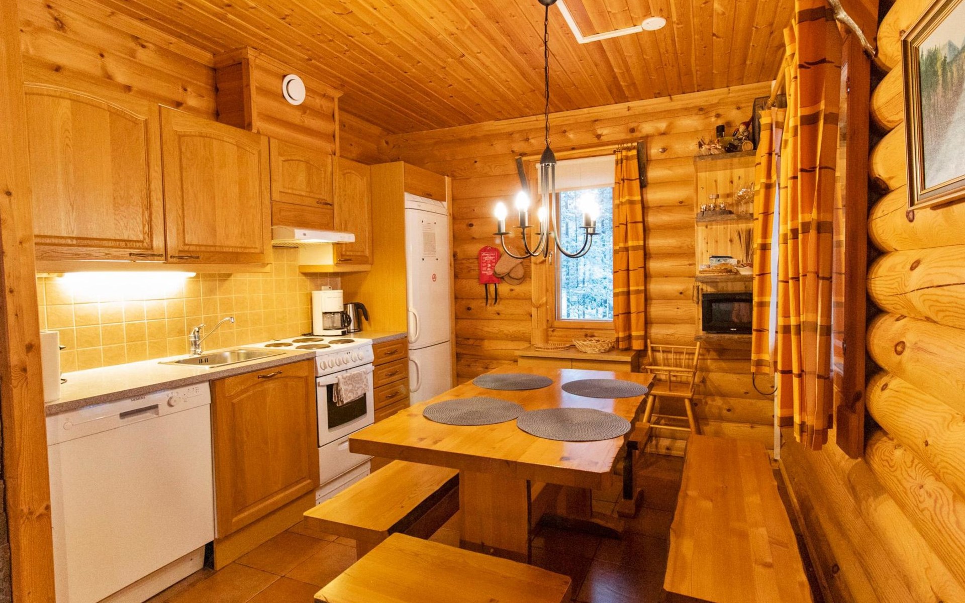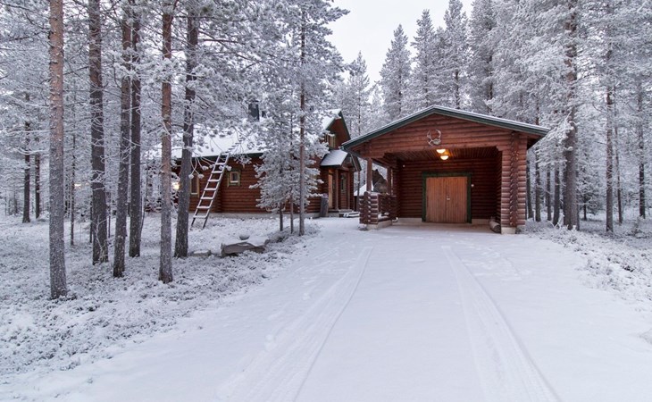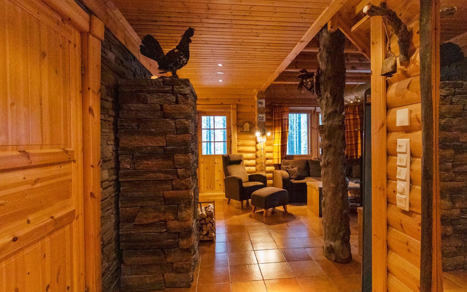 53 km north from Kemijärvi, round log cabin built in 2008. Living room/kitchen, bedroom with double bed, washroom, sauna (electric stove), toilet. Upstairs: open balcony with convertible sofa/bed for two persons and bedroom with two separate beds. There are open porches on each floor, car shelter.