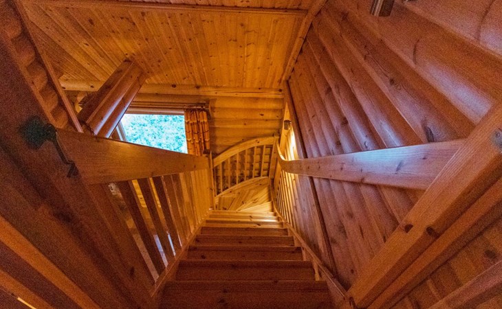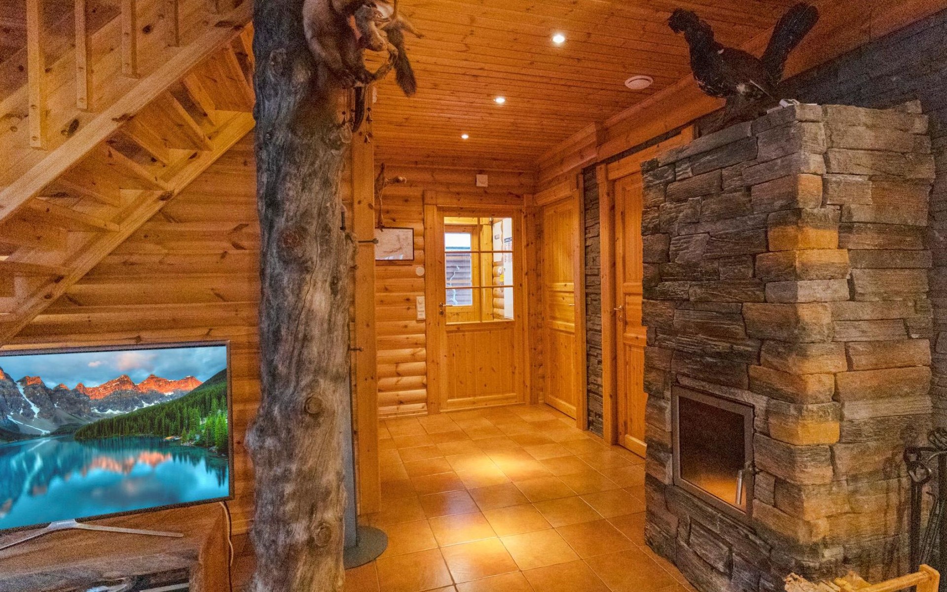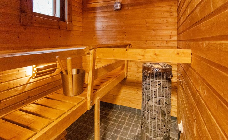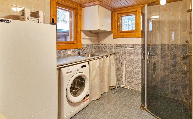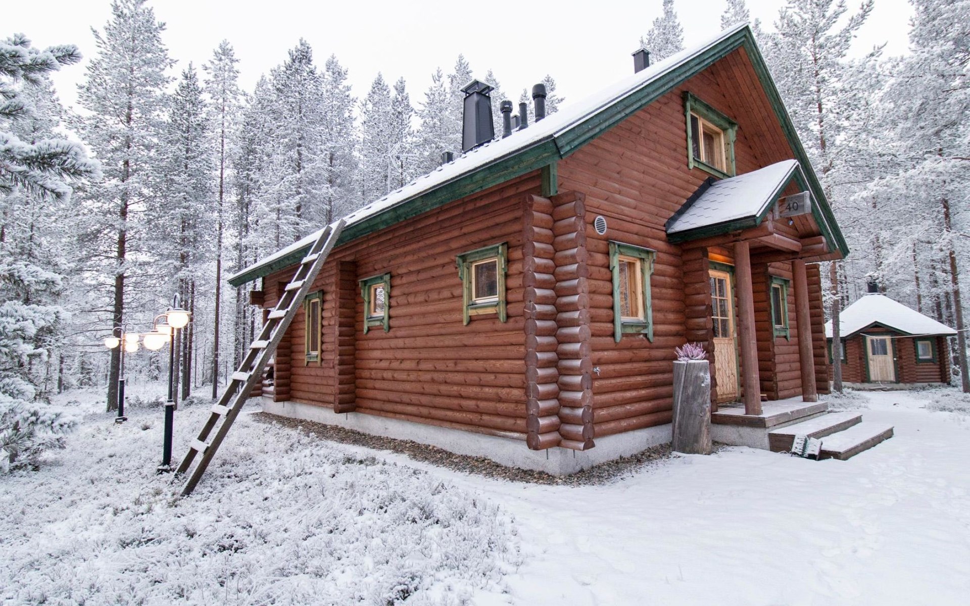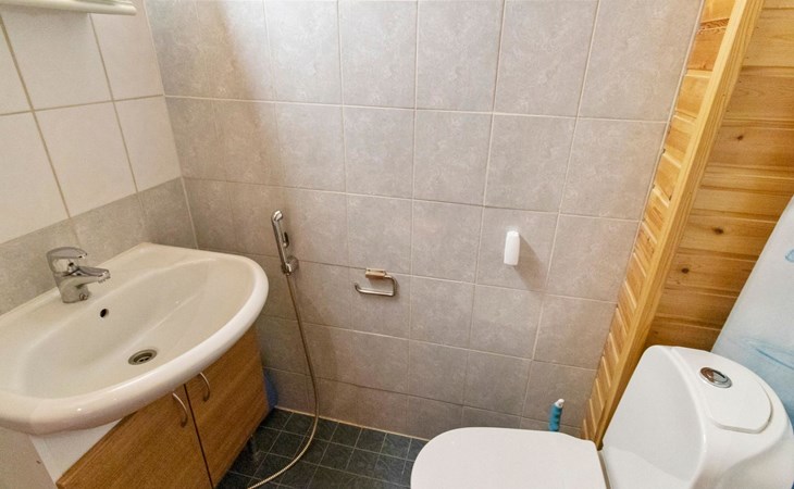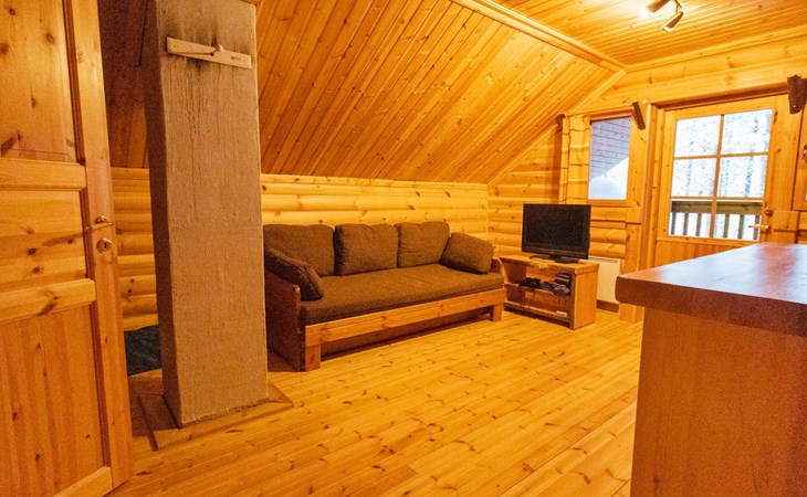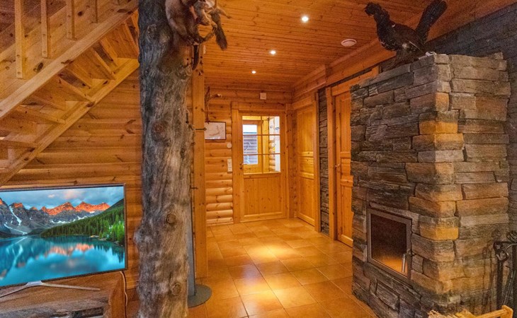 53 km north from Kemijärvi, round log cabin built in 2008. Living room/kitchen, bedroom with double bed, washroom, sauna (electric stove), toilet. Upstairs: open balcony with convertible sofa/bed for two persons and bedroom with two separate beds. There are open porches on each floor, car shelter.