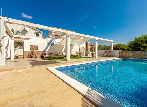 Single-family house "Nina". 500 m from the centre of Fažana, 8 km from the centre of Pula, in the residential district, 500 m from the sea, 500 m from the beach. Private: property 1'200 m2, trees. Terrace, garden furniture, barbecue. In the house: internet access, washing machine. Motor access to the house (300 m via unmade road). Parking (for 2 cars) on the premises. Shop 350 m, supermarket 700 m, bus stop 750 m, pebble beach, rocky beach 500 m.