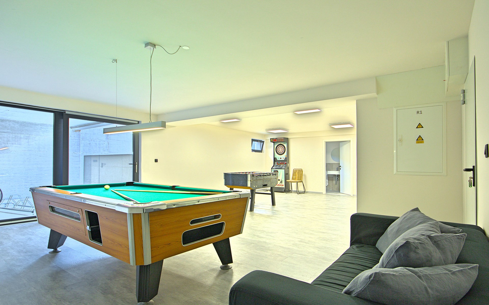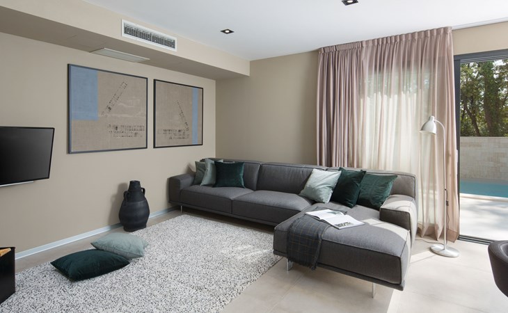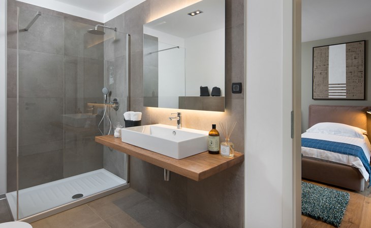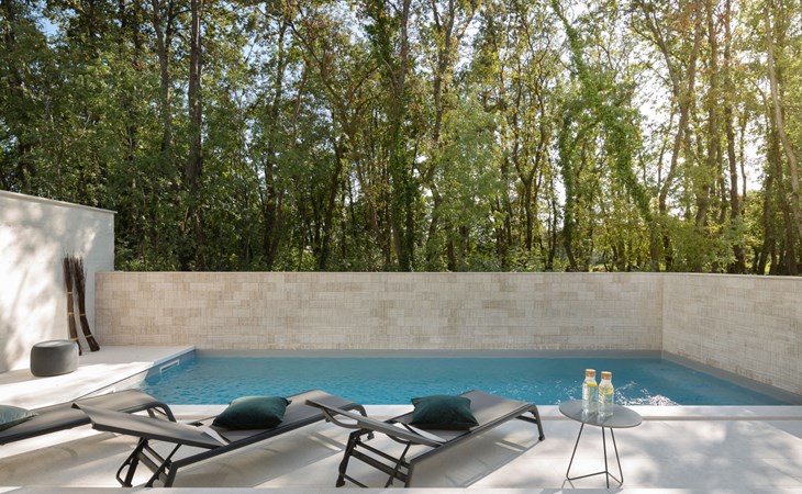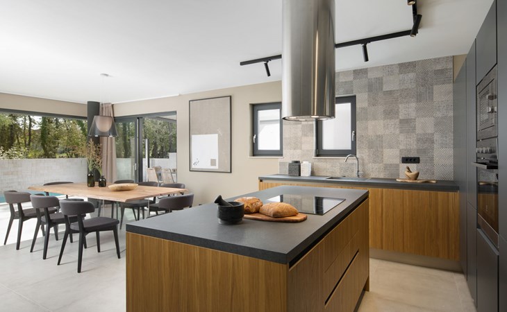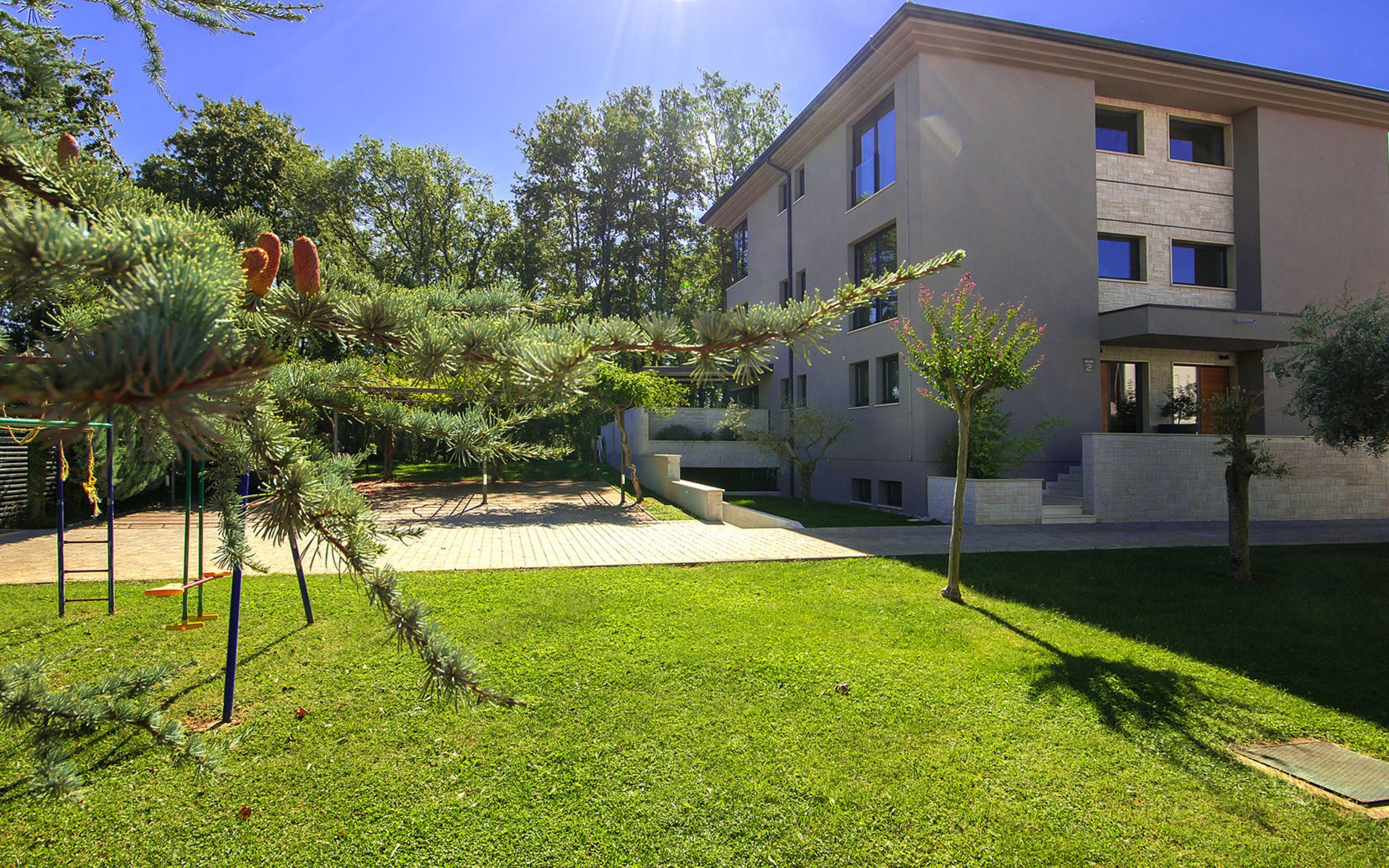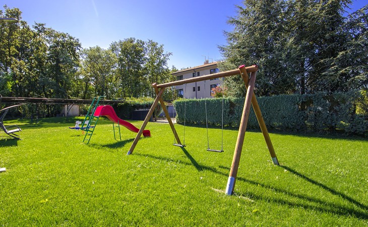 Modern semi-detached house "Oliva 1", 4 storeys, built in 2017. In the hamlet Križine 4 km from the centre of Umag, in a quiet, sunny position, from the sea, 200 m from the beach. For shared use: property 2'000 m2 (fenced), beautiful garden with lawn and plants. Children's playground (slide, swing). Private: property 100 m2 (fenced), swimming pool angular, heated (8 x 4 m, depth 140 cm, seasonal availability: 01.Jan. - 31.Dec.) with internal staircase. Outdoor shower. In the house: internet access, billiard table, table football, central heating system, washing machine, tumble dryer. Parking (for 2 cars) at the house on the premises. E-charging station. Shop 300 m, supermarket 3 km, restaurant 300 m, bus stop 400 m, pebble beach, rocky beach 200 m. Golf course (18 hole) 12 km, tennis 4 km, riding stable 5 km, walking paths from the house 100 m, cycle lane 150 m. Youth groups are not allowed. Swimming pool heated (extra).