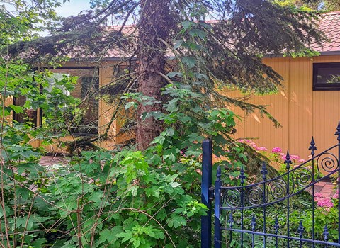 Outside there is a furnished patio with a parasol. The bungalow has stair gates and childproof sockets.