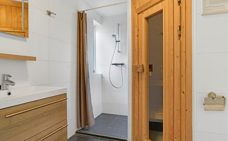 On the ground floor there are two bedrooms with two single beds each, and one bedroom has a soft-top mattress. One of the bathrooms has a shower cubicle, washbasin and toilet. This bathroom also has a private sauna. The other bathroom has a bath or shower cubicle, washbasin and toilet. The bungalow has a washing machine.