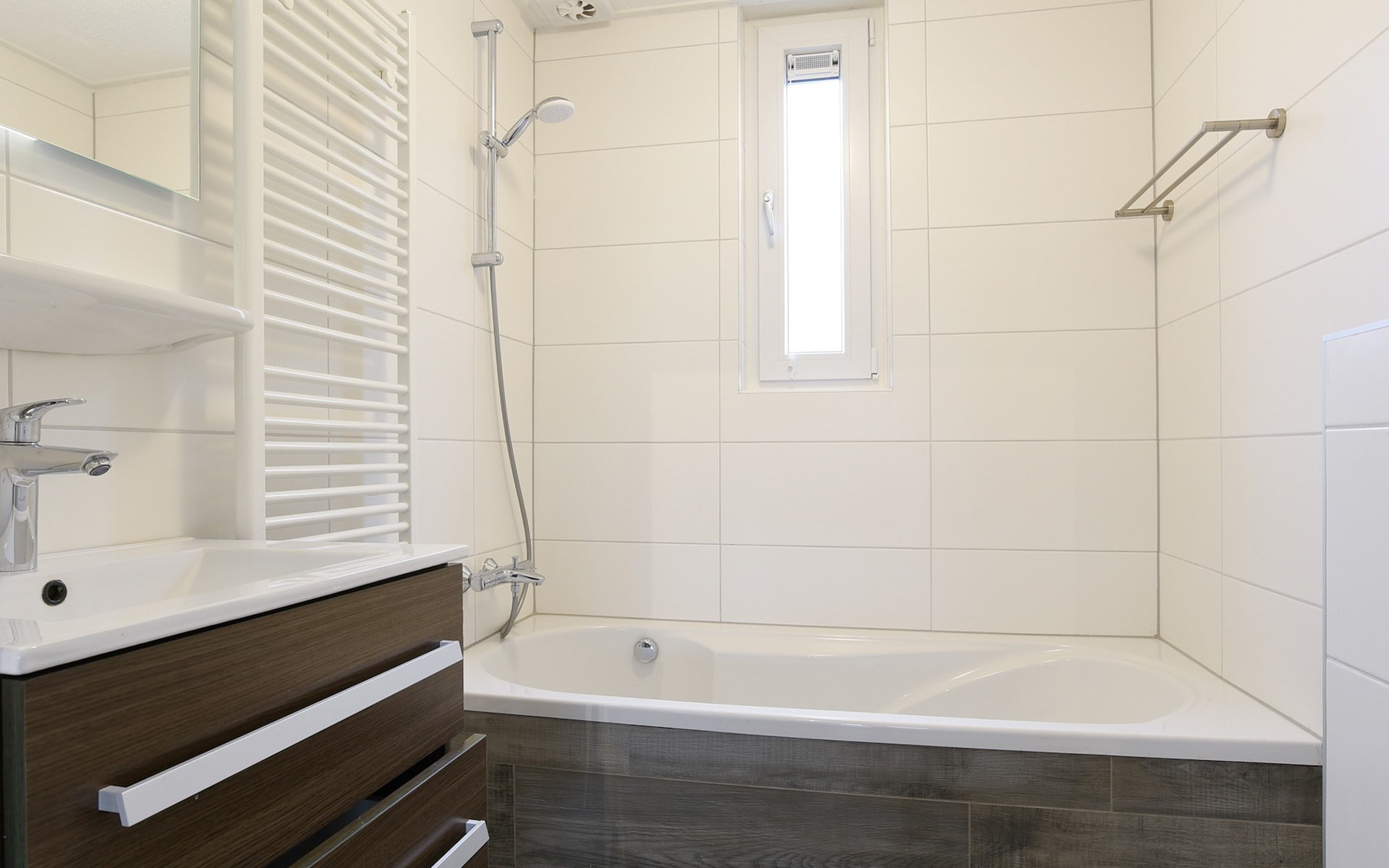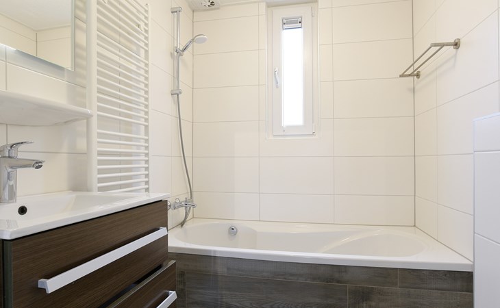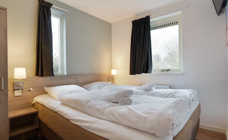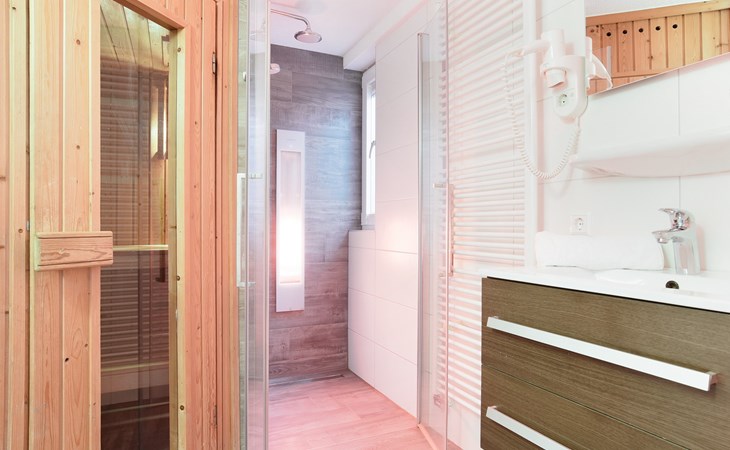 The bungalow has three bedrooms. One of the bedrooms has two single box spring beds with a soft topper and a television. The other two bedrooms each have two single beds. The beds are made upon arrival. There are two bathrooms, one of which has a rain shower, washbasin and toilet. This bathroom also has a private sauna. The other bathroom has a shower in a bathtub, washbasin and toilet. The bungalow has a washing machine and a dryer.