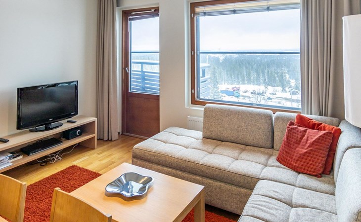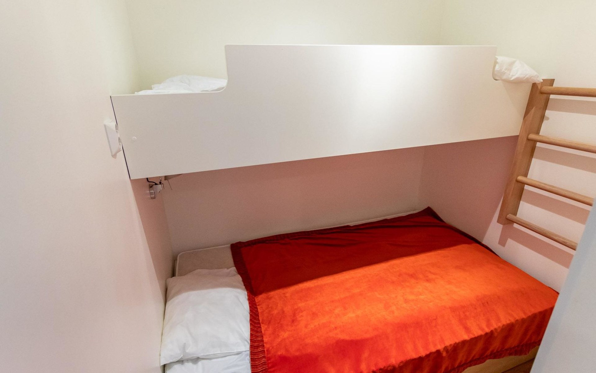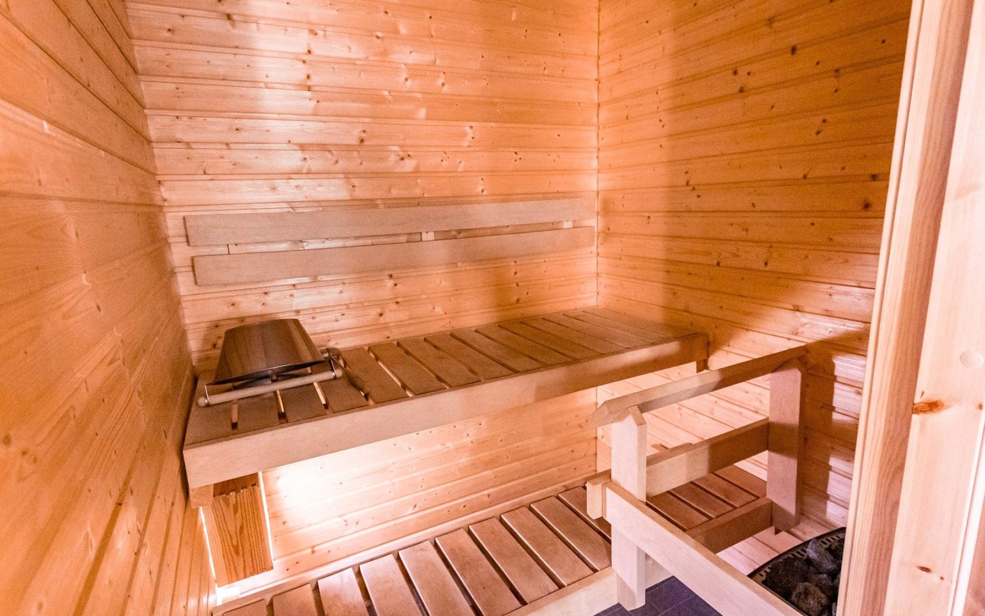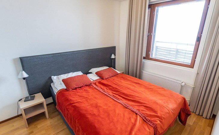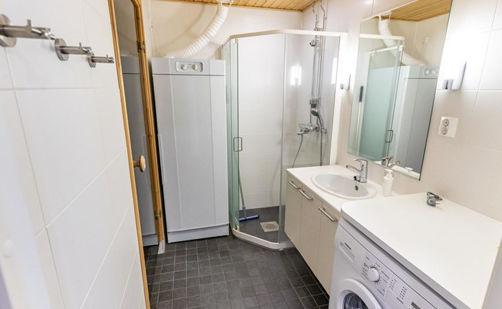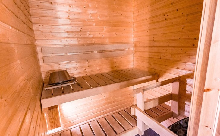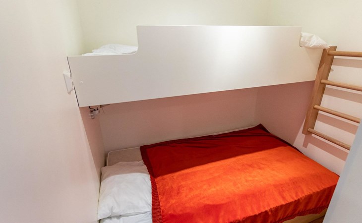 Livingroom/kitchen, one bedroom with two separate beds, one sleeping alcove with a bunk bed (top bed 80 cm wide, bottom bed 120 cm wide), convertible sofa which can be folded into a bed, electric sauna, washing room, separate toilet.