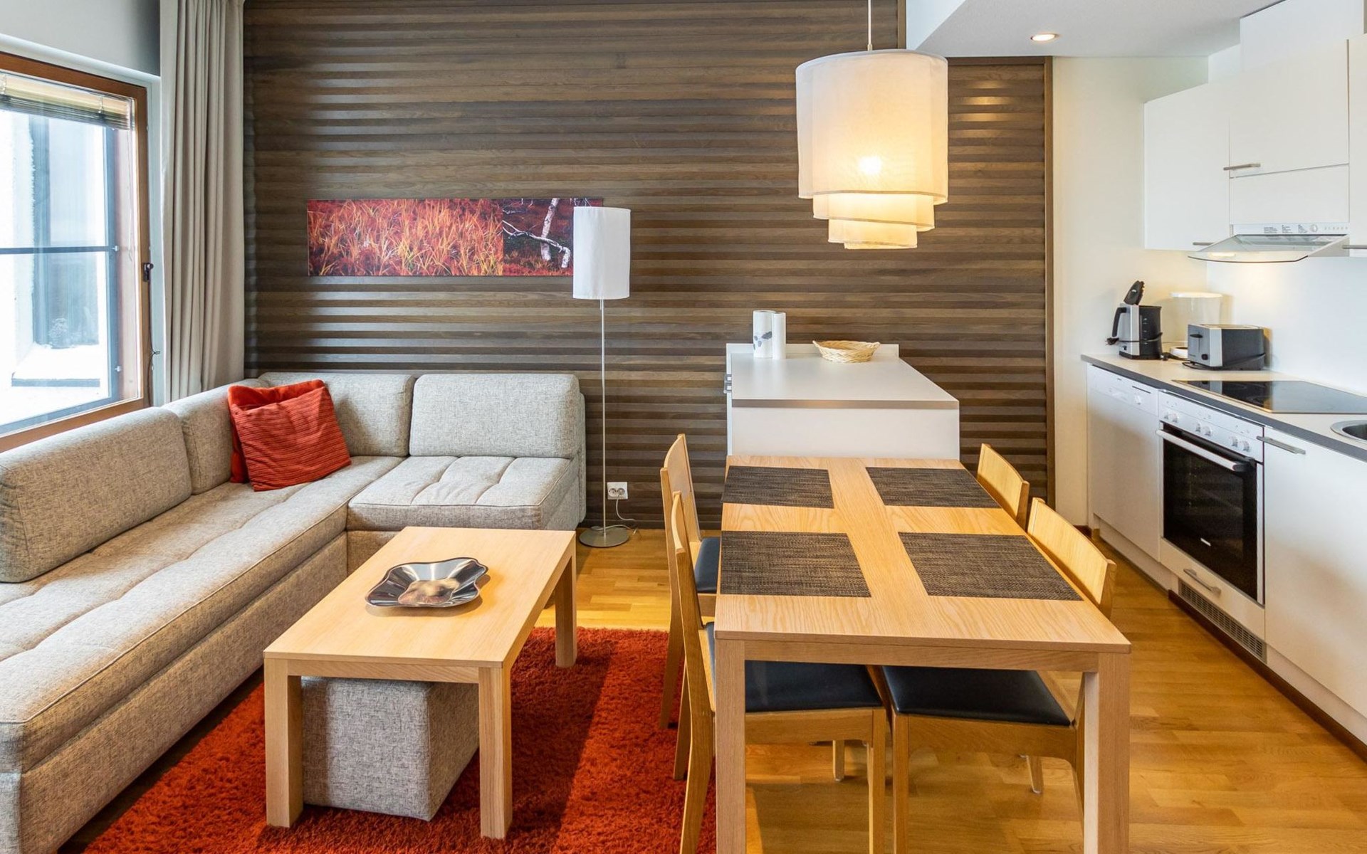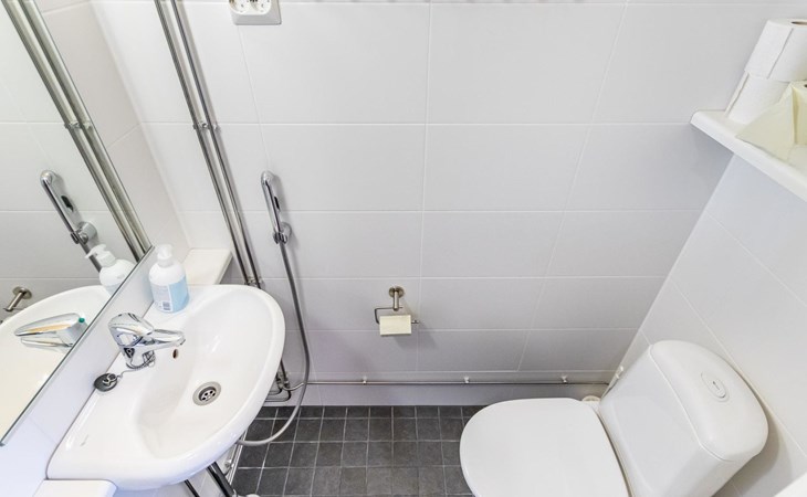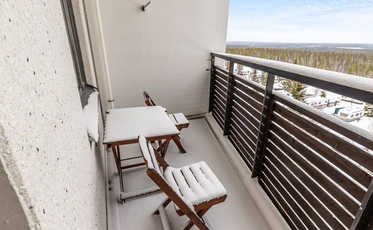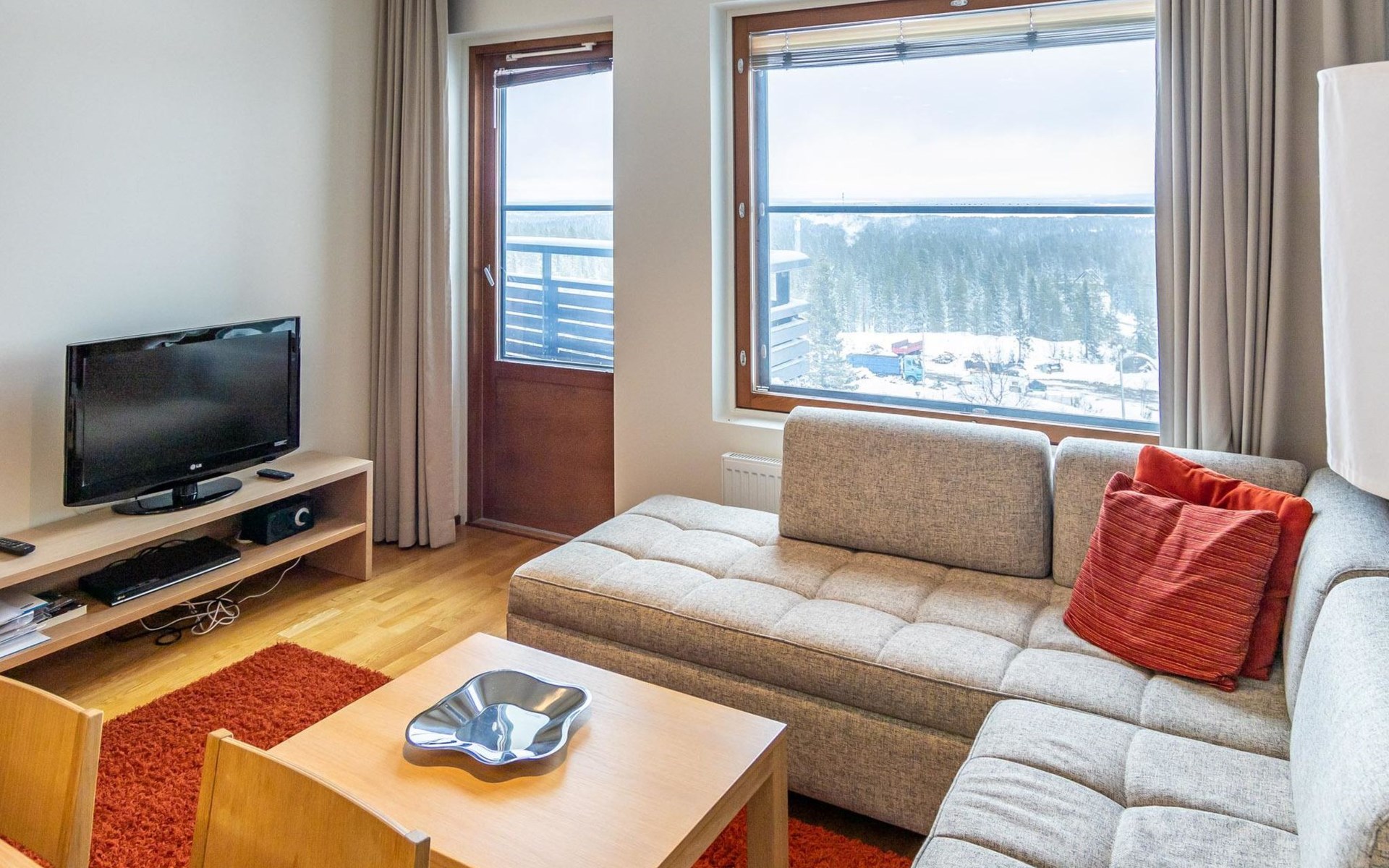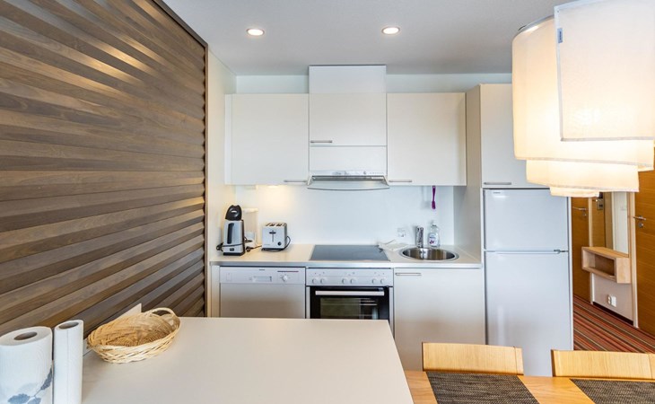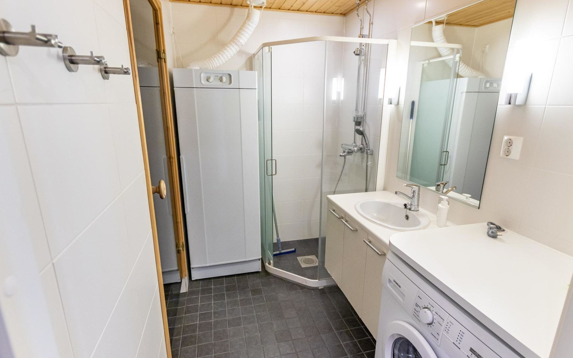 Livingroom/kitchen, one bedroom with two separate beds, one sleeping alcove with a bunk bed (top bed 80 cm wide, bottom bed 120 cm wide), convertible sofa which can be folded into a bed, electric sauna, washing room, separate toilet.