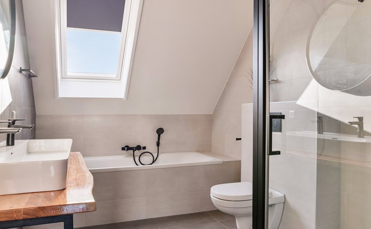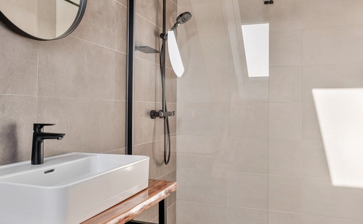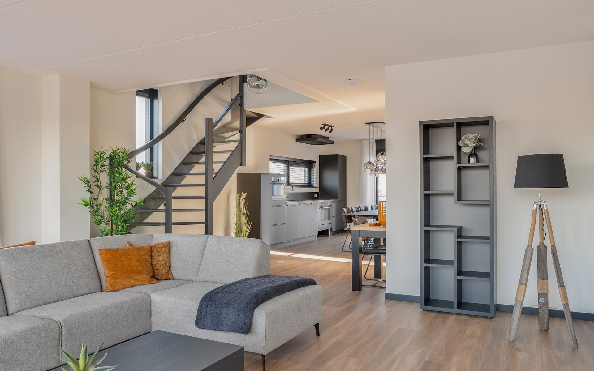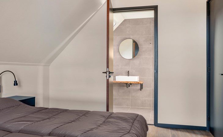 At Summio Waterpark Zwartkruis, the Watervilla Roerdomp Wellness Plus 10 is located at the inner harbour, and is suitable for up to 10 people. This spacious water villa with private sauna and outdoor hot tub has five bedrooms and four bathrooms, spread over two floors.