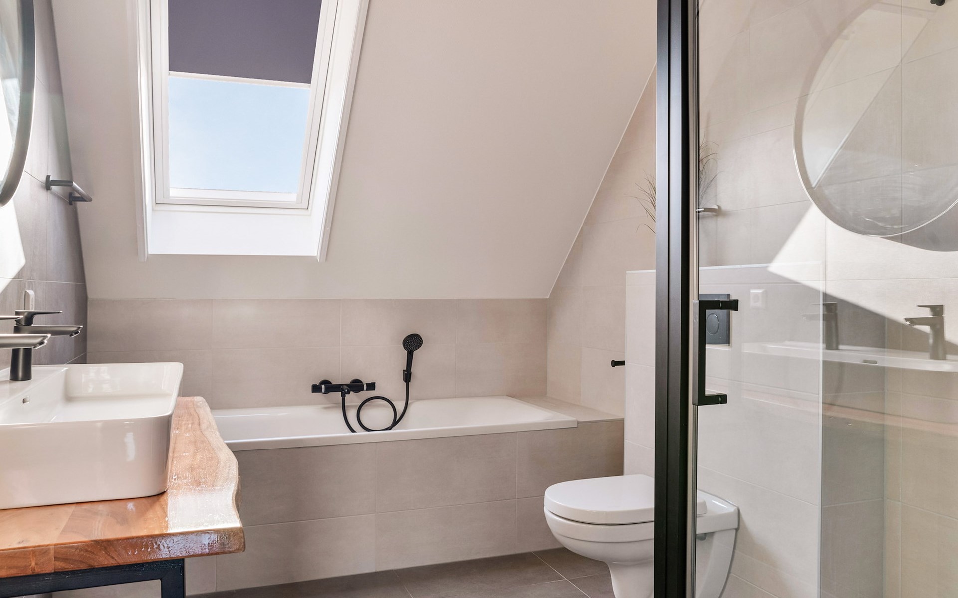 On the first floor you will find four bedrooms, each with two single box spring beds. Two bedrooms have an en-suite bathroom with a walk-in shower, double washbasin and a toilet. There is also another spacious bathroom with a bath, walk-in shower, double washbasin and a toilet. There is also a separate toilet on the first floor.