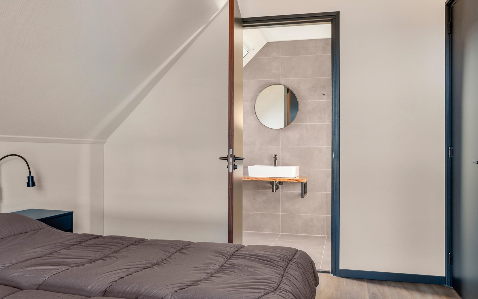 On the ground floor there is one bedroom with two single box spring beds and an en-suite bathroom with a walk-in shower, washbasin and a toilet. There is also a separate toilet on the ground floor.
