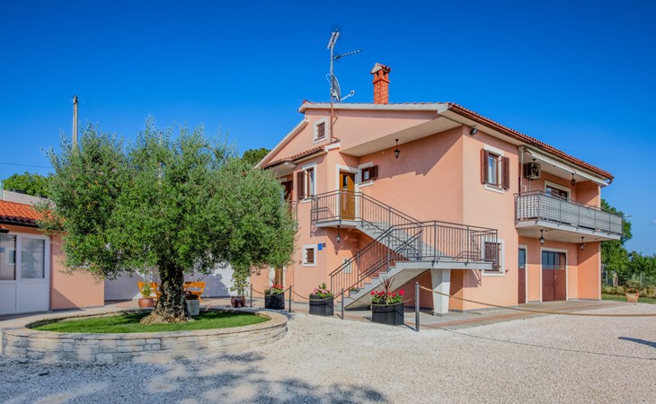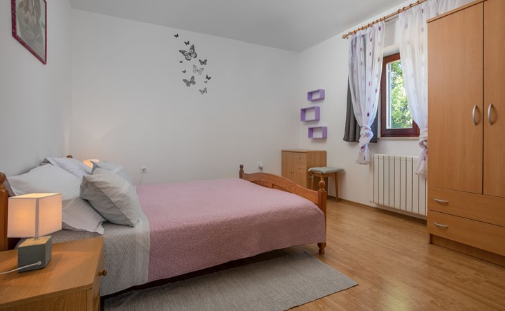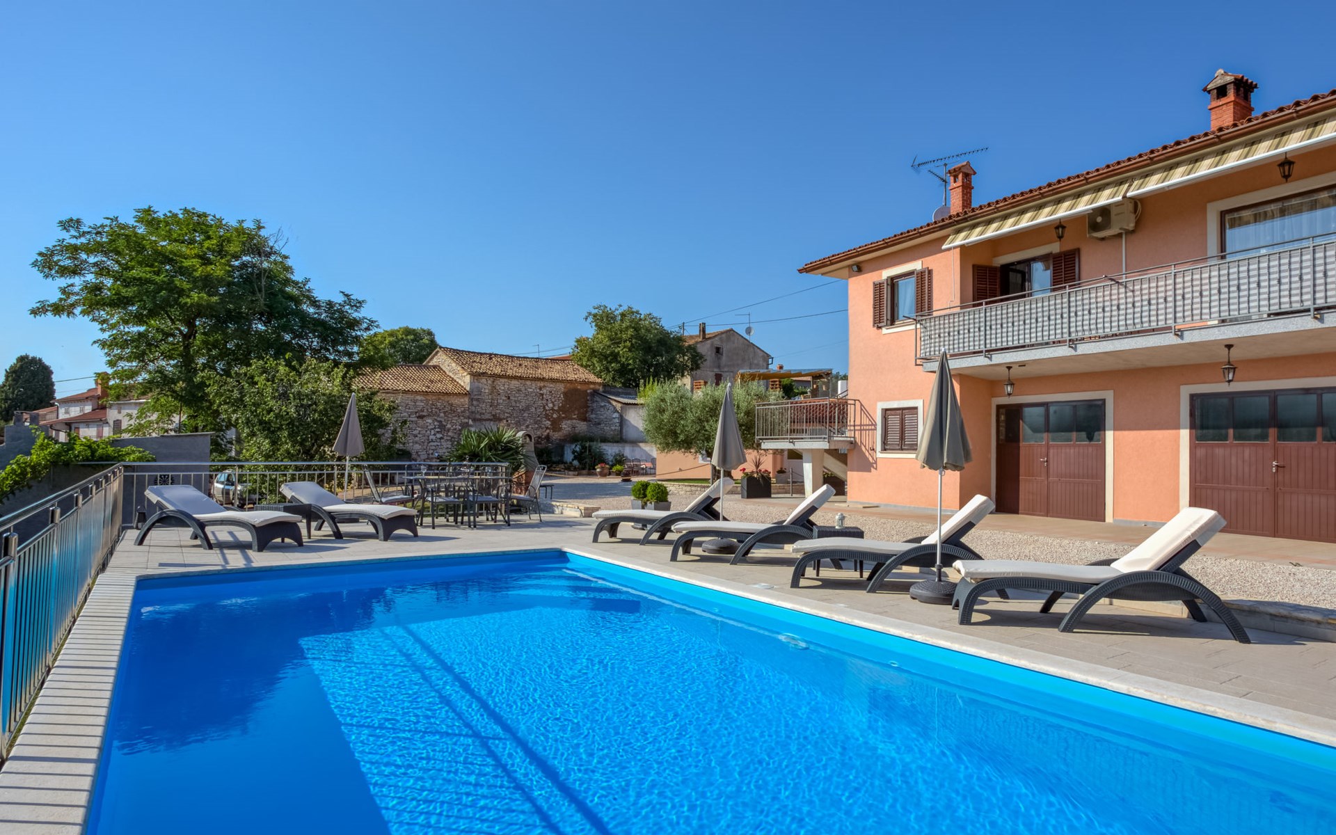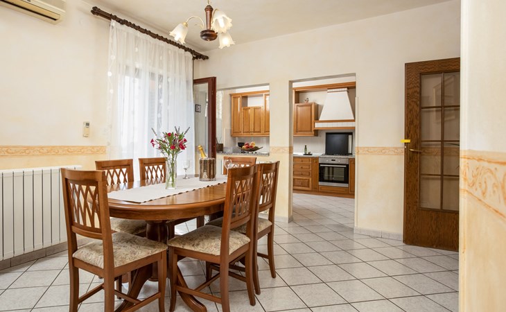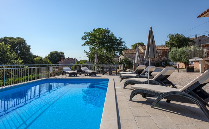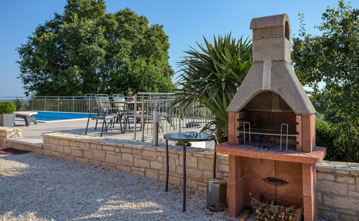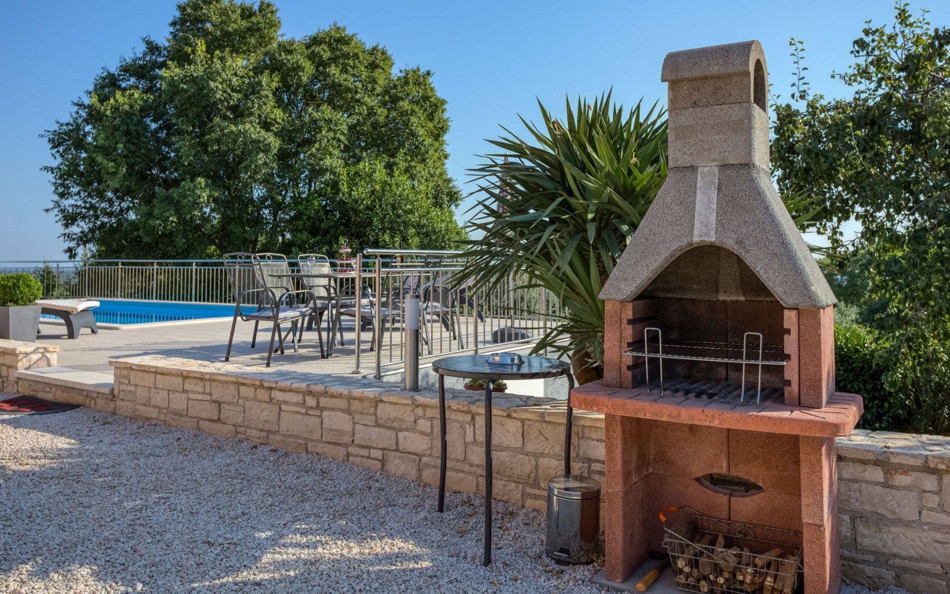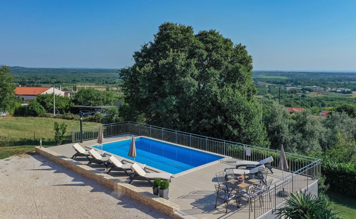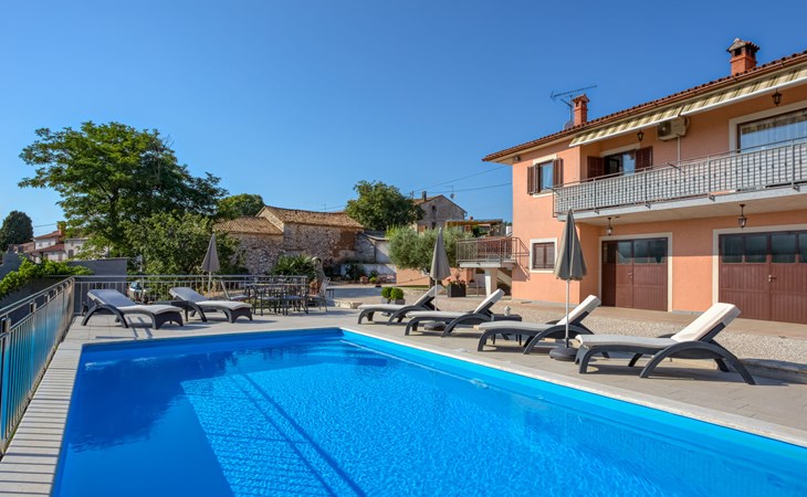 Kaštelir 11 km from Poreč: Single-family house "Legović". 1 km from the centre of Kaštelir, in a quiet, sunny position, 8 km from the sea. Private: property 2'000 m2 (fenced), garden with lawn and wildlife garden, swimming pool angular (8 x 4 m, depth 140 cm, seasonal availability: 01.May. - 05.Oct.) with internal staircase. Outdoor shower, terrace (20 m2), garden furniture, barbecue. In the house: internet access, washing machine. Parking (for 4 cars) at the house on the premises. Shop 200 m, supermarket 11 km, restaurant 200 m, bus stop 5.6 km, pebble beach 8 km, rocky beach 8 km. Riding stable 5 km, walking paths from the house 500 m, cycle lane 550 m. Nearby attractions: aquapark 15 km. Youth groups are not allowed. Ground floor is closed and not occupied.