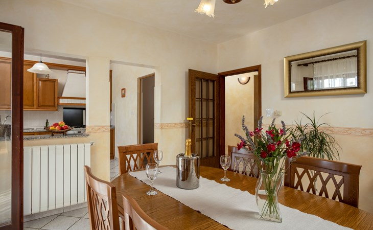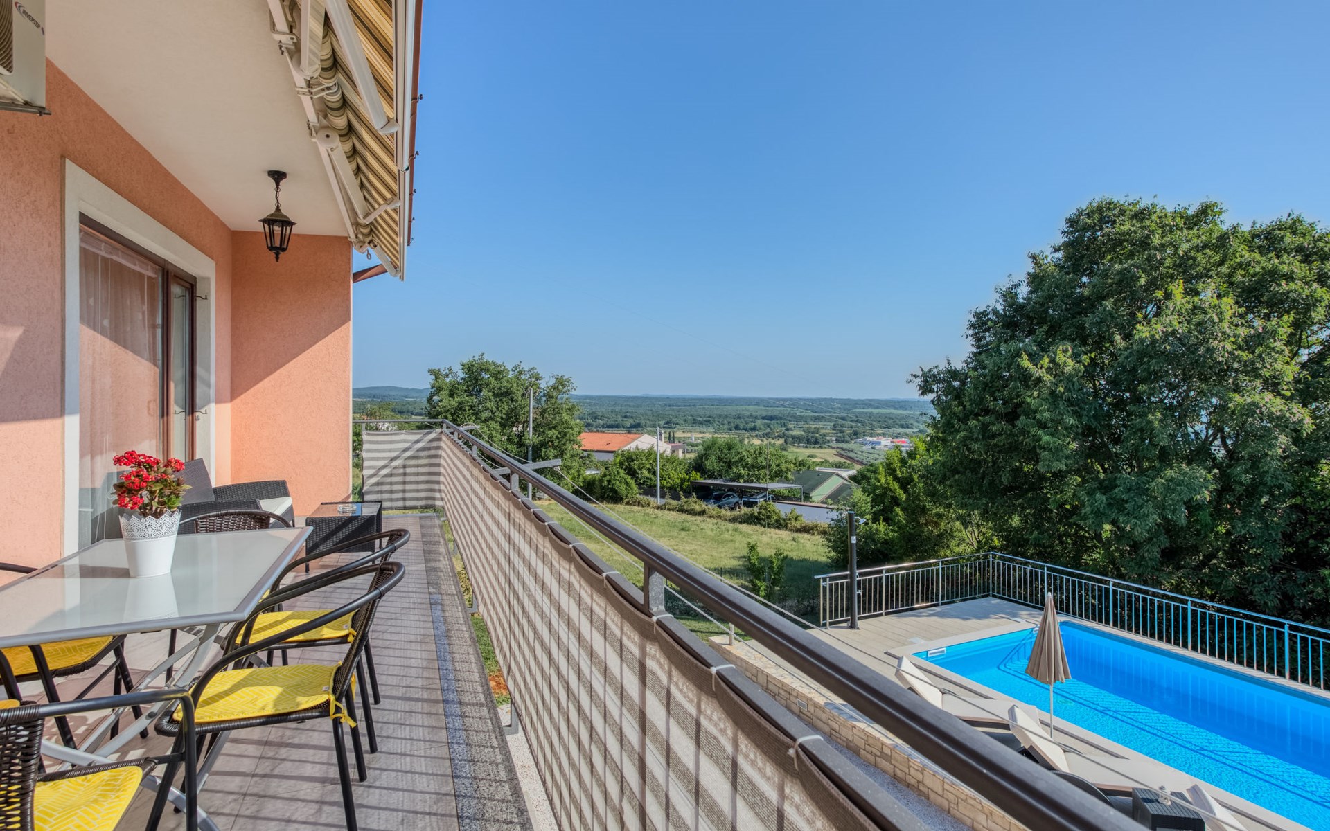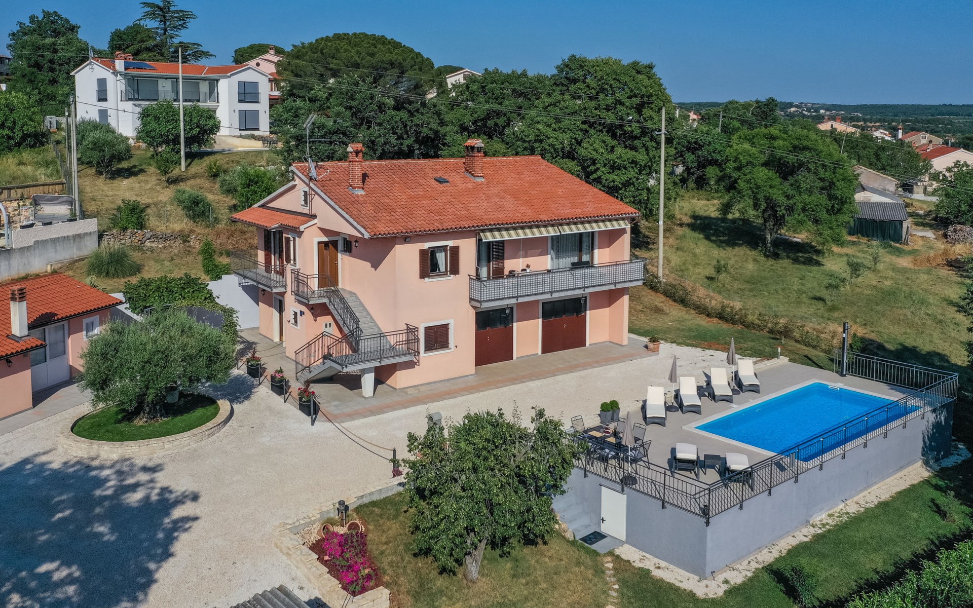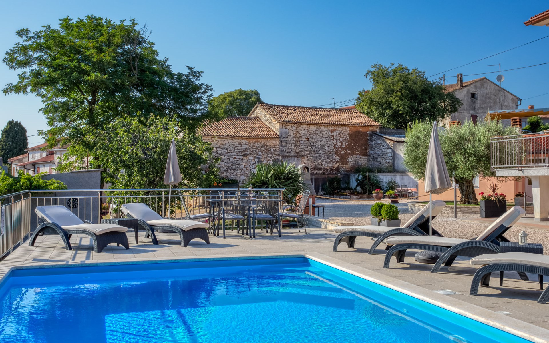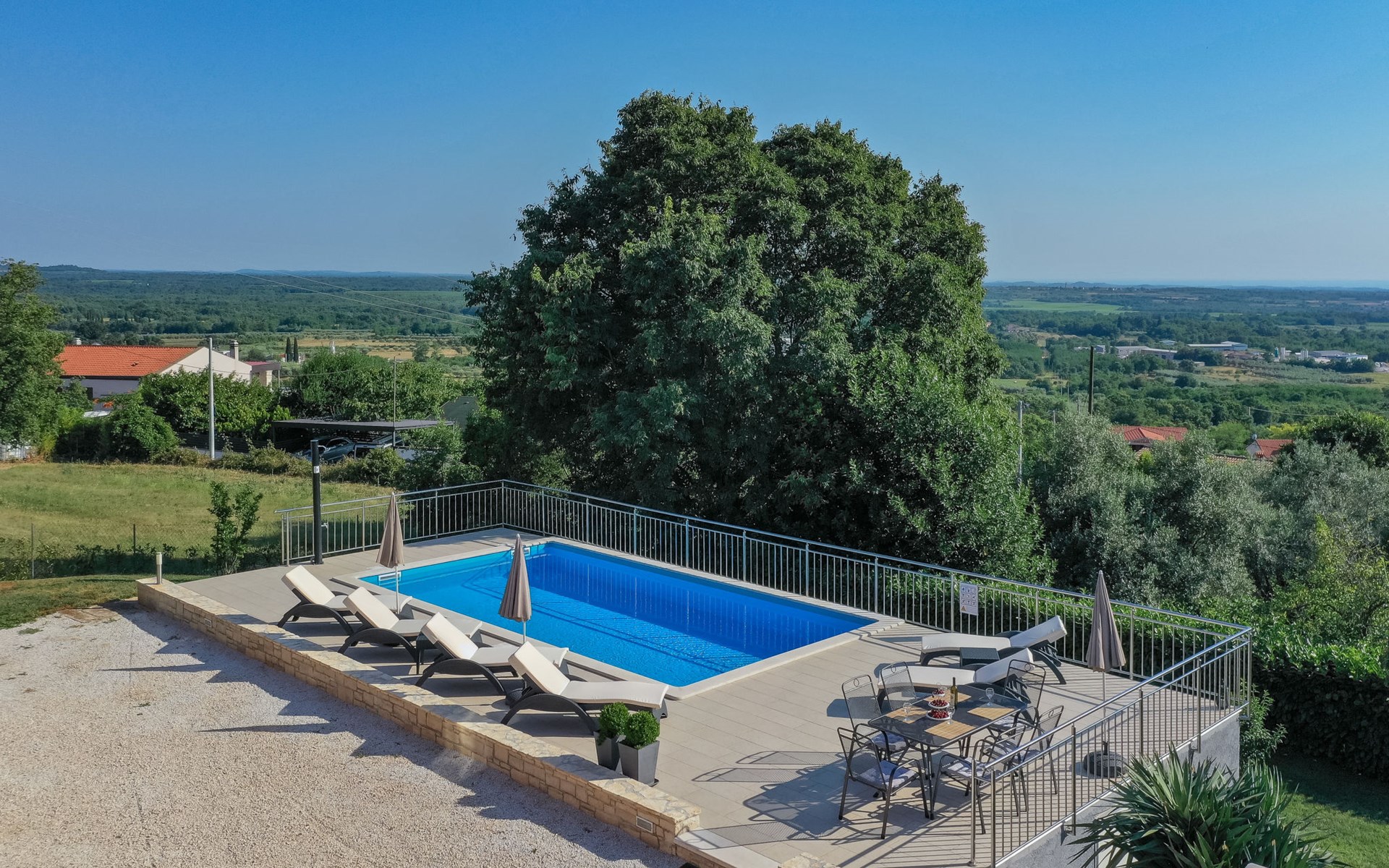 Kaštelir 11 km from Poreč: Single-family house "Legović". 1 km from the centre of Kaštelir, in a quiet, sunny position, 8 km from the sea. Private: property 2'000 m2 (fenced), garden with lawn and wildlife garden, swimming pool angular (8 x 4 m, depth 140 cm, seasonal availability: 01.May. - 05.Oct.) with internal staircase. Outdoor shower, terrace (20 m2), garden furniture, barbecue. In the house: internet access, washing machine. Parking (for 4 cars) at the house on the premises. Shop 200 m, supermarket 11 km, restaurant 200 m, bus stop 5.6 km, pebble beach 8 km, rocky beach 8 km. Riding stable 5 km, walking paths from the house 500 m, cycle lane 550 m. Nearby attractions: aquapark 15 km. Youth groups are not allowed. Ground floor is closed and not occupied.