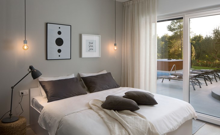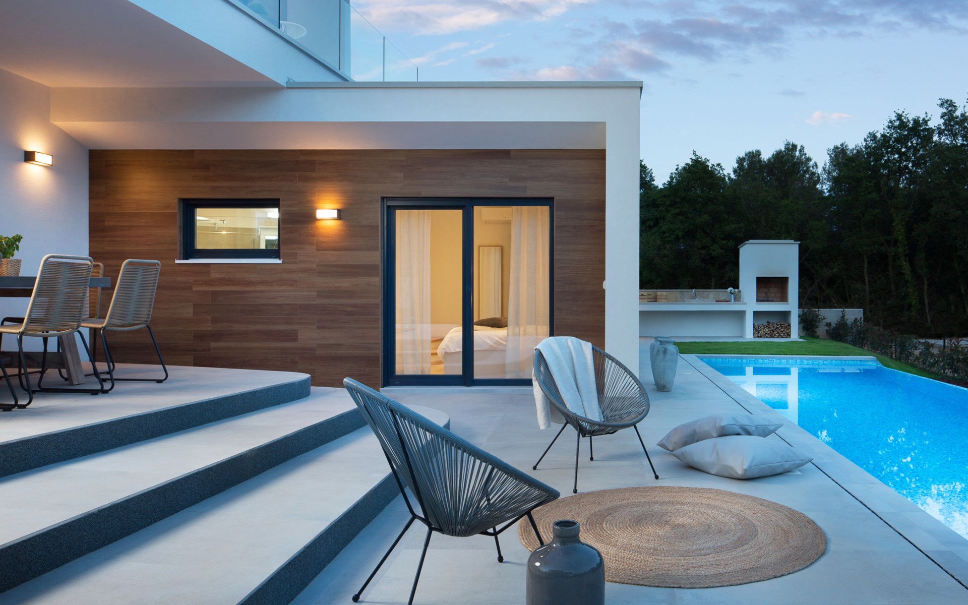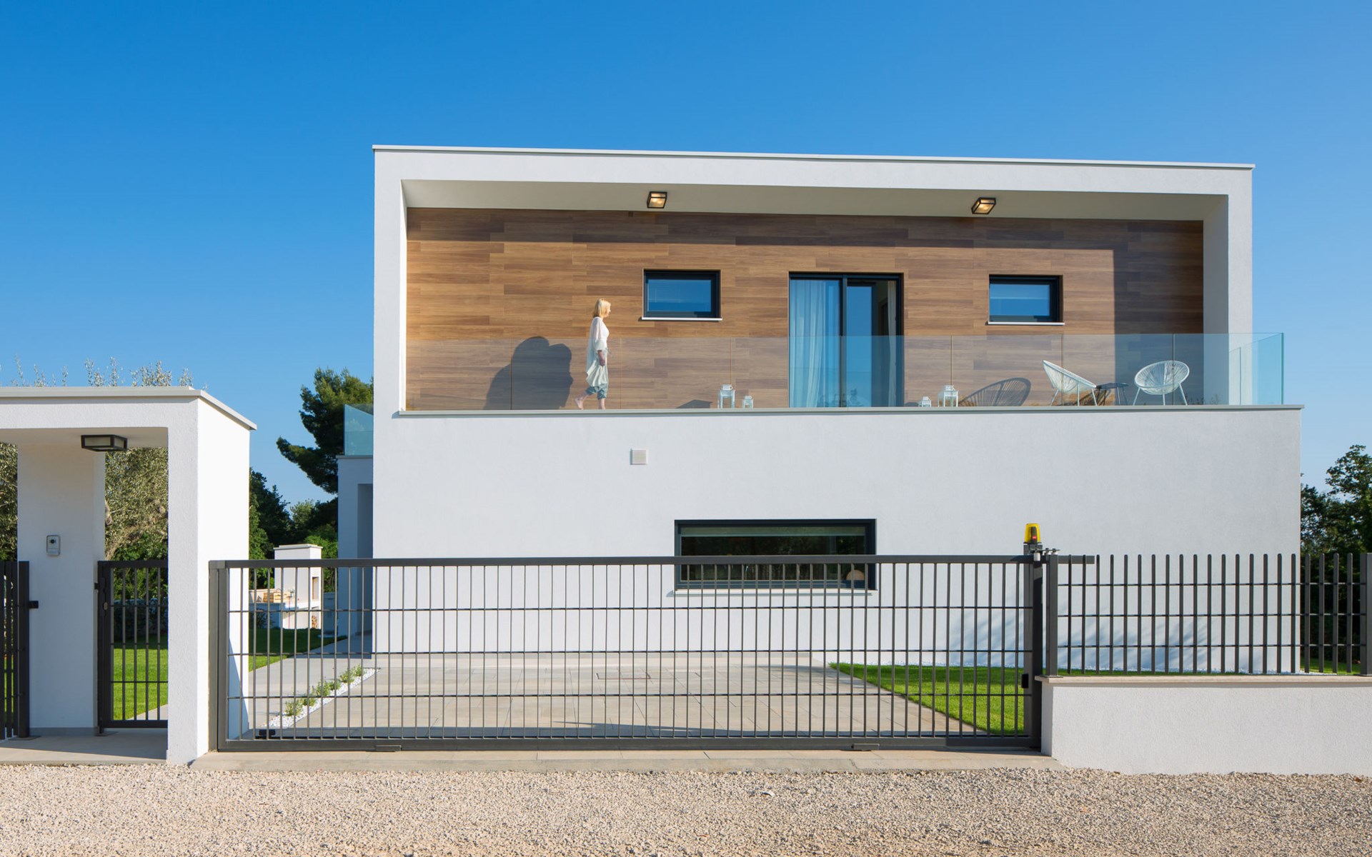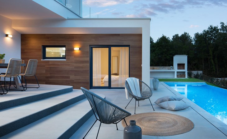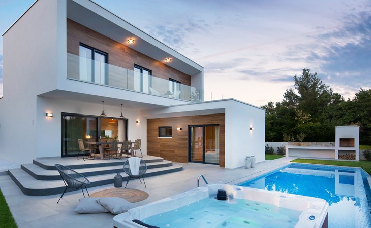 Tar 7 km from Poreč: Modern villa "Santa Marina", 2 storeys. In the hamlet Vabriga 1 km from the centre of Tar, in a sunny position, 2 km from the sea, 2 km from the beach. Private: property 650 m2 (fenced), beautiful garden with lawn, swimming pool angular (14 x 3 m, depth 140 cm, seasonal availability: 01.Apr. - 30.Oct.) with internal staircase. Outdoor shower, hot tub, barbecue. In the house: internet access, washing machine. Motor access to the house (300 m via unmade road). Parking (for 2 cars) at the house on the premises. Shop 500 m, restaurant 200 m, bus stop 8 km, railway station 38 km, pebble beach 2 km, rocky beach 2 km. Walking paths from the house 100 m, cycle lane 150 m. The owner does not accept any youth groups.