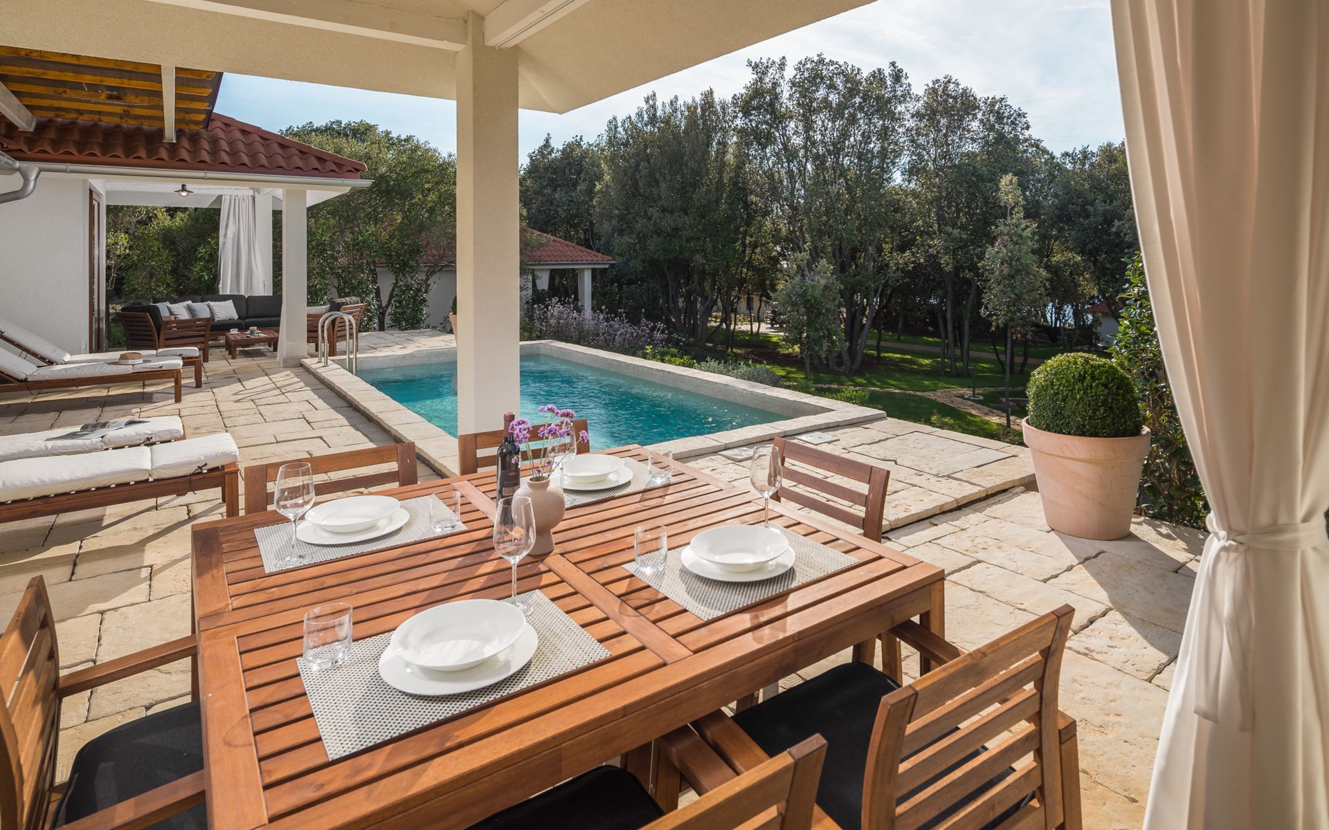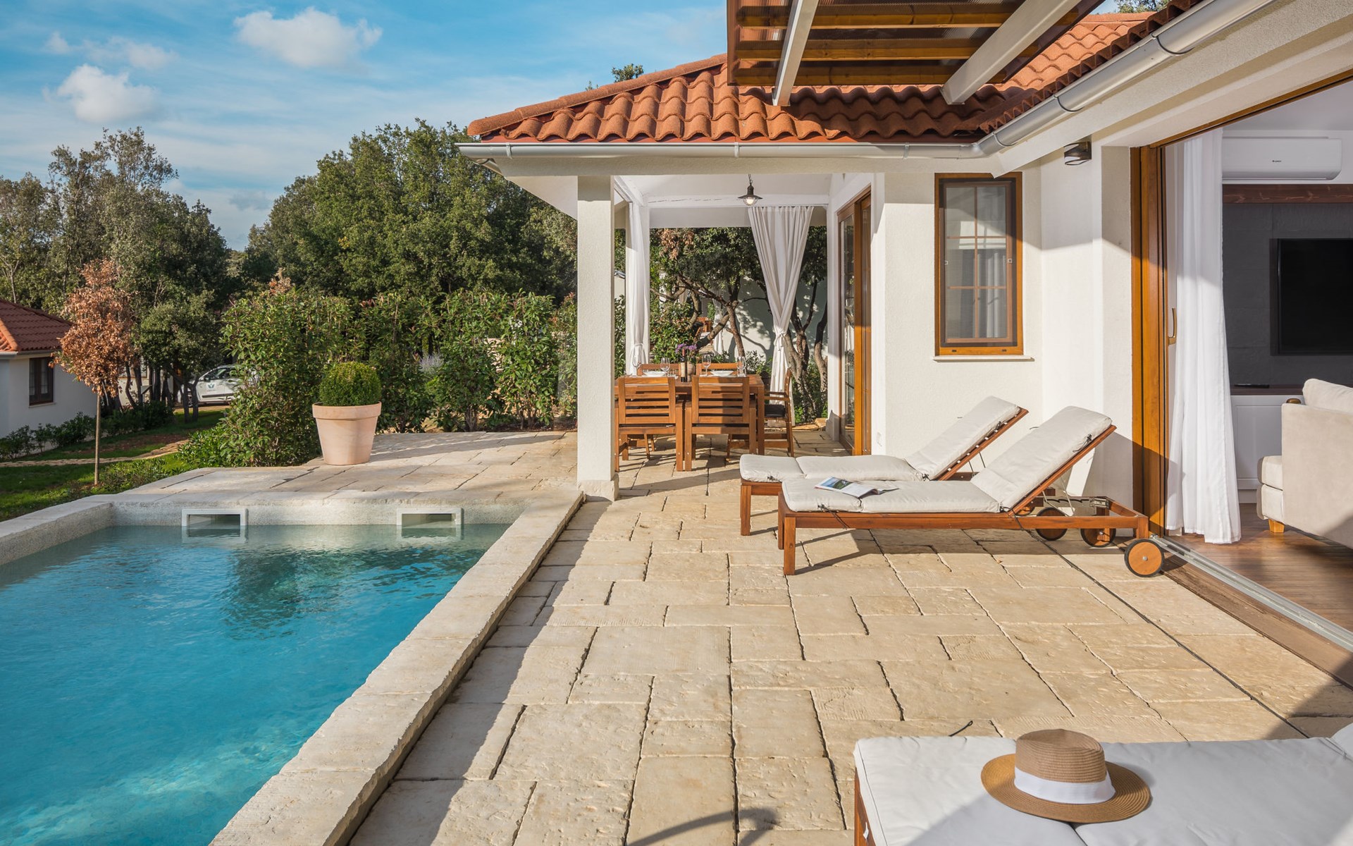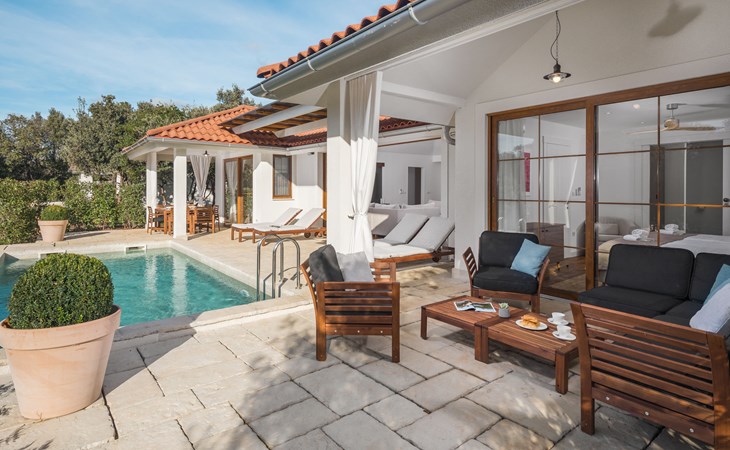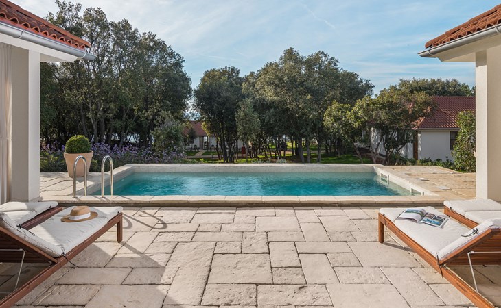 Child friendly resort "Mon Perin". 6 km from the centre of Bale, 17 km from the centre of Rovinj, in a quiet, sunny position, at the seaside, on the beach. For shared use: property with trees, swimming pool (400 m2, depth 45 - 135 cm, seasonal availability: 30.May. - 21.Sep.). Children's pool, tennis, basketball, boccia, beach volleyball, children's playground, pool maintenance by the owner/gardener. Private: property 1'000 m2 with lawn and trees, swimming pool angular, heated (6 x 3 m, depth 135 cm, seasonal availability: 18.May. - 21.Sep.) with internal staircase. Terrace, pool maintenance by the owner/gardener. In the complex: restaurant, bar, internet access, sauna, hot tub, infrared sauna, relaxation room, spa area for shared use hamam, table football, shopping facilities, laundry (for shared use, extra), bicycle rental. Parking at the house on the premises. E-charging station. Bus stop 4.2 km, pebble beach "Mon Perin", rocky beach "Mon Perin". Riding stable 500 m, walking paths from the house 100 m, cycle lane 150 m. Please note: entertainment. The camp has 1 additional paddling pool (90 m2, depth 60 cm, open from 01.06.-03.10.). Wellness and spa with indoor pool is for use only by adults over 18 years old.