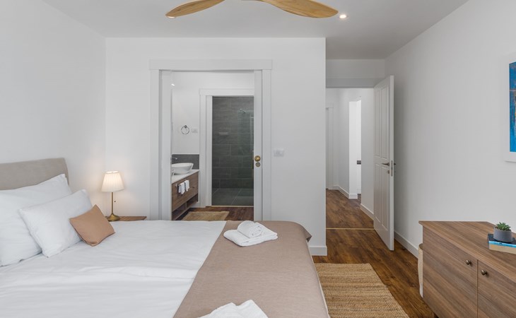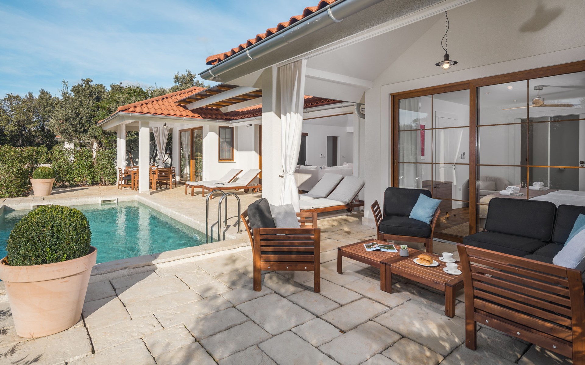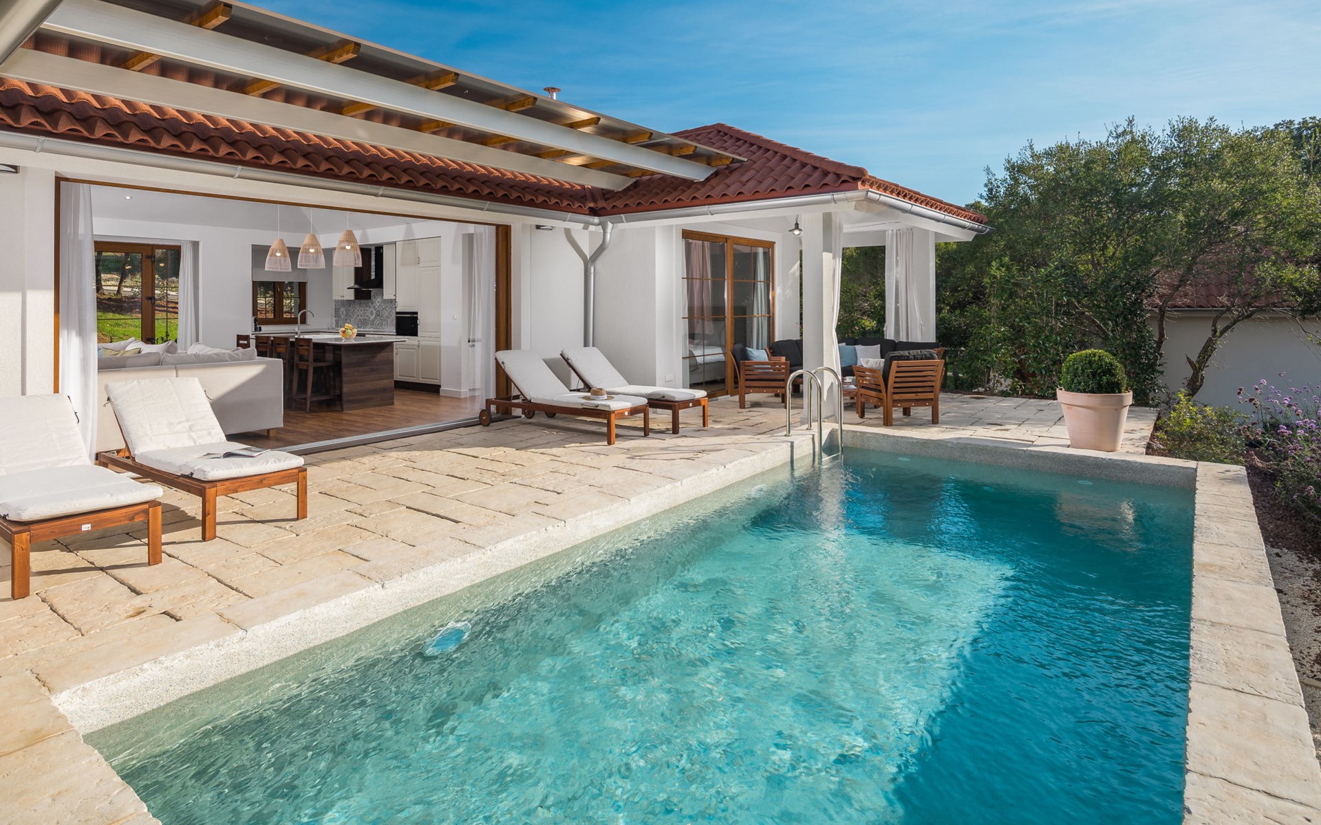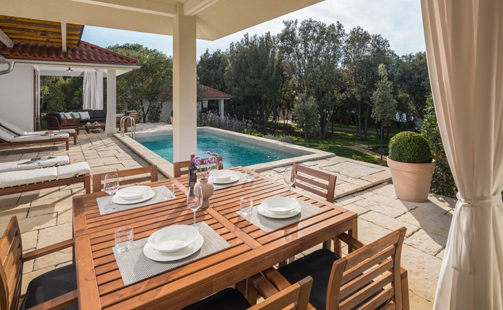 Child friendly resort "Mon Perin". 6 km from the centre of Bale, 17 km from the centre of Rovinj, in a quiet, sunny position, at the seaside, on the beach. For shared use: property with trees, swimming pool (400 m2, depth 45 - 135 cm, seasonal availability: 30.May. - 21.Sep.). Children's pool, tennis, basketball, boccia, beach volleyball, children's playground, pool maintenance by the owner/gardener. Private: property 1'000 m2 with lawn and trees, swimming pool angular, heated (6 x 3 m, depth 135 cm, seasonal availability: 18.May. - 21.Sep.) with internal staircase. Terrace, pool maintenance by the owner/gardener. In the complex: restaurant, bar, internet access, sauna, hot tub, infrared sauna, relaxation room, spa area for shared use hamam, table football, shopping facilities, laundry (for shared use, extra), bicycle rental. Parking at the house on the premises. E-charging station. Bus stop 4.2 km, pebble beach "Mon Perin", rocky beach "Mon Perin". Riding stable 500 m, walking paths from the house 100 m, cycle lane 150 m. Please note: entertainment. The camp has 1 additional paddling pool (90 m2, depth 60 cm, open from 01.06.-03.10.). Wellness and spa with indoor pool is for use only by adults over 18 years old.