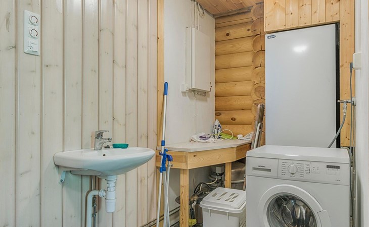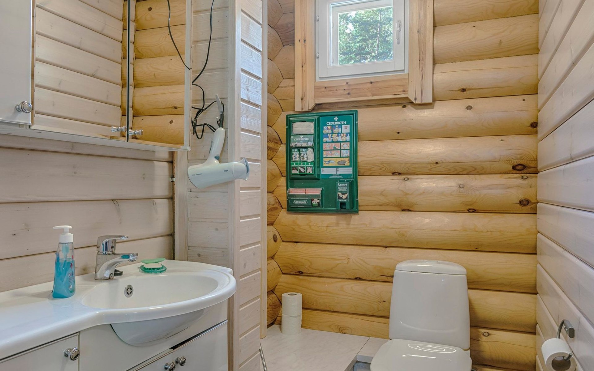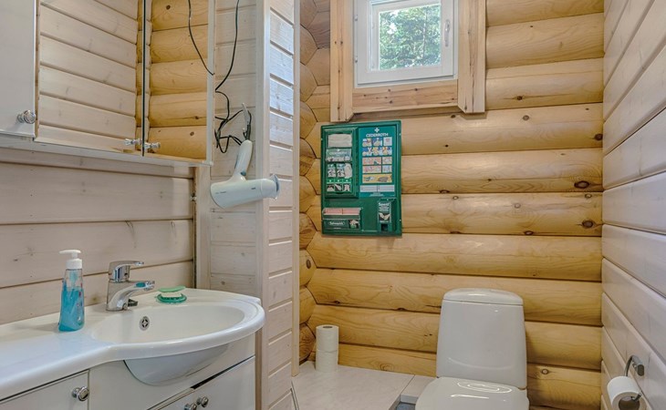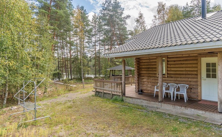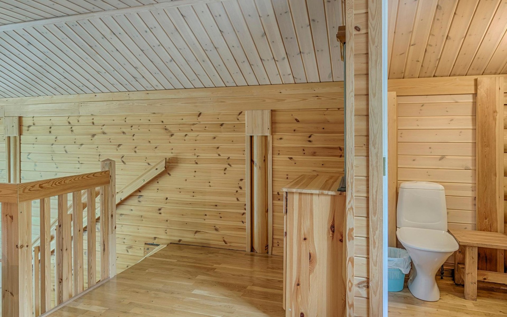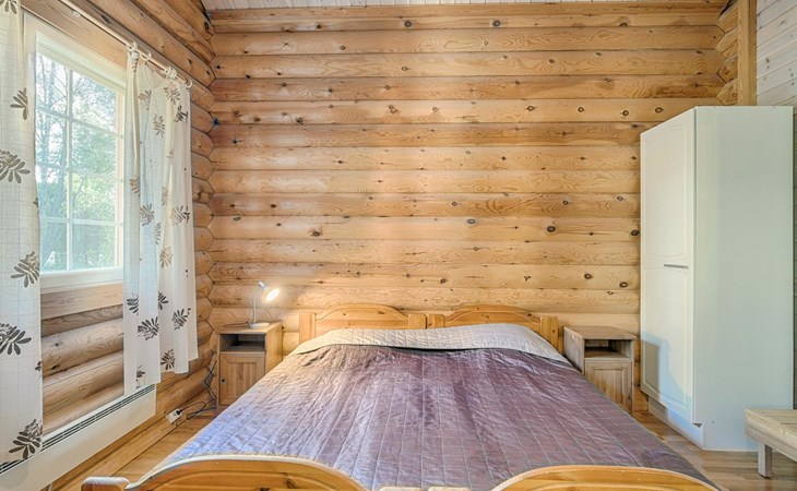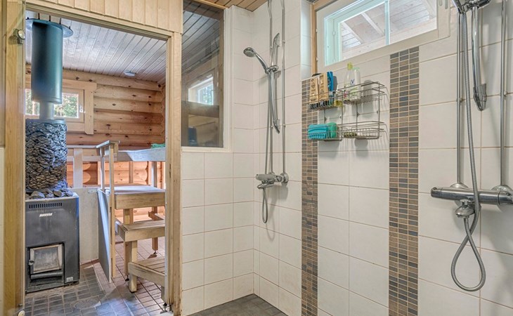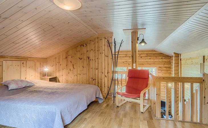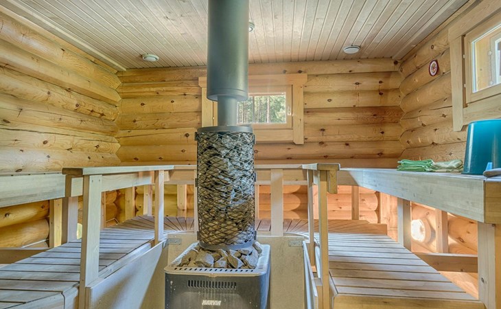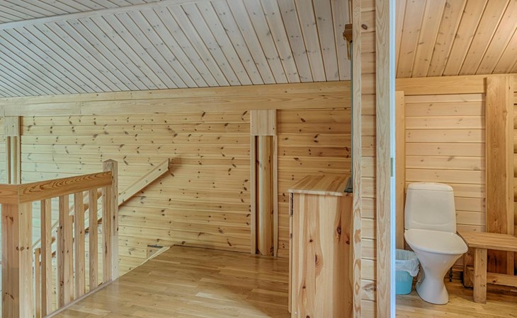 Round-log cottage 2008, living room/kitchen heat-storing fireplace. Downstairs: bedroom 2 beds, bedroom 2 beds. Upstairs: sleeping loft 2 beds, hall and open porch. Sauna in the same building, dressing room, washroom, sauna has underfloor heating and 2 showers. Toilet dowstairs and upstairs.