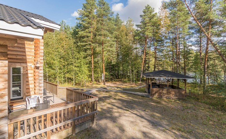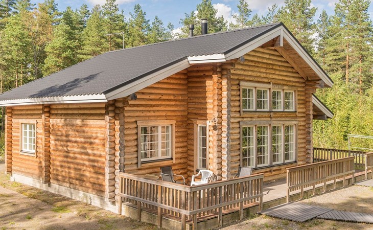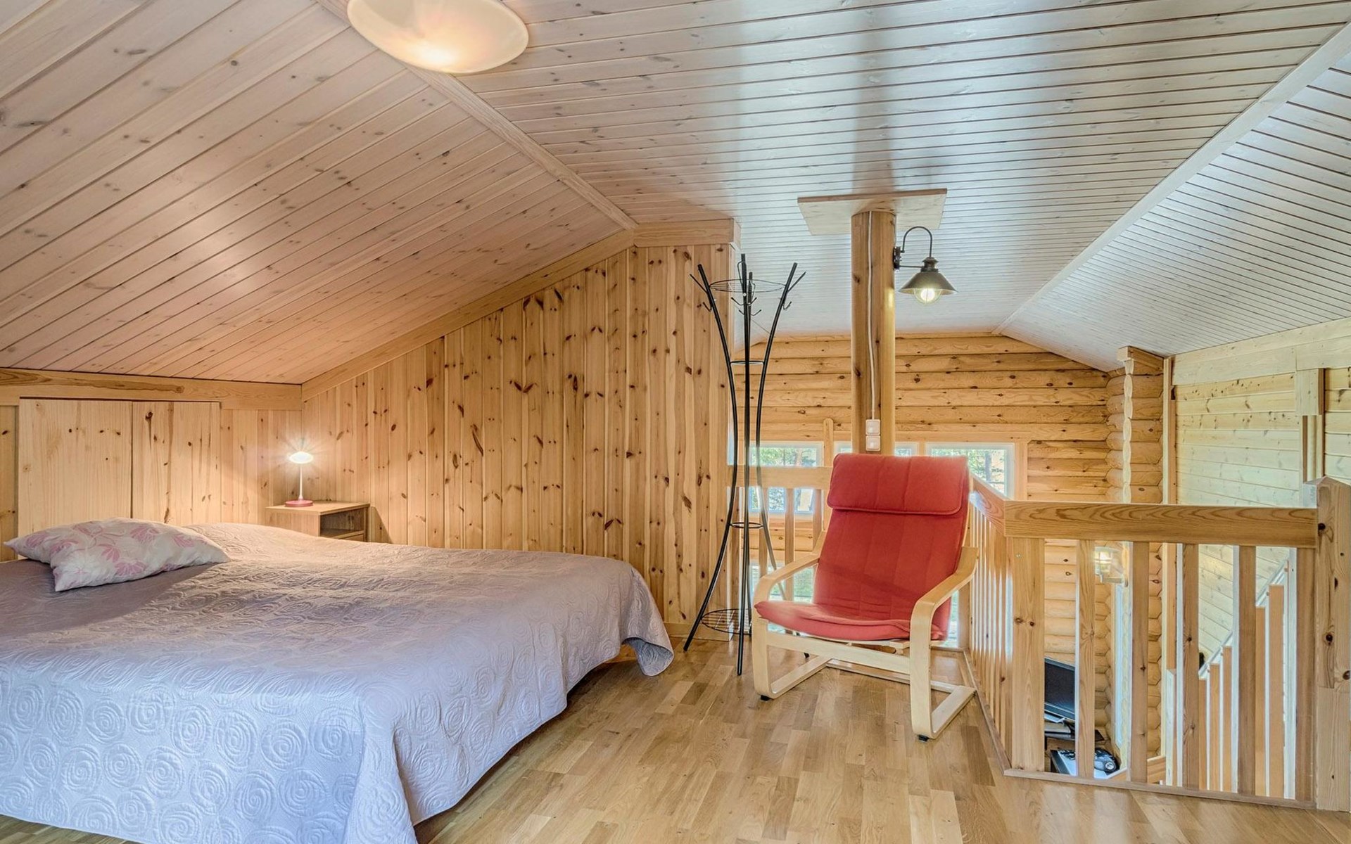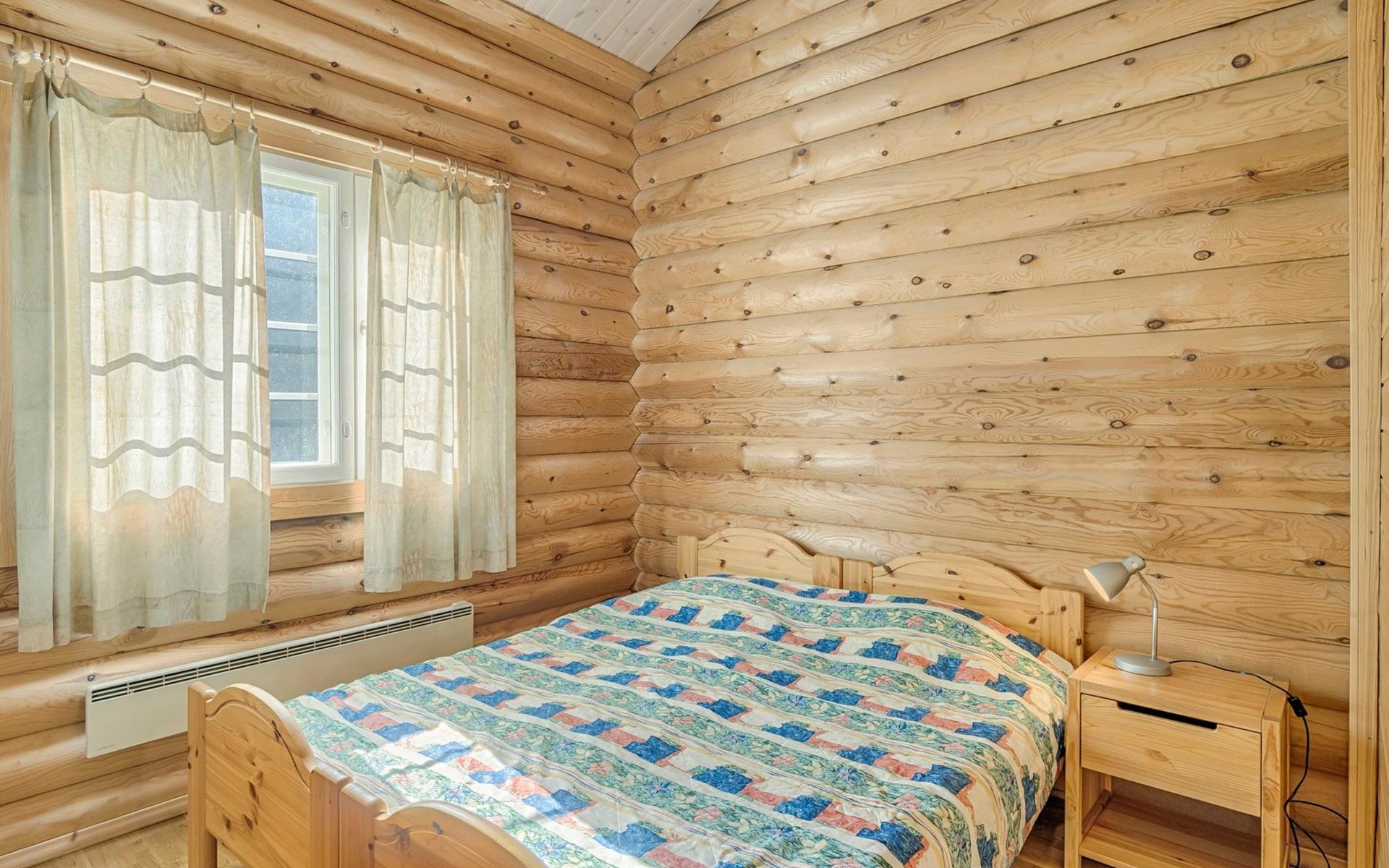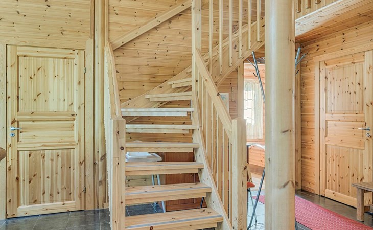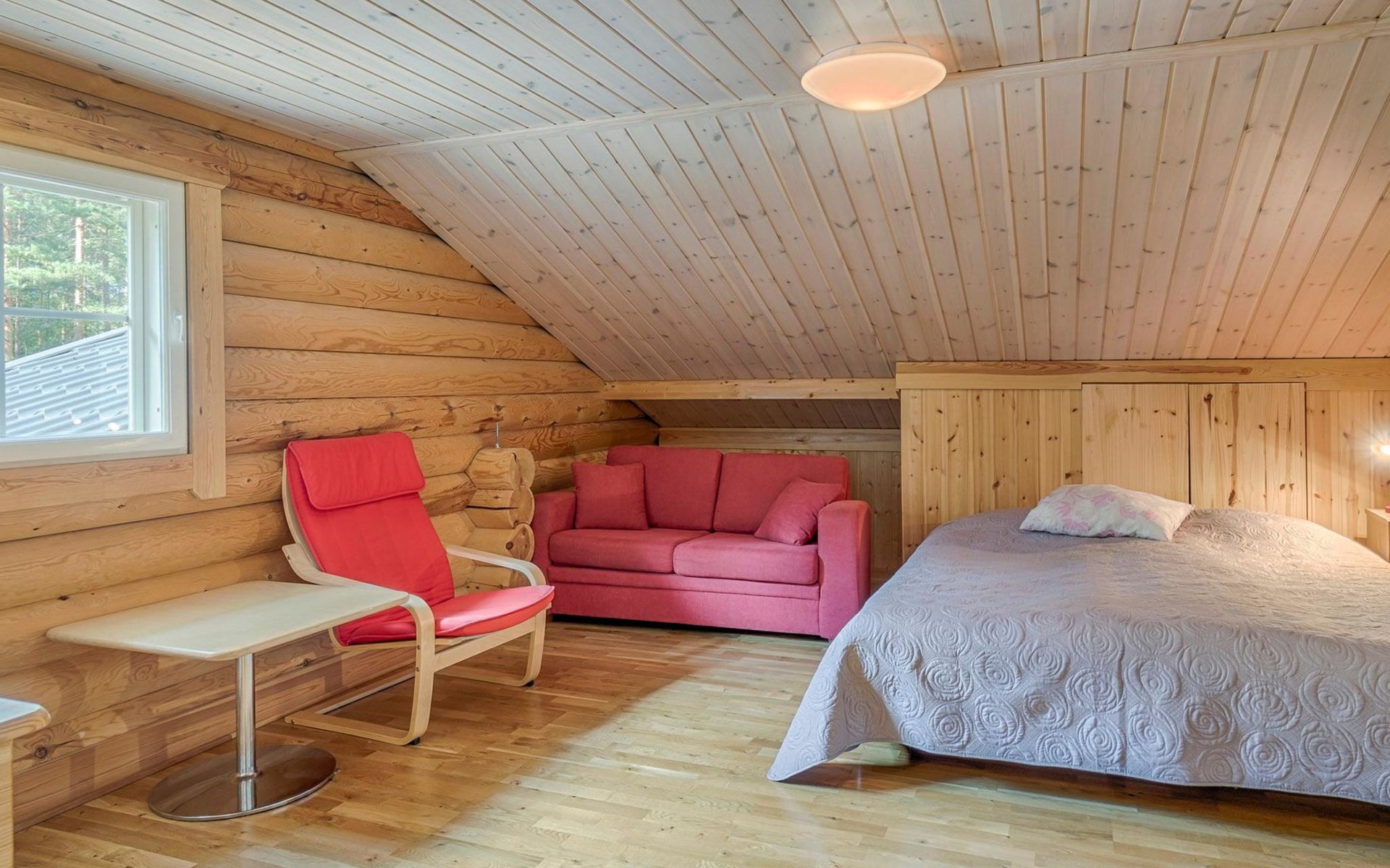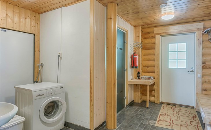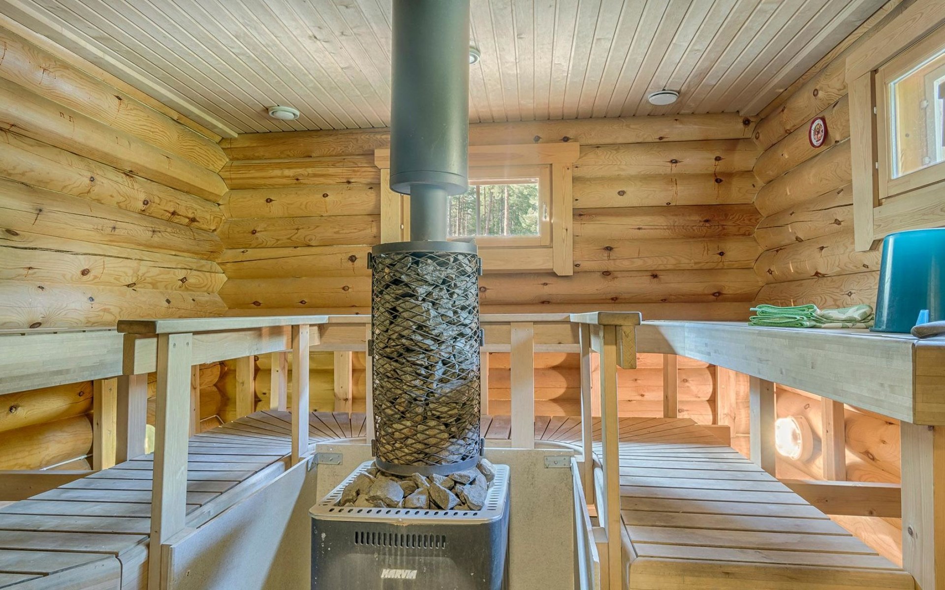 Round-log cottage 2008, living room/kitchen heat-storing fireplace. Downstairs: bedroom 2 beds, bedroom 2 beds. Upstairs: sleeping loft 2 beds, hall and open porch. Sauna in the same building, dressing room, washroom, sauna has underfloor heating and 2 showers. Toilet dowstairs and upstairs.