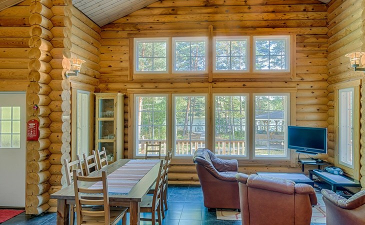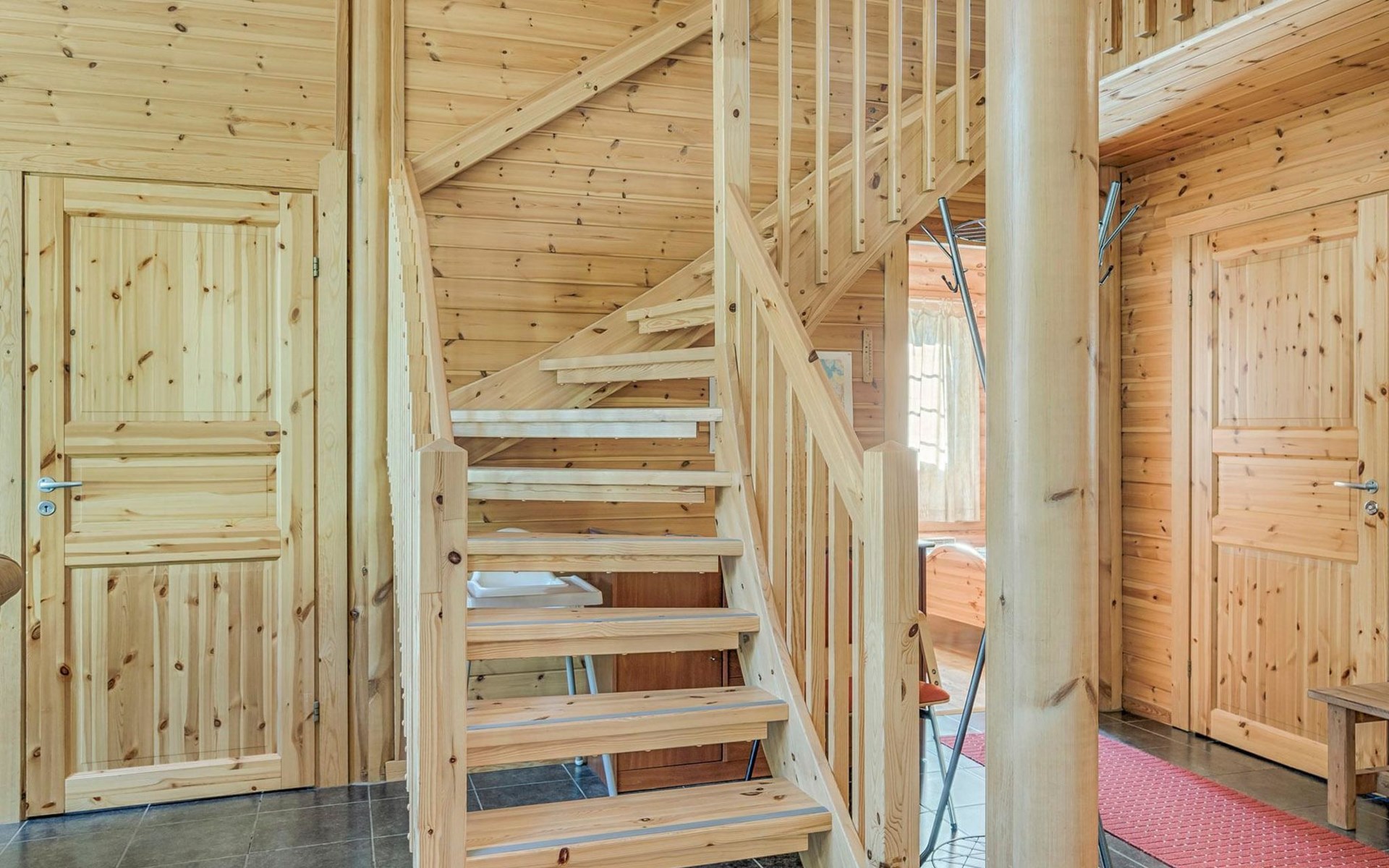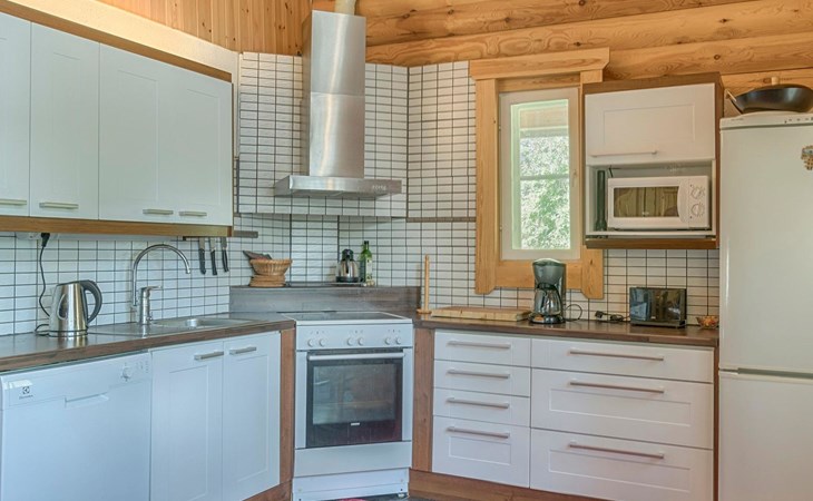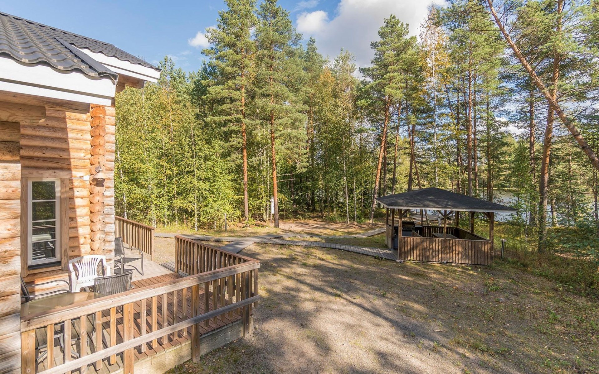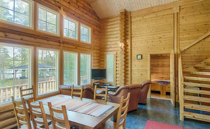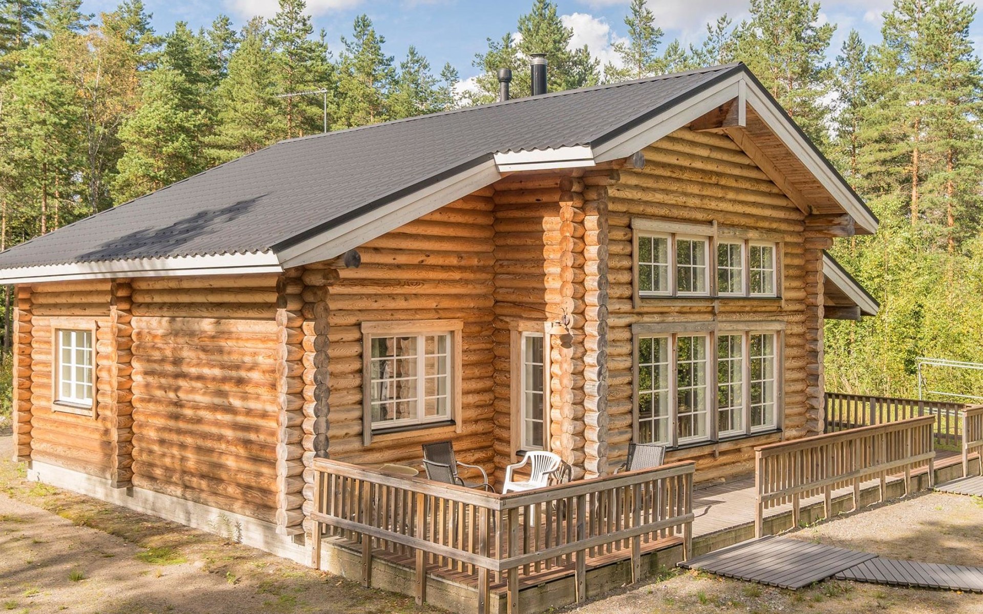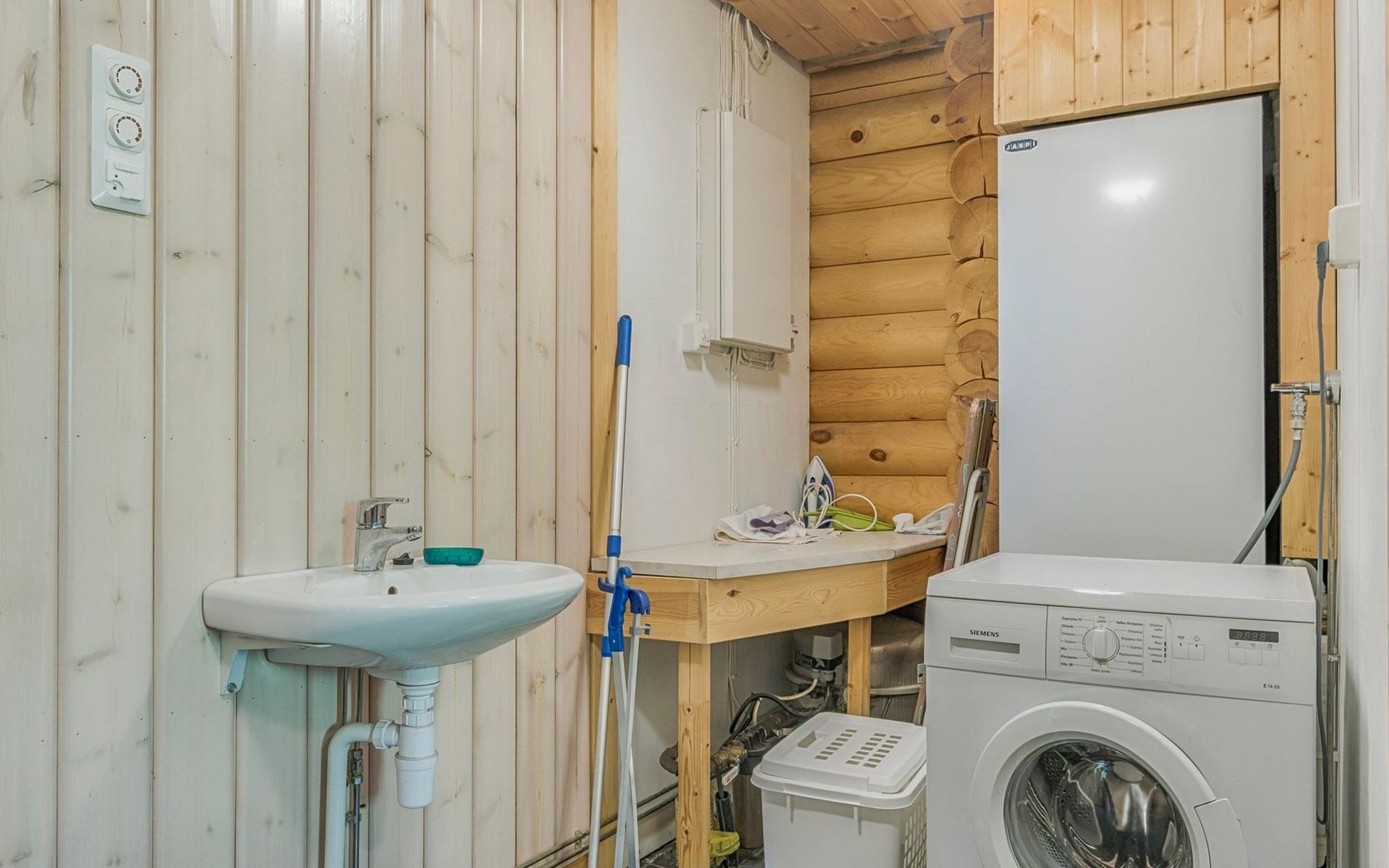 Round-log cottage 2008, living room/kitchen heat-storing fireplace. Downstairs: bedroom 2 beds, bedroom 2 beds. Upstairs: sleeping loft 2 beds, hall and open porch. Sauna in the same building, dressing room, washroom, sauna has underfloor heating and 2 showers. Toilet dowstairs and upstairs.