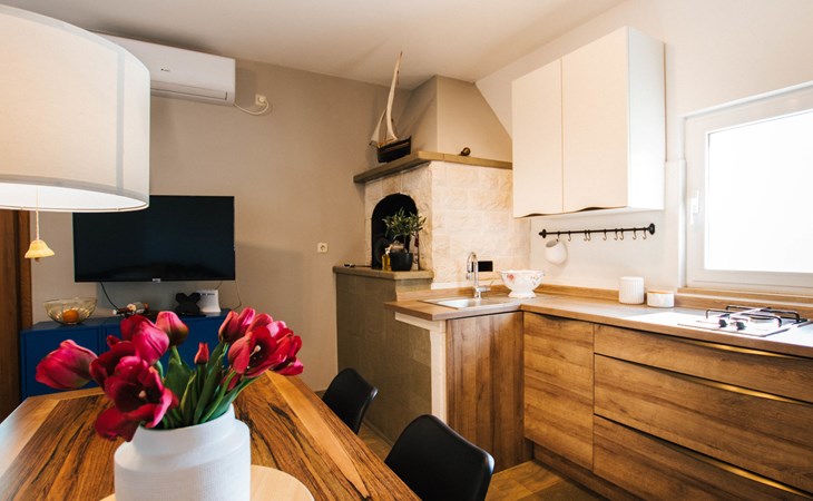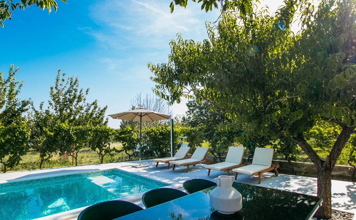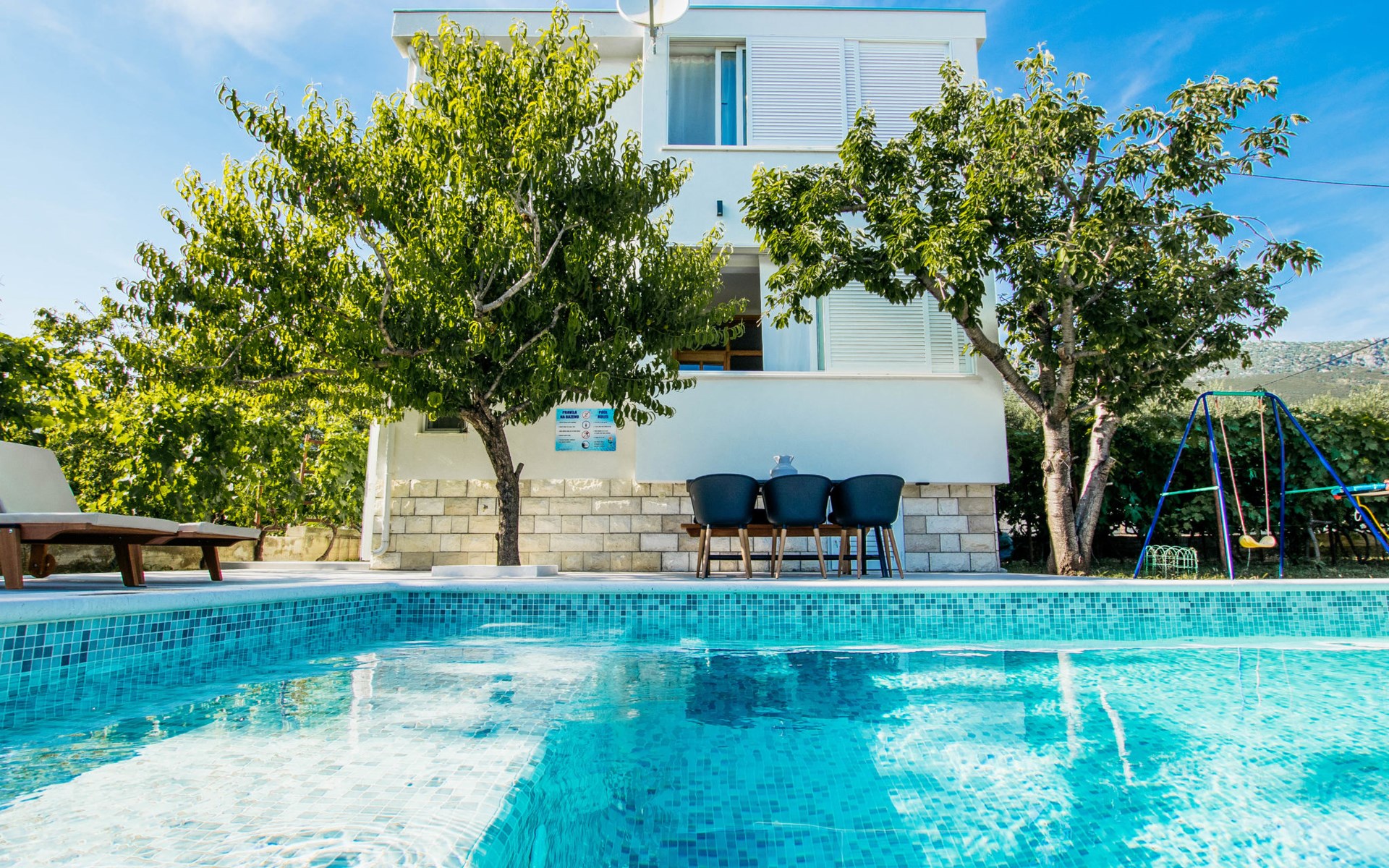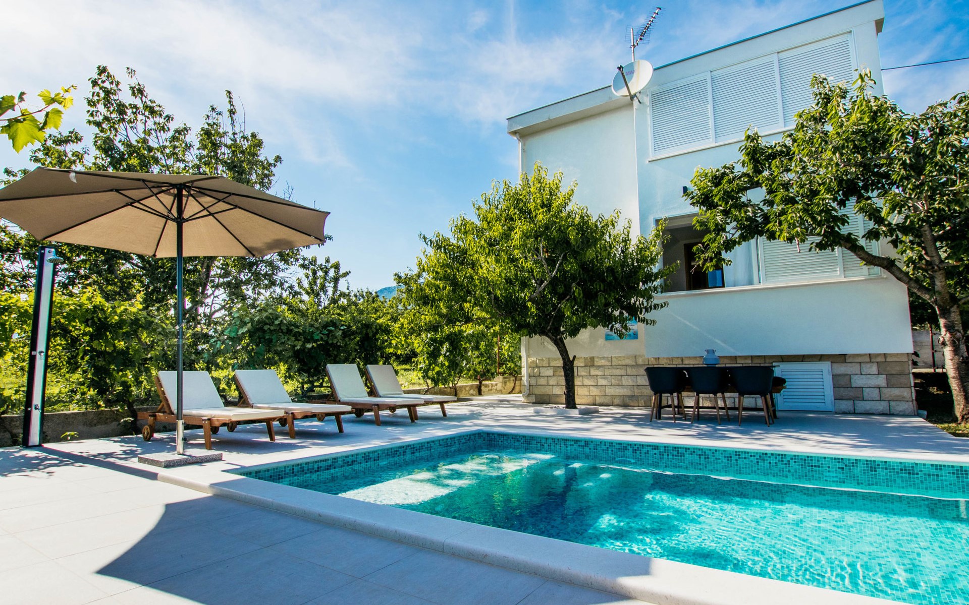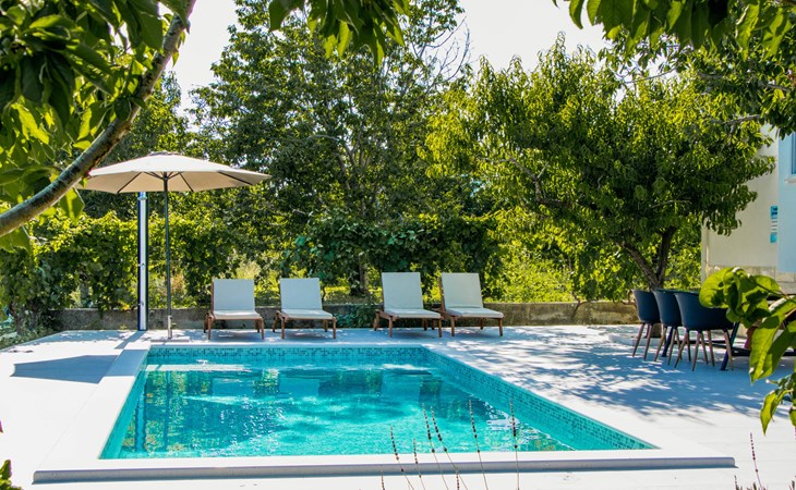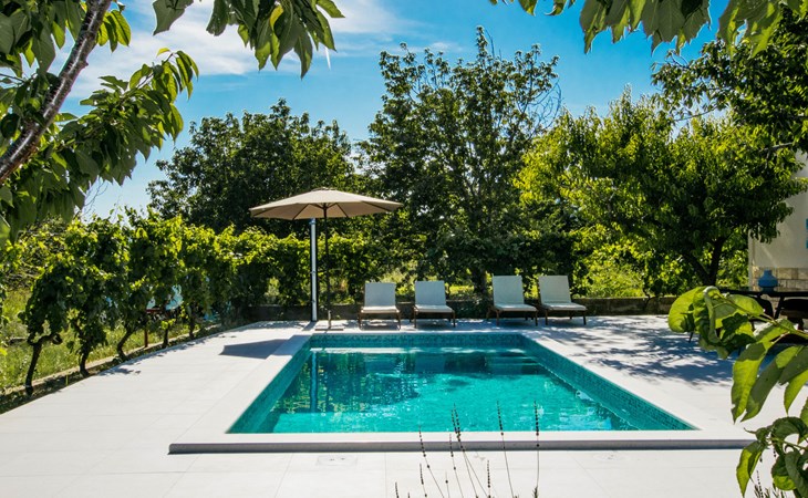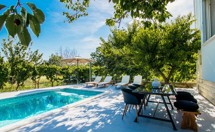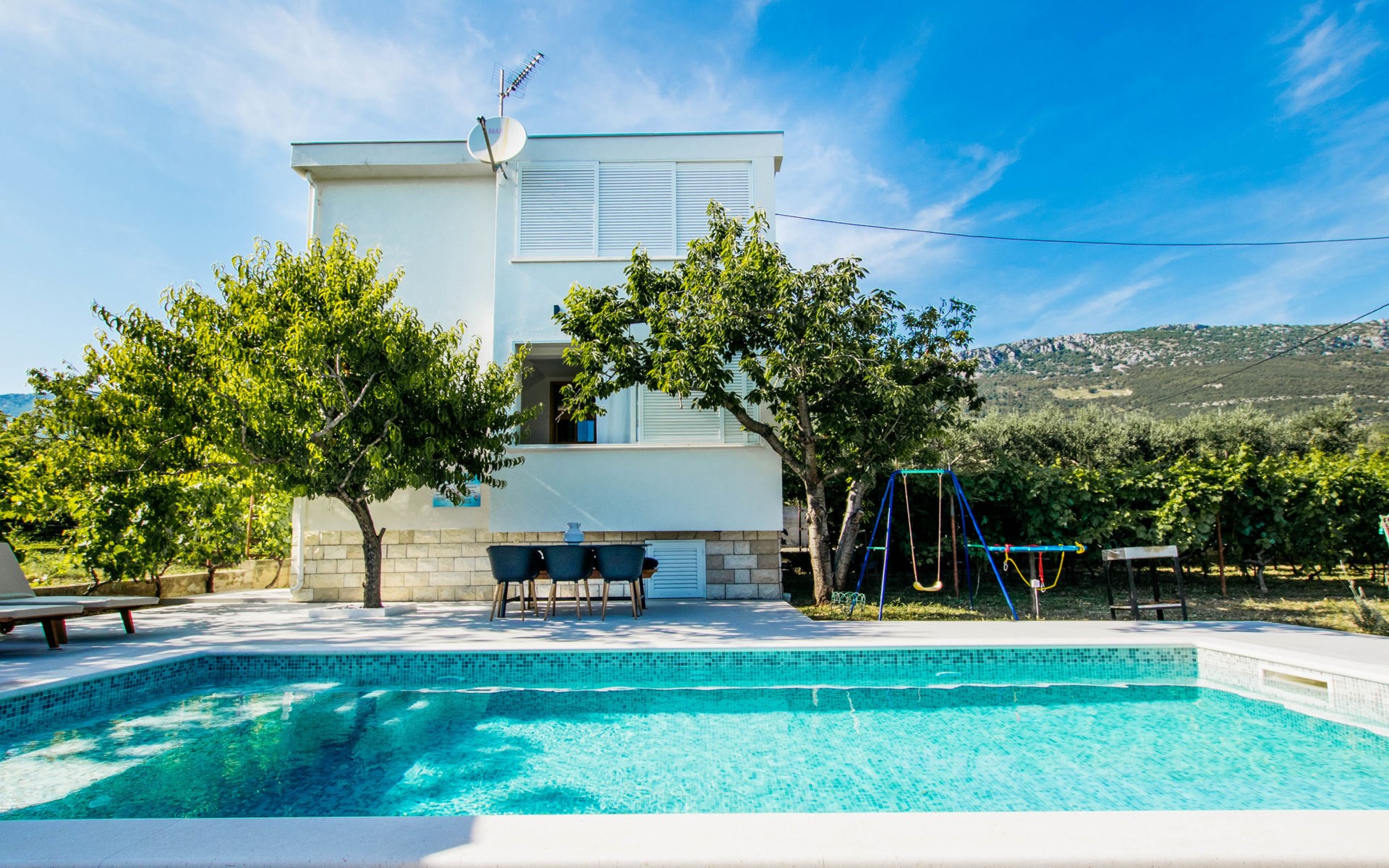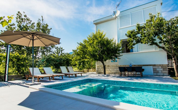 Single-family house "Kastel Mila", surrounded by trees and fields. 1.2 km from the centre of Kaštel Lukšić, 1.2 km from the sea, 1.2 km from the beach. Private: property 360 m2, wildlife garden, swimming pool angular (6 x 4 m, depth 150 cm, seasonal availability: 01.Jun. - 15.Oct.). Outdoor shower. In the house: internet access, washing machine. 80 m long motor access (via unmade road). Parking (for 3 cars) at the house on the premises. Shop 450 m, bus stop 500 m, pebble beach 1.1 km. Please note: airfield 7.4 km from the property.