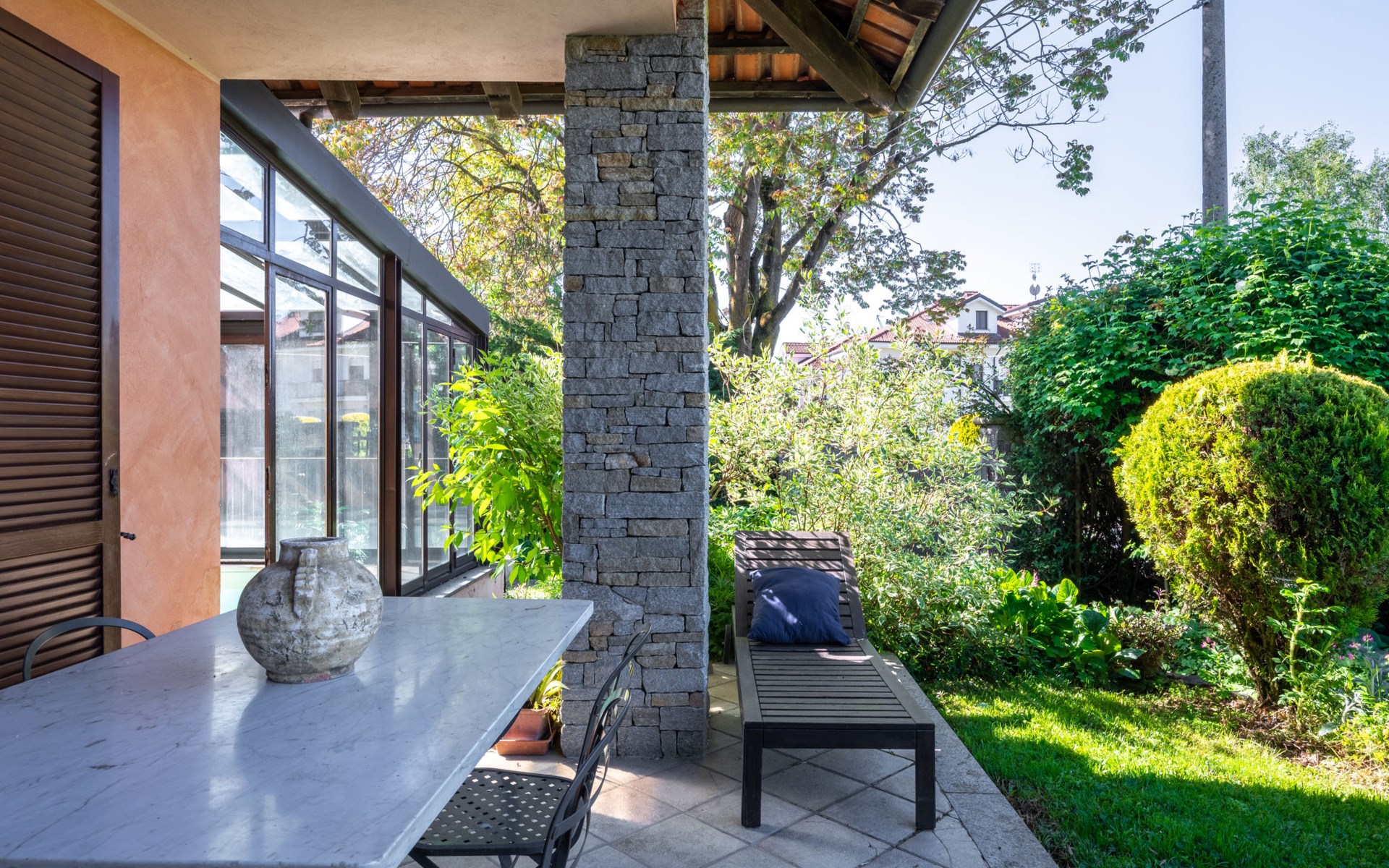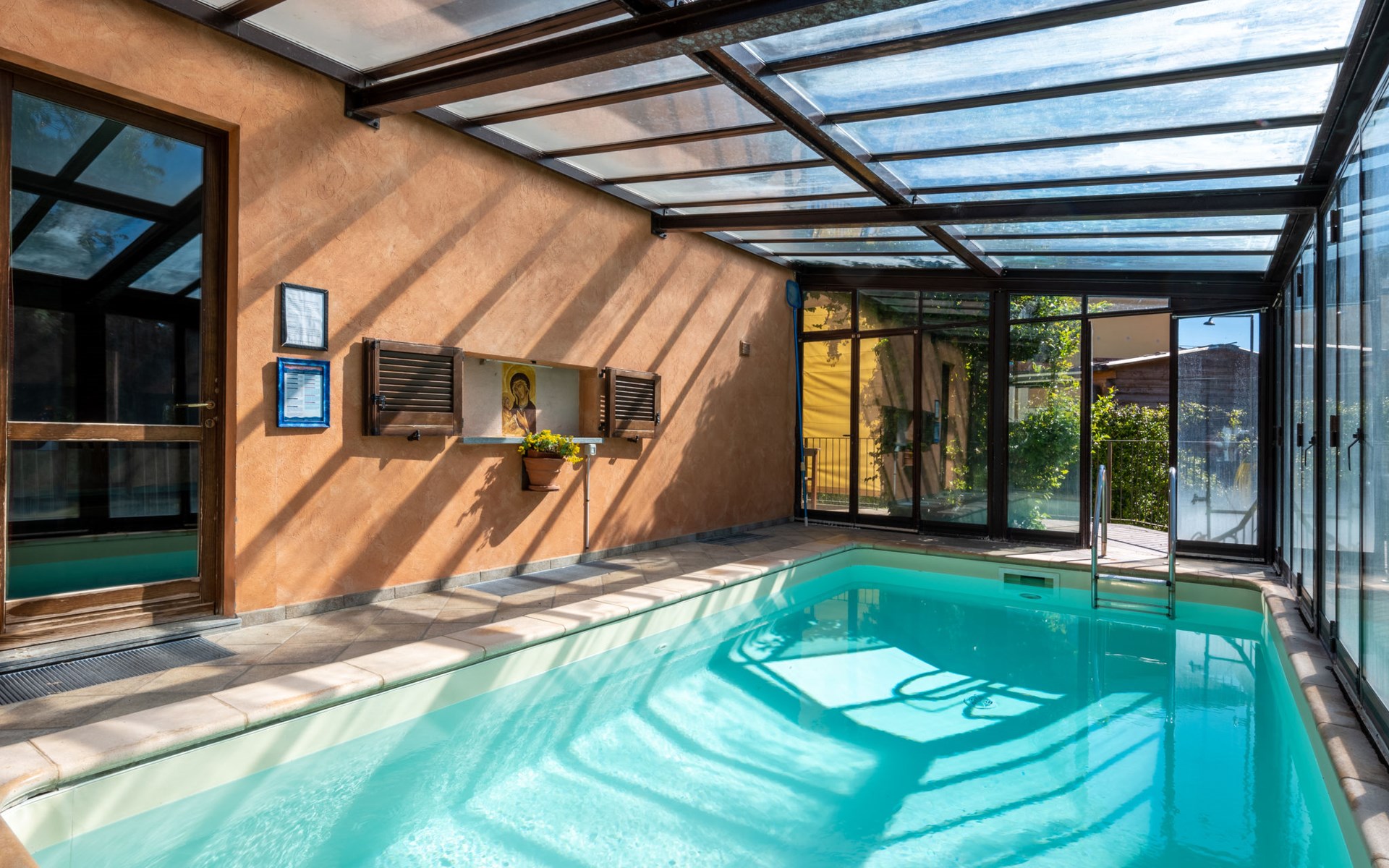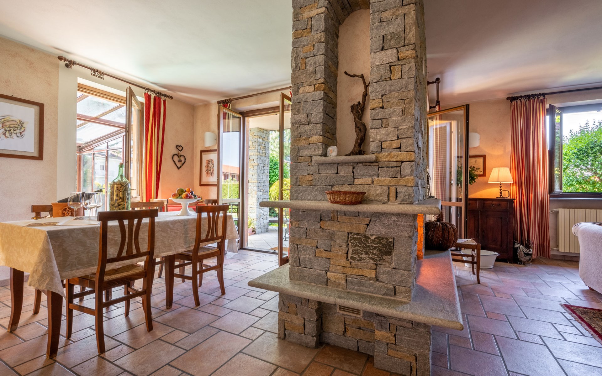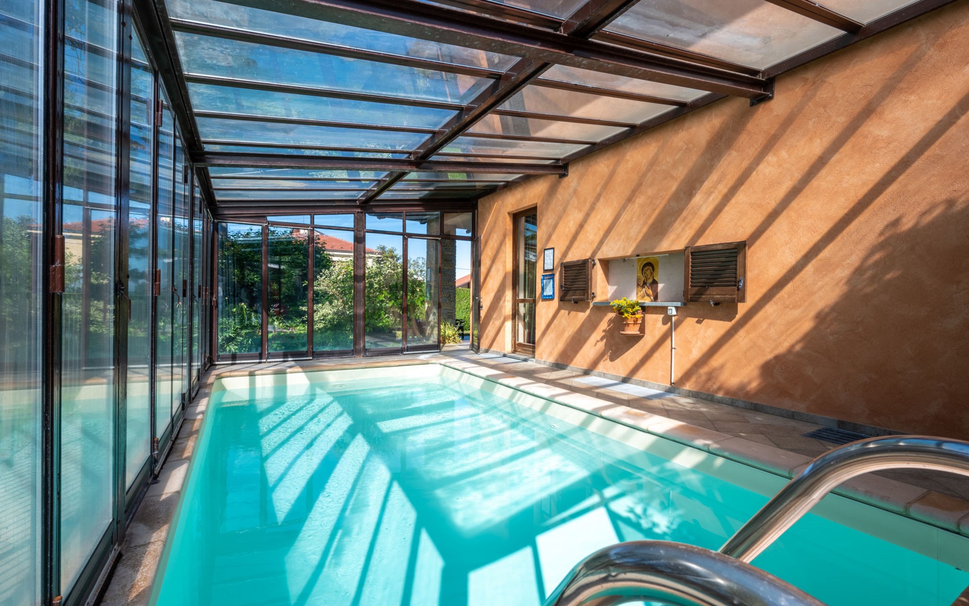 Cosy 2-family house on a vinyard "I Briganti". 600 m from the centre of Narzole, on the outskirts, 6 km from the centre of Cherasco, 30 km from the centre of Alba, 80 km from the sea. For shared use: property 1'000 m2 (fenced), well-kept garden. Private: property 200 m2 (fenced), well-kept garden with lawn, courtyard, swimming pool (6 x 3 m, depth 110 - 180 cm, seasonal availability: 22.Mar. - 05.Nov.). Outdoor shower, pool maintenance by the owner/gardener. Roofed, parking (for 3 cars). Shop 600 m, supermarket 6 km, restaurant 600 m, 10 minute walk to the centre, bus stop 300 m, railway station "Bra" 12 km. Golf course (18 hole) 8 km. Owner lives in separate semi-detached house.
