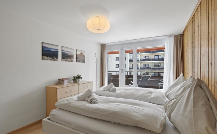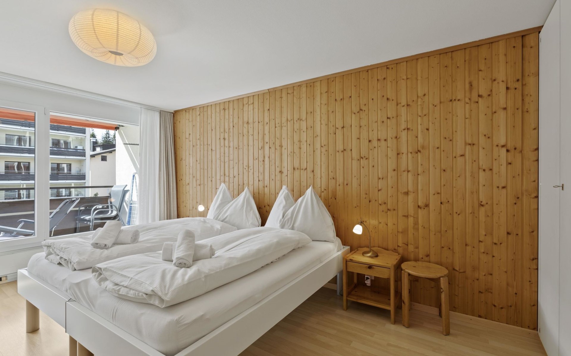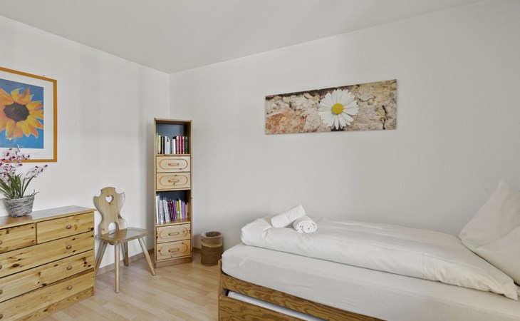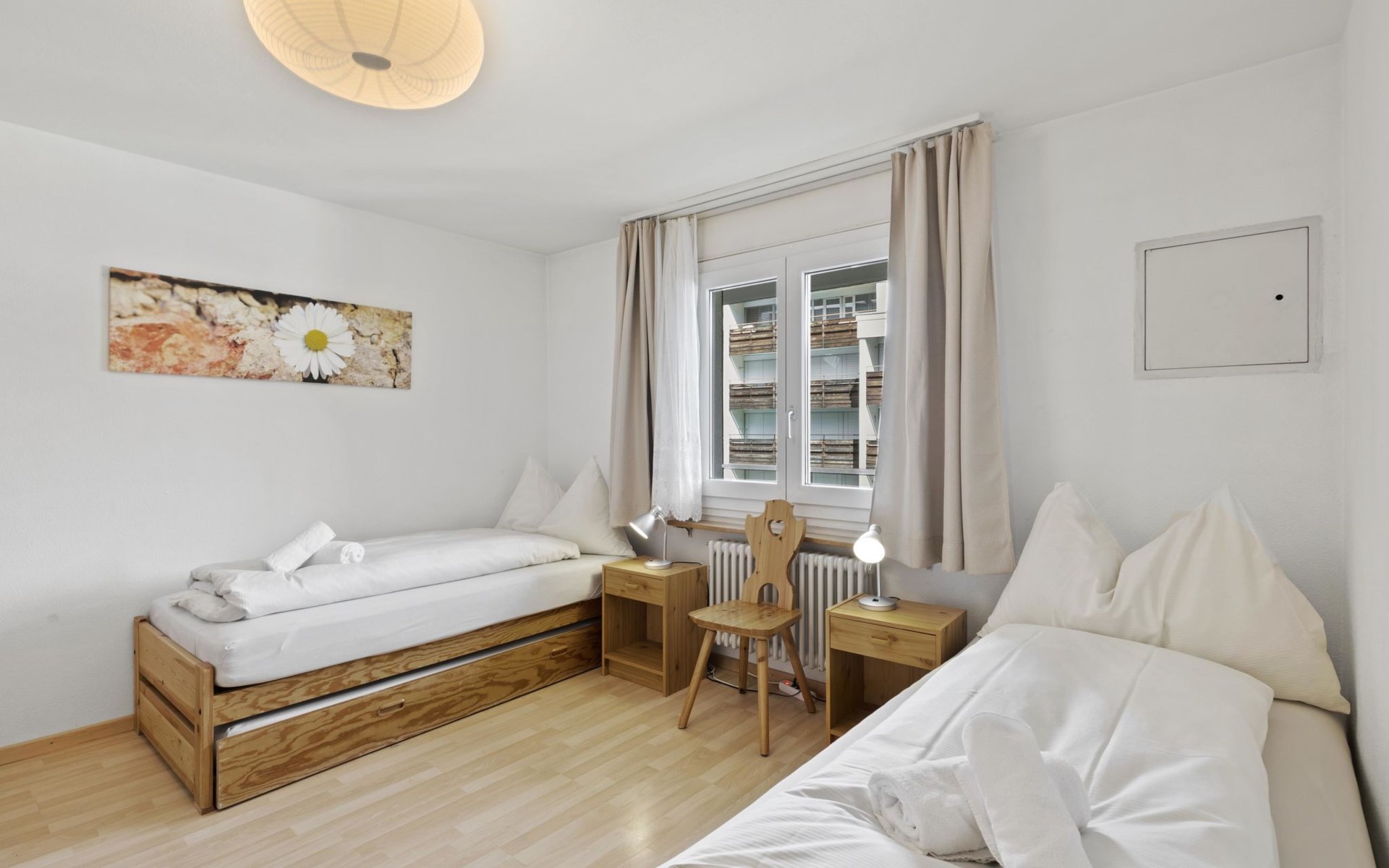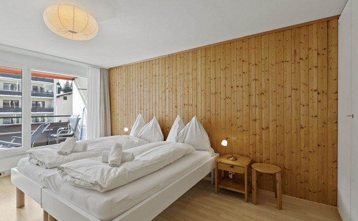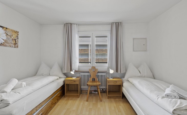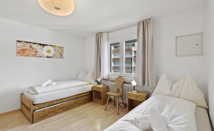 House Ladina/ 3rd floor - right / Lift / Wlan yes / 1 room with double bed / 1 room two single beds / 1 bathroom with WC and bathtub / 1 separate WC All Seestrassen flats, numbers 4-6, are located in the centre of Lenzerheide and have a south-facing balcony. They are also right next to the ski slope/cross-country ski run and in the immediate vicinity of the free sports bus and various shopping facilities. A good starting point for all winter/summer activities for the whole family. (In the same house Ladina are the holiday flats no.58, no.62 and no.78).