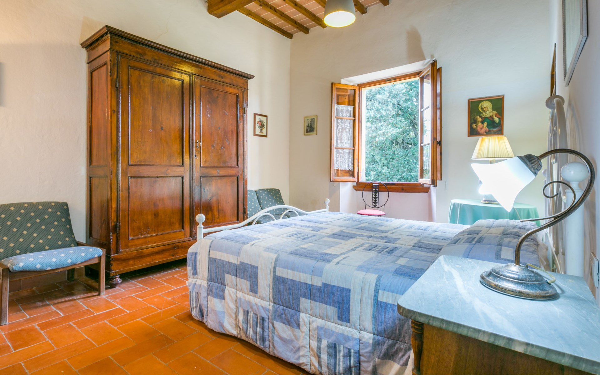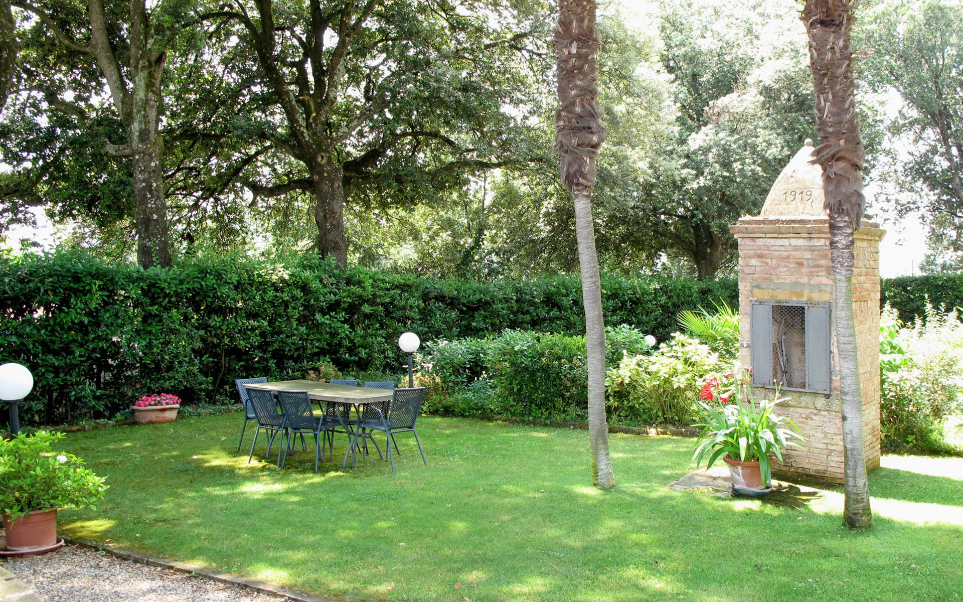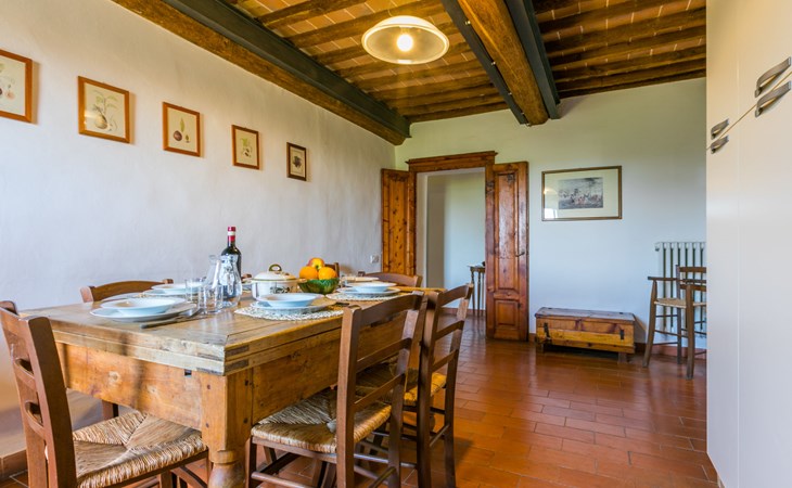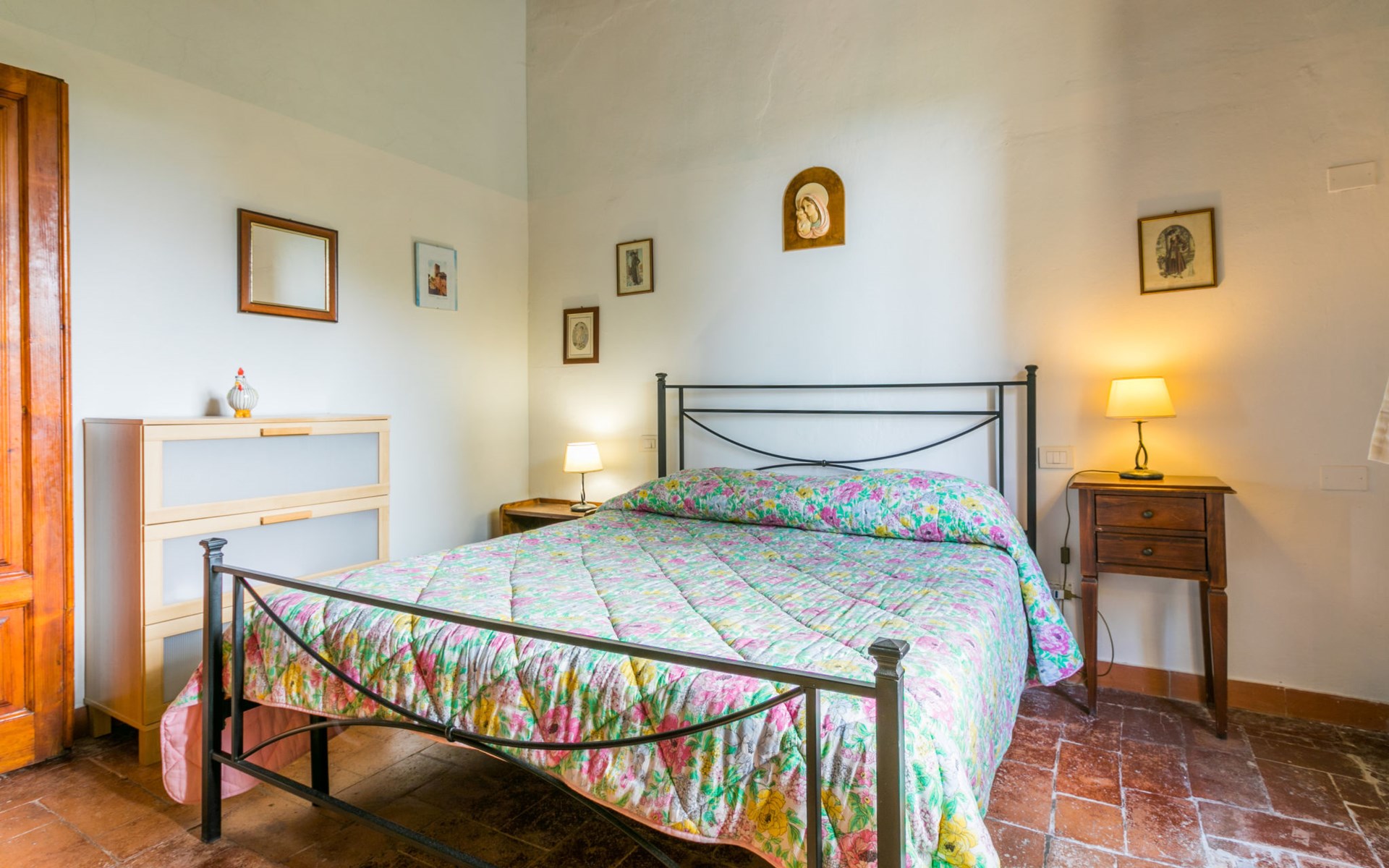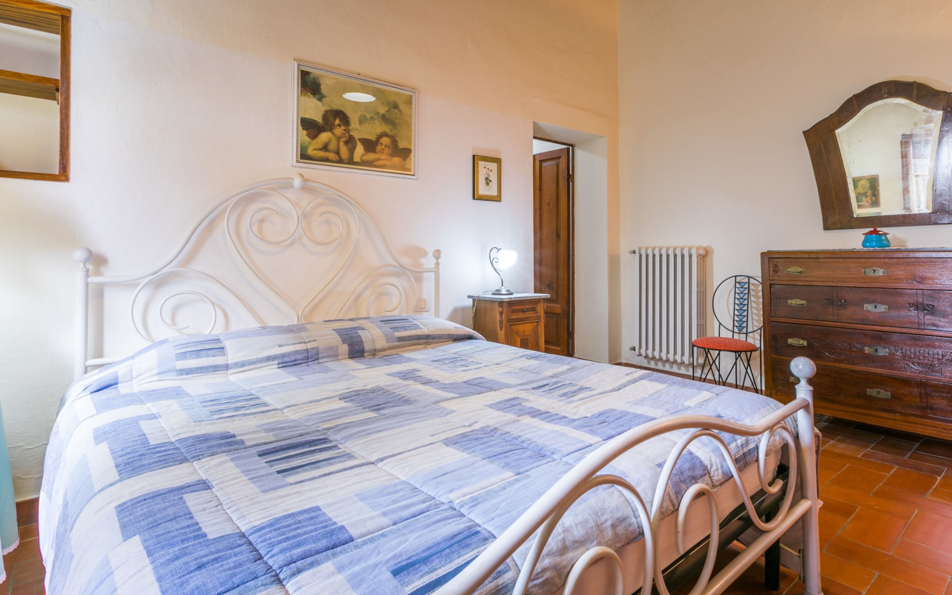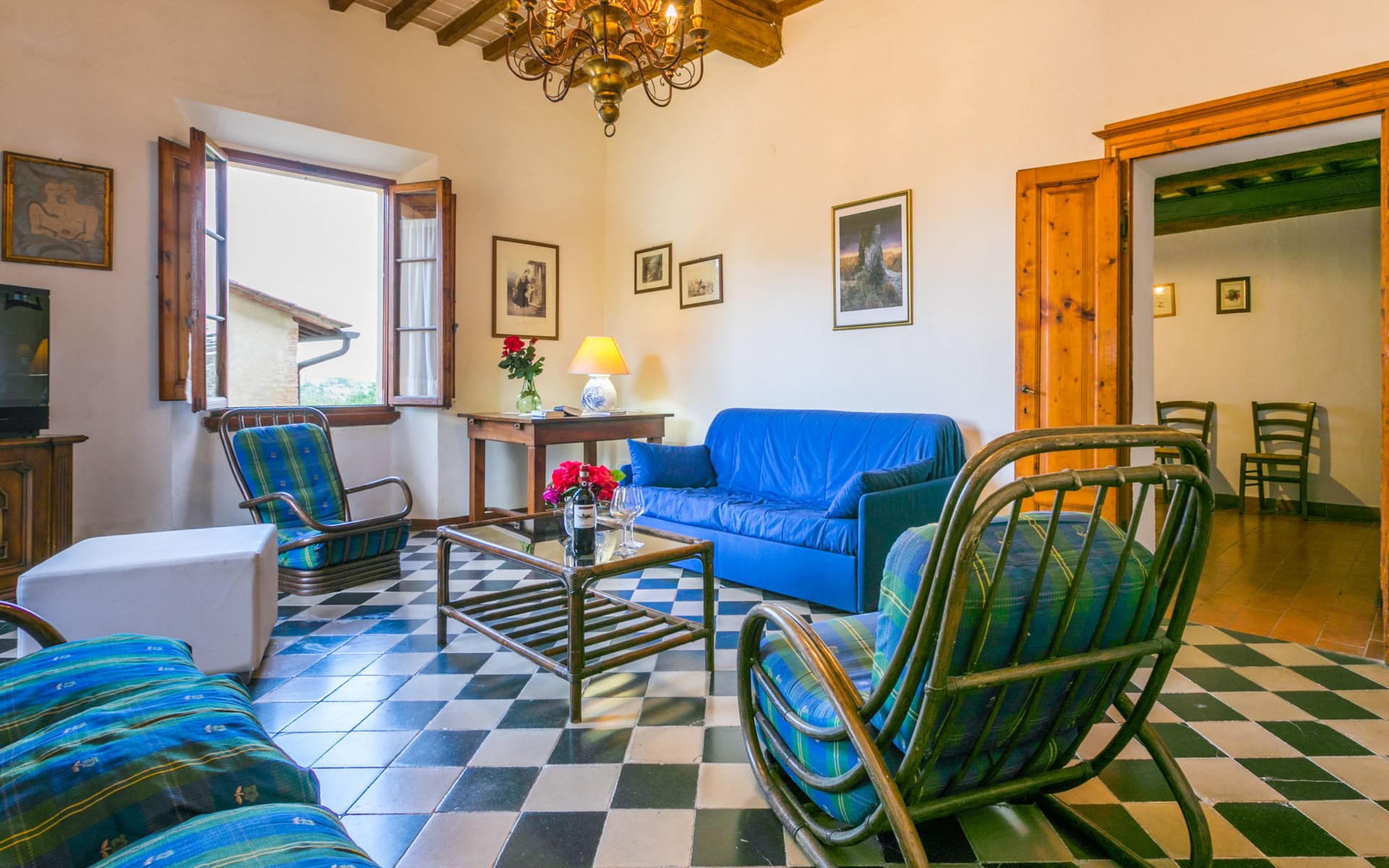 Cosy country house "Giuggiolo", surrounded by trees and vineyards. 3 houses in the residence. 4 apartments in the residence. In the hamlet Casaglia 4 km from the centre of Poggibonsi, 11 km from the centre of San Gimignano, 30 km from the centre of Siena, in a sunny position, in the countryside. For shared use: large, beautiful garden 5'000 m2 (fenced) with plants and trees, meadow, swimming pool (14 x 7 m, depth 120 - 160 cm, seasonal availability: 02.May. - 03.Oct.). Terrace, pool maintenance by the owner/gardener. Heating to be paid on the spot (01.Nov. - 31.Mar.). 800 m long motor access to the grounds (via unmade road). Parking on the premises. Supermarket 2 km, railway station "Poggibonsi" 4 km. Please note: residence with electric gates. The owner lives in the same residence. Wine tasting in a wine cellar near San Gimignano 17 km away 1x per stay included (on request).