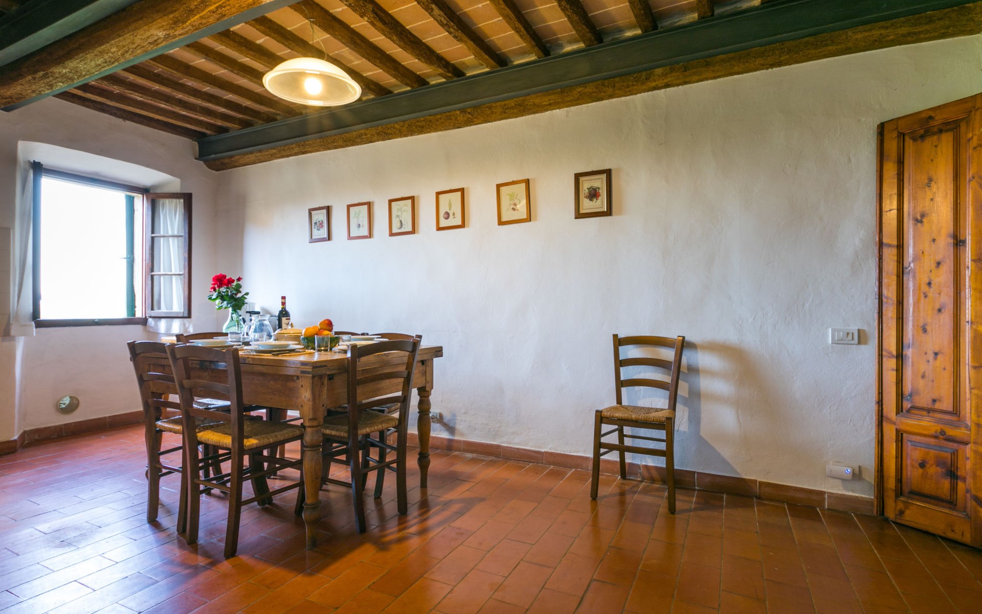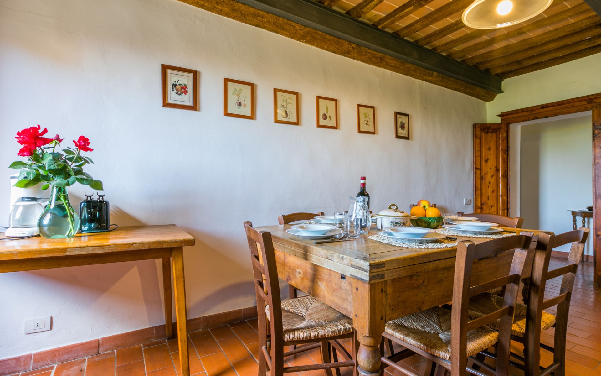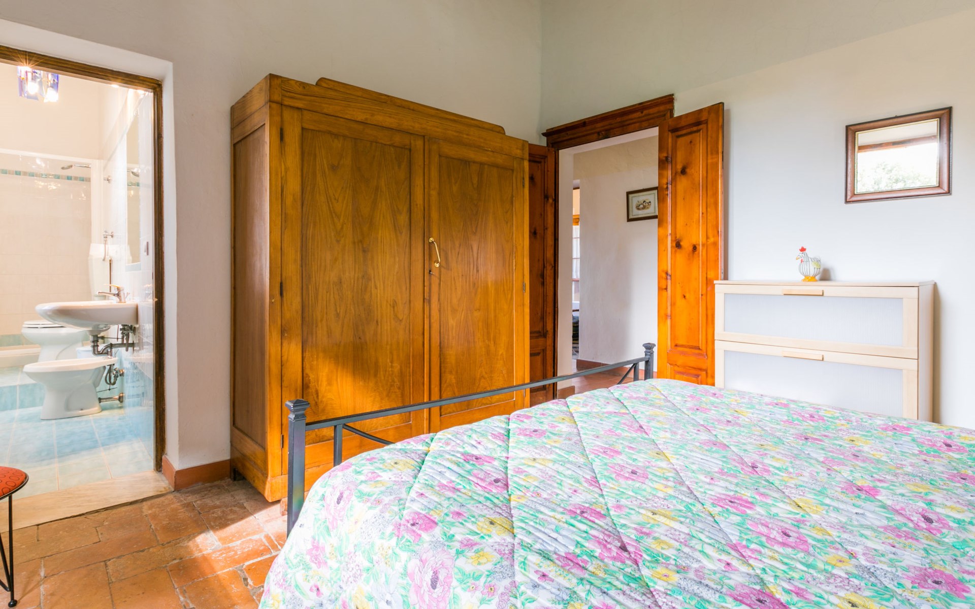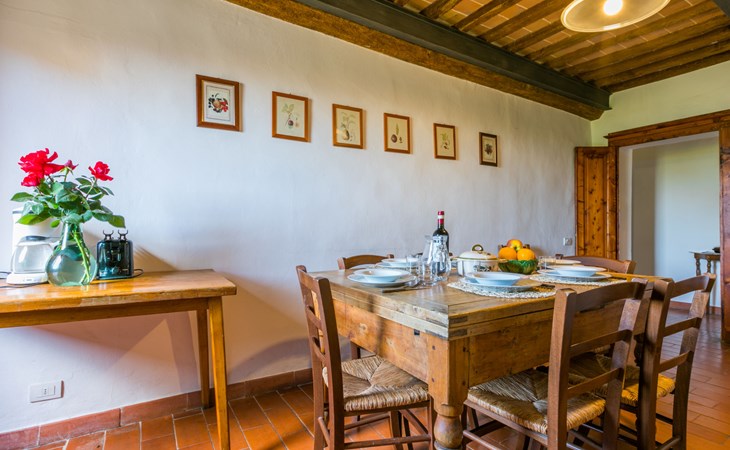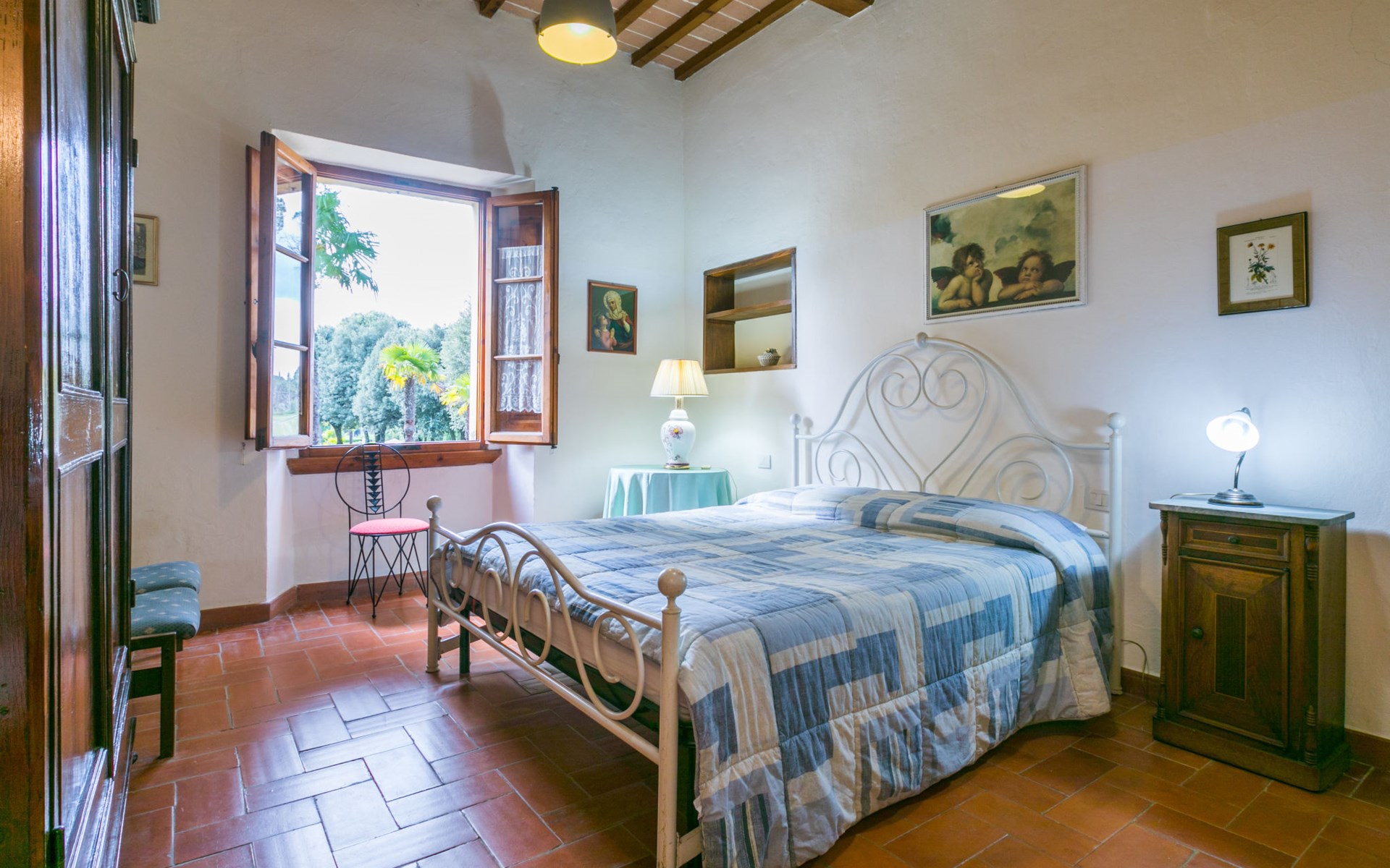 Cosy country house "Giuggiolo", surrounded by trees and vineyards. 3 houses in the residence. 4 apartments in the residence. In the hamlet Casaglia 4 km from the centre of Poggibonsi, 11 km from the centre of San Gimignano, 30 km from the centre of Siena, in a sunny position, in the countryside. For shared use: large, beautiful garden 5'000 m2 (fenced) with plants and trees, meadow, swimming pool (14 x 7 m, depth 120 - 160 cm, seasonal availability: 02.May. - 03.Oct.). Terrace, pool maintenance by the owner/gardener. Heating to be paid on the spot (01.Nov. - 31.Mar.). 800 m long motor access to the grounds (via unmade road). Parking on the premises. Supermarket 2 km, railway station "Poggibonsi" 4 km. Please note: residence with electric gates. The owner lives in the same residence. Wine tasting in a wine cellar near San Gimignano 17 km away 1x per stay included (on request).