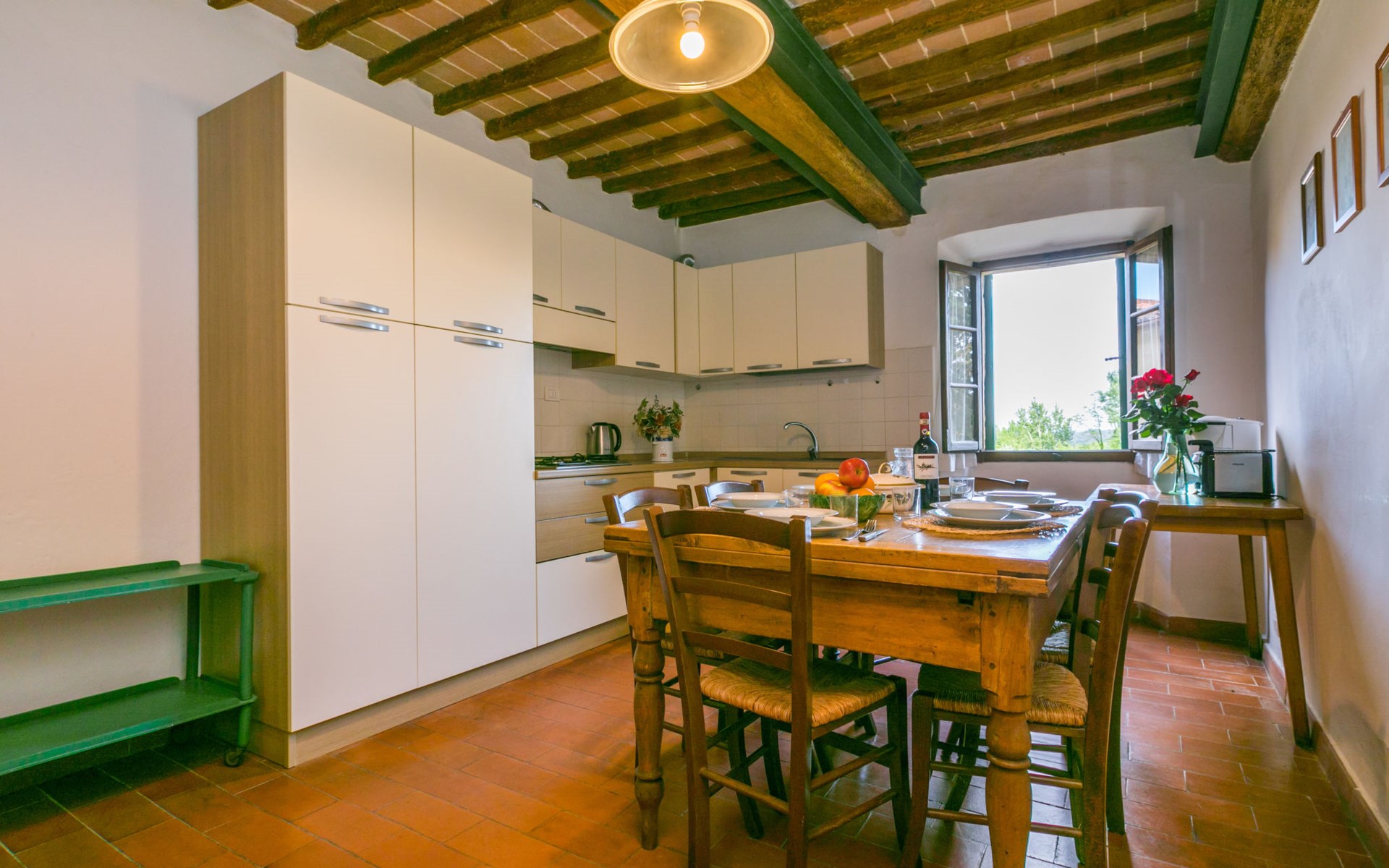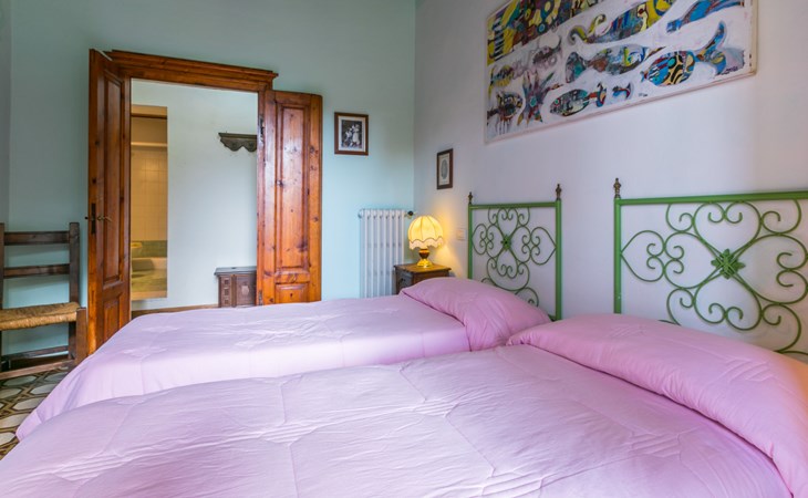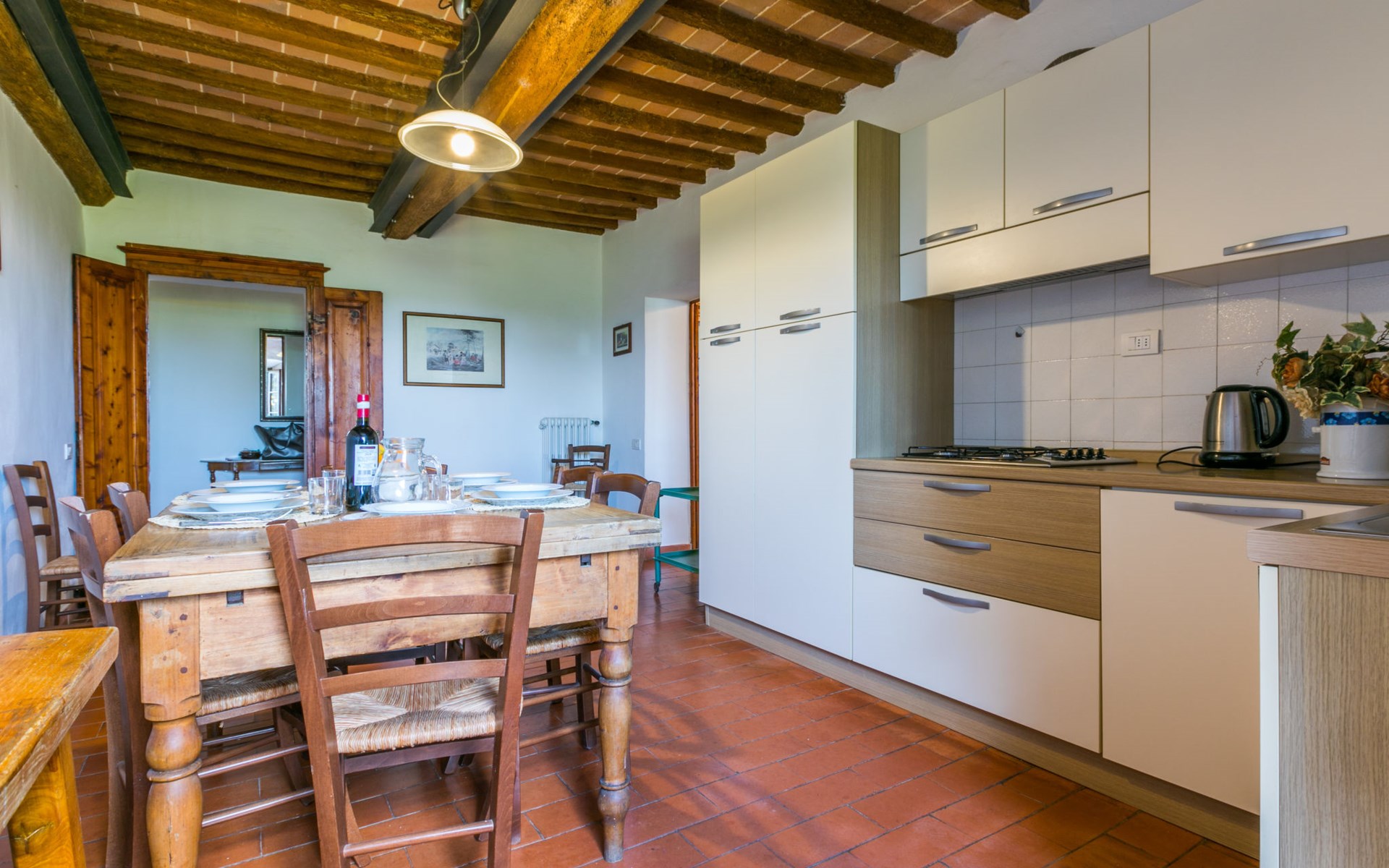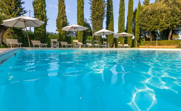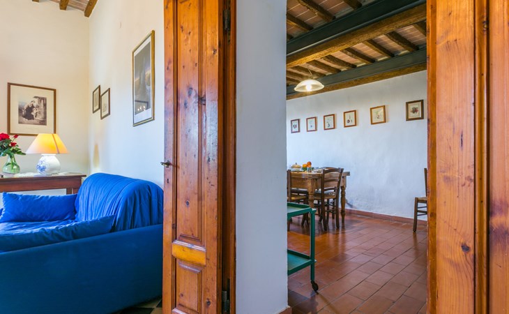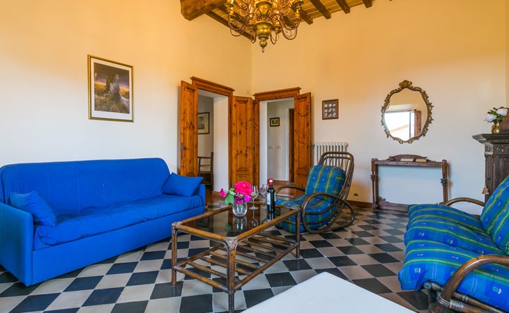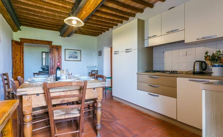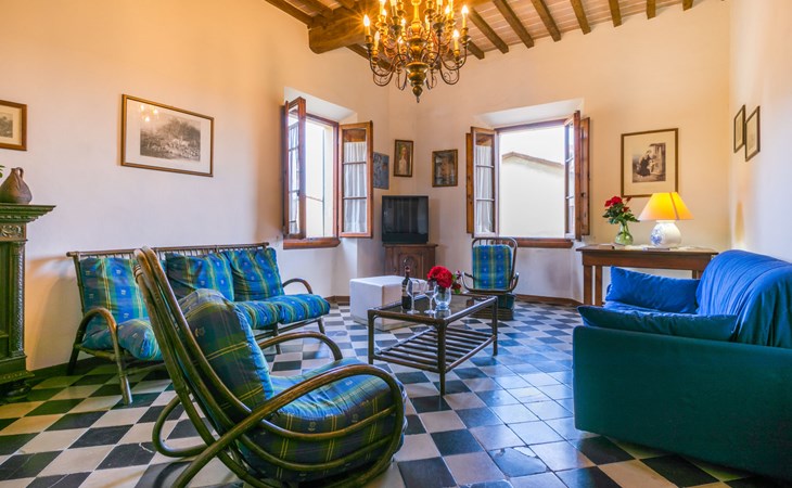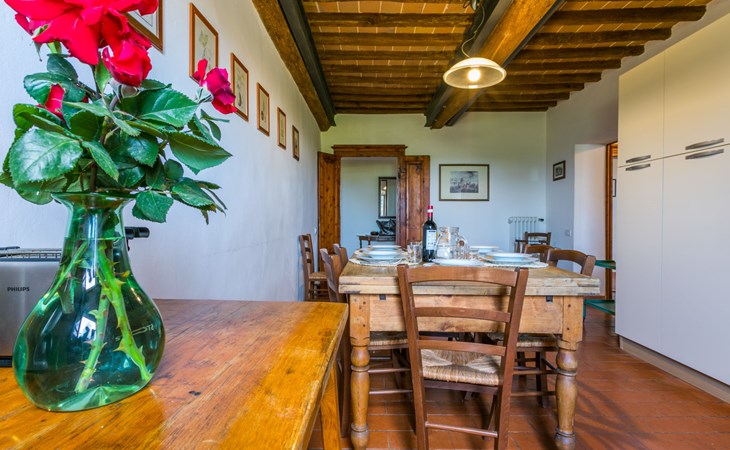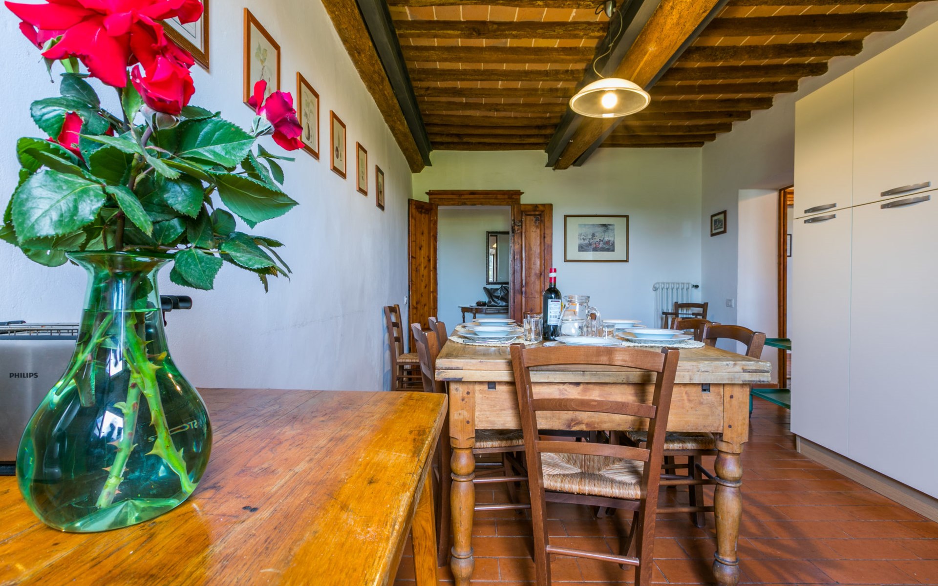 Cosy country house "Giuggiolo", surrounded by trees and vineyards. 3 houses in the residence. 4 apartments in the residence. In the hamlet Casaglia 4 km from the centre of Poggibonsi, 11 km from the centre of San Gimignano, 30 km from the centre of Siena, in a sunny position, in the countryside. For shared use: large, beautiful garden 5'000 m2 (fenced) with plants and trees, meadow, swimming pool (14 x 7 m, depth 120 - 160 cm, seasonal availability: 02.May. - 03.Oct.). Terrace, pool maintenance by the owner/gardener. Heating to be paid on the spot (01.Nov. - 31.Mar.). 800 m long motor access to the grounds (via unmade road). Parking on the premises. Supermarket 2 km, railway station "Poggibonsi" 4 km. Please note: residence with electric gates. The owner lives in the same residence. Wine tasting in a wine cellar near San Gimignano 17 km away 1x per stay included (on request).
