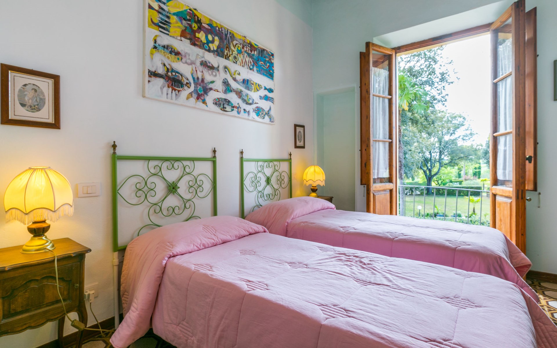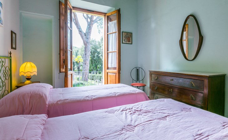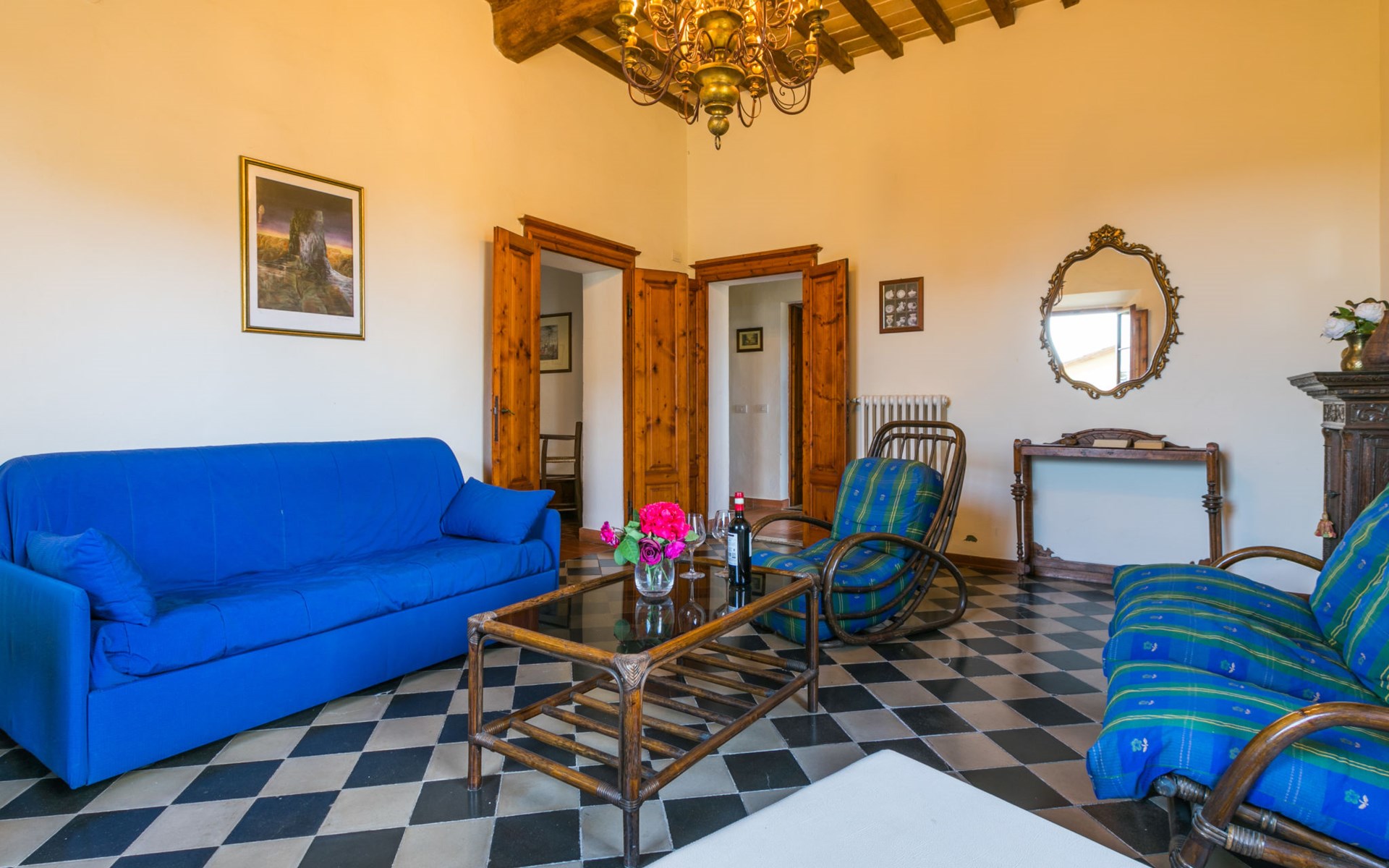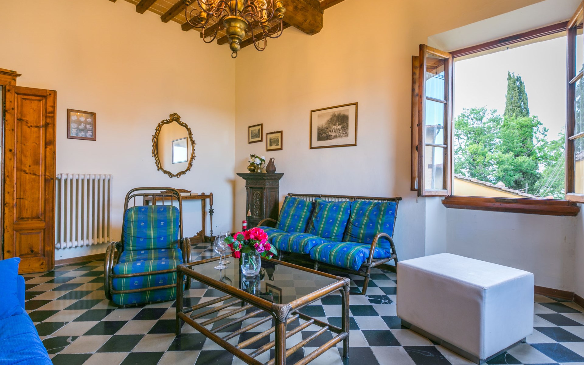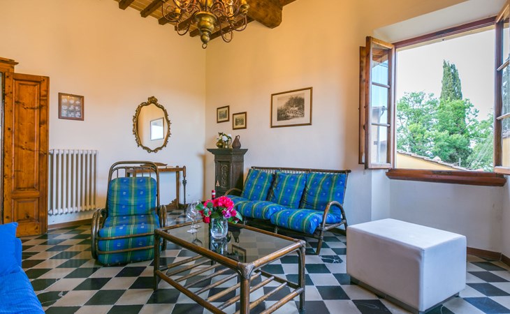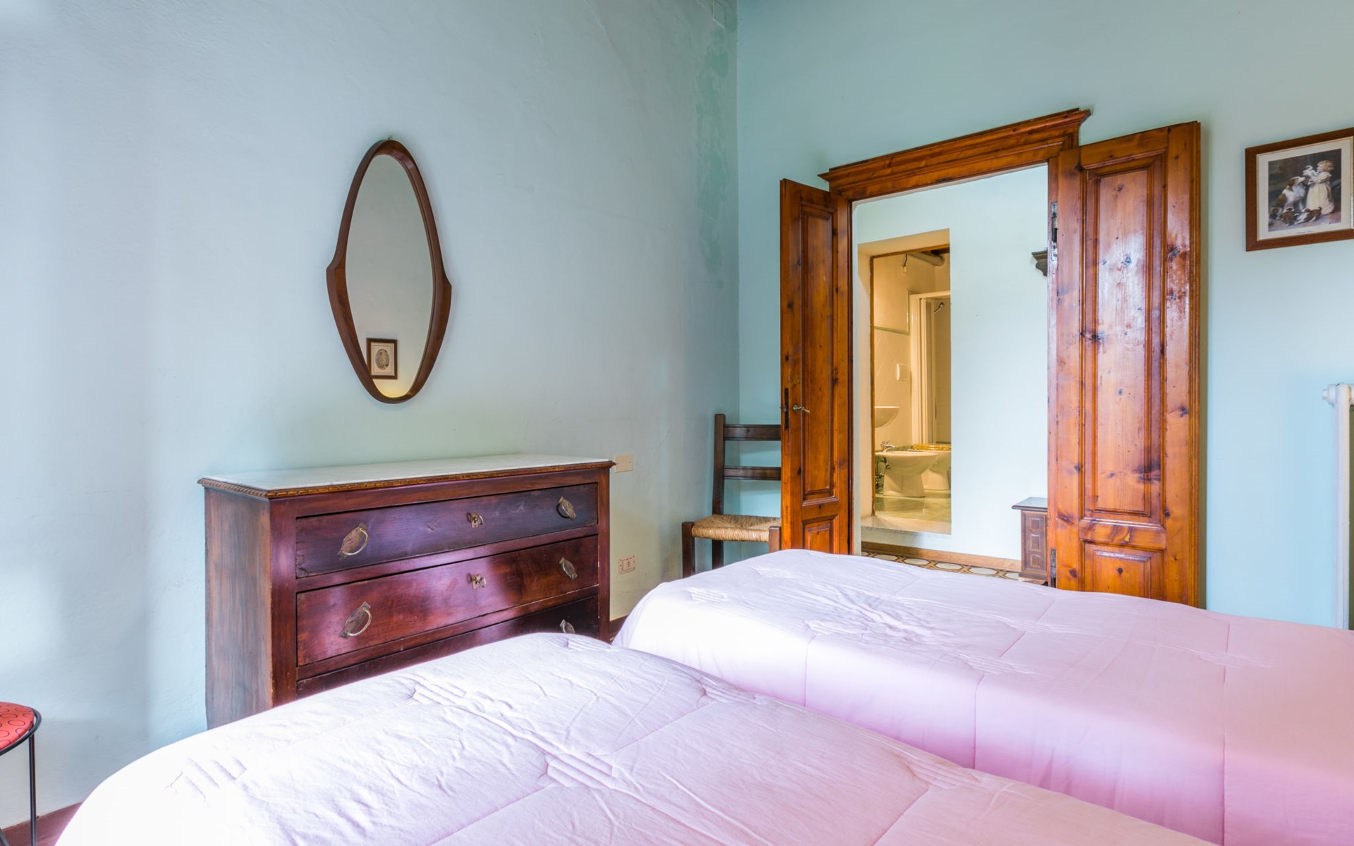 Cosy country house "Giuggiolo", surrounded by trees and vineyards. 3 houses in the residence. 4 apartments in the residence. In the hamlet Casaglia 4 km from the centre of Poggibonsi, 11 km from the centre of San Gimignano, 30 km from the centre of Siena, in a sunny position, in the countryside. For shared use: large, beautiful garden 5'000 m2 (fenced) with plants and trees, meadow, swimming pool (14 x 7 m, depth 120 - 160 cm, seasonal availability: 02.May. - 03.Oct.). Terrace, pool maintenance by the owner/gardener. Heating to be paid on the spot (01.Nov. - 31.Mar.). 800 m long motor access to the grounds (via unmade road). Parking on the premises. Supermarket 2 km, railway station "Poggibonsi" 4 km. Please note: residence with electric gates. The owner lives in the same residence. Wine tasting in a wine cellar near San Gimignano 17 km away 1x per stay included (on request).