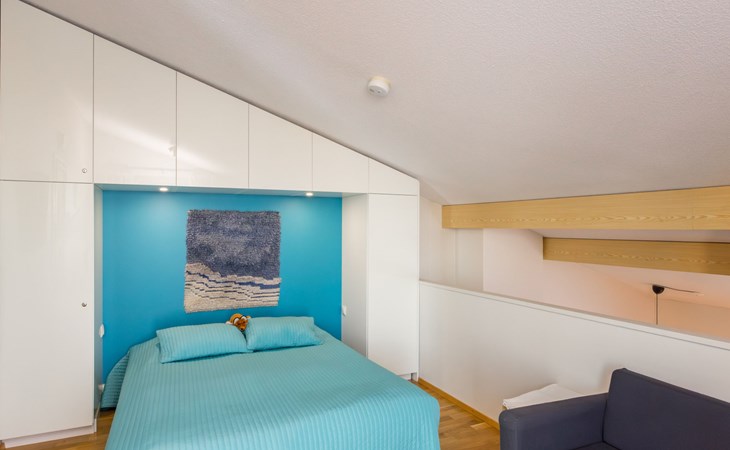 This apartment is designed to provide space and comfort for all guests. Downstairs, you'll find one cozy bedroom with a double bed. The living room features a spacious sofa bed. Additionally, there is ample sleeping space in the loft, which also includes a comfortable double bed.