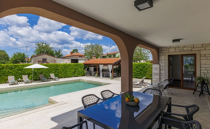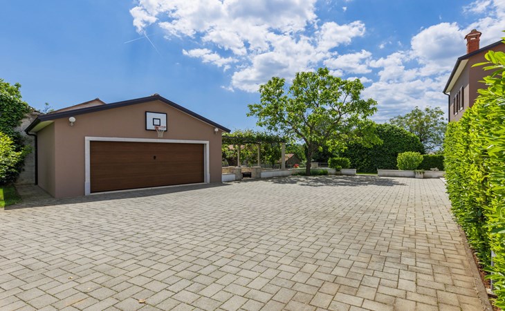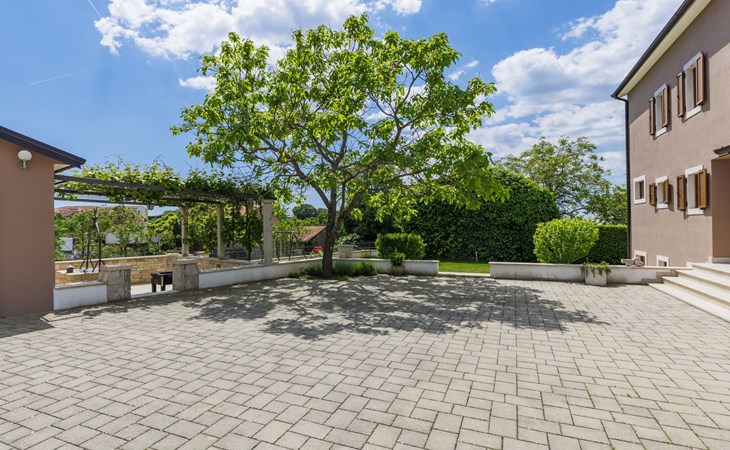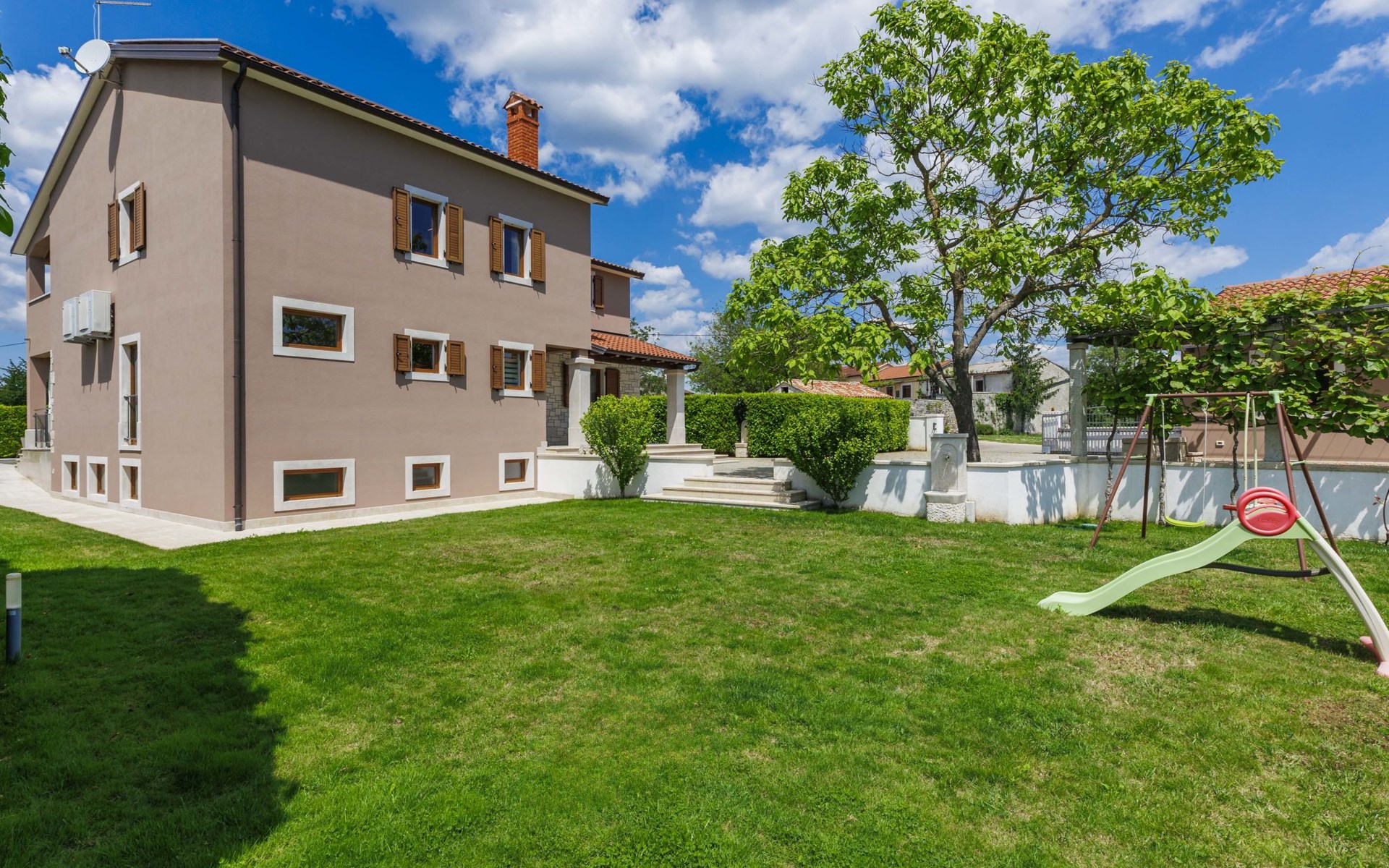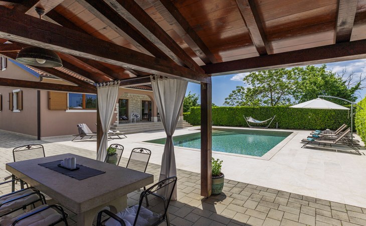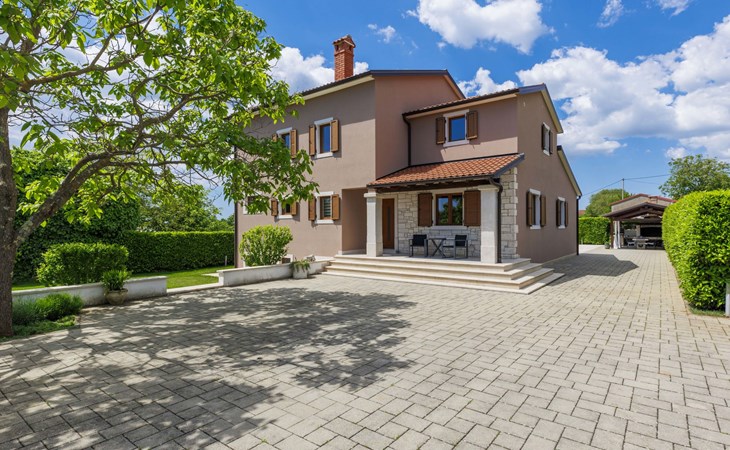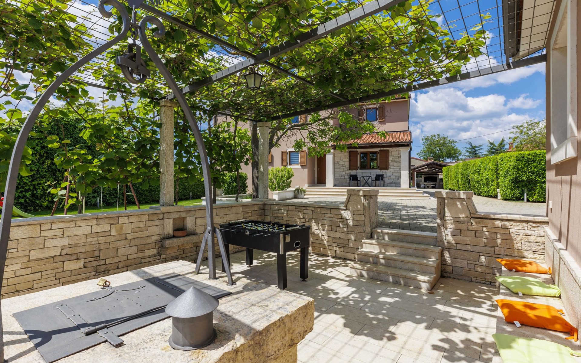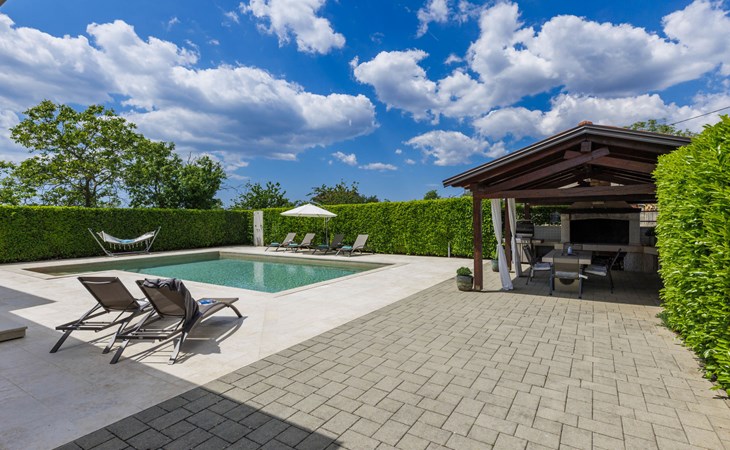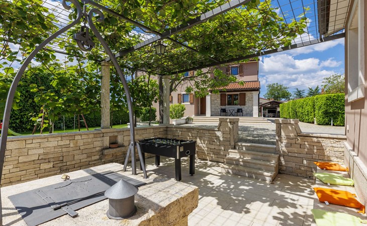 Child friendly, beautiful, comfortable villa "Anastasia", 2 storeys. 6 km from the centre of Žminj, 13 km from the centre of Pazin, in a sunny position, 27 km from the sea, 27 km from the beach, in the countryside. Private: property 1'800 m2 (fenced), beautiful garden with lawn 200 m2, swimming pool (10 x 6 m, depth 140 cm, seasonal availability: 27.Apr. - 26.Oct.) with internal staircase. Outdoor shower, basketball, terrace, garden furniture, barbecue, children's playground. In the house: internet access, table football, washing machine, tumble dryer. Parking at the house on the premises. Shop 500 m, supermarket 6 km, restaurant 1 km, café 400 m, bus stop 6.9 km, railway station 1 km, pebble beach 27 km. Riding stable 7 km, walking paths from the house 1 km, cycle lane 1 km. Available: darts.
