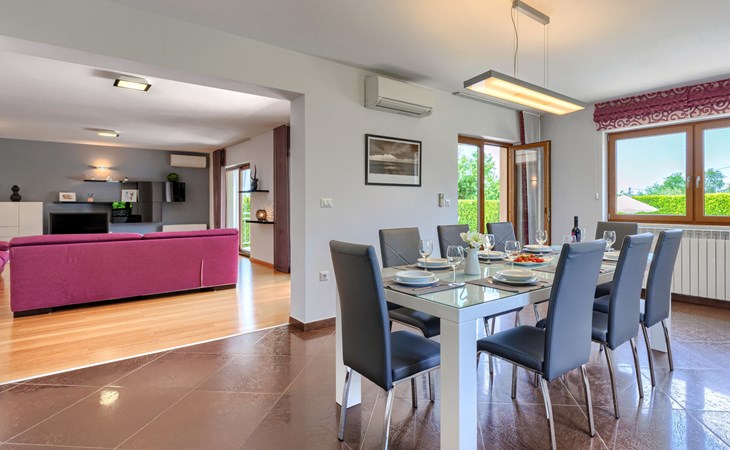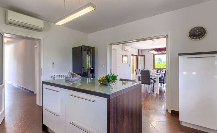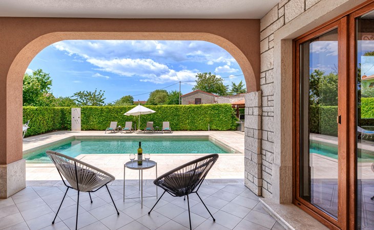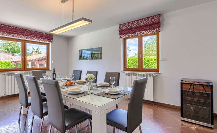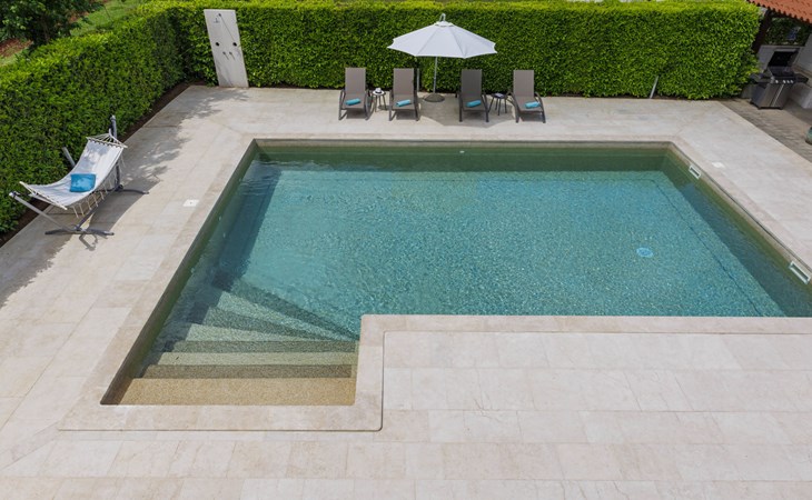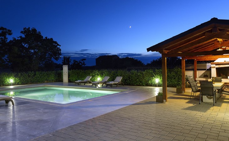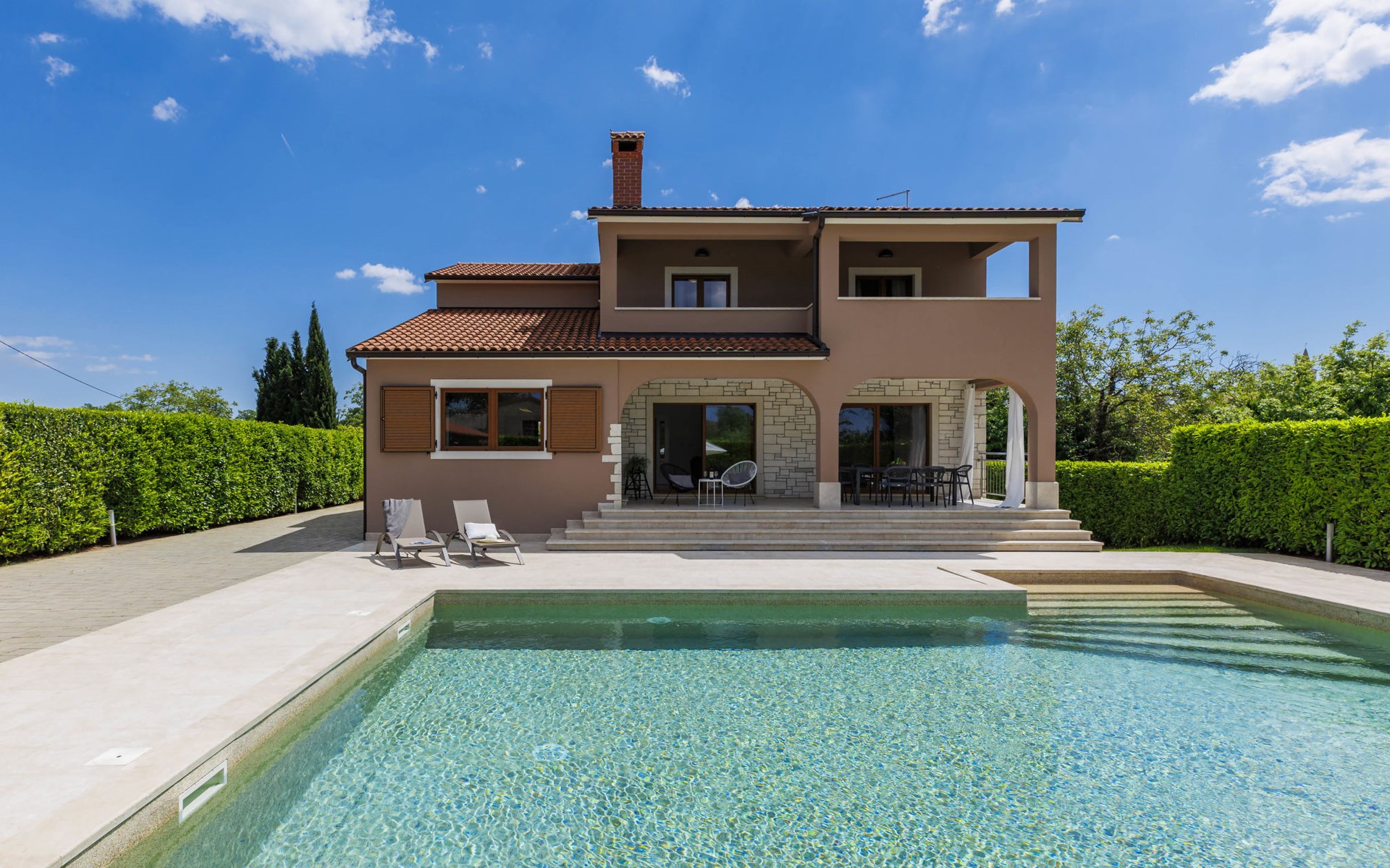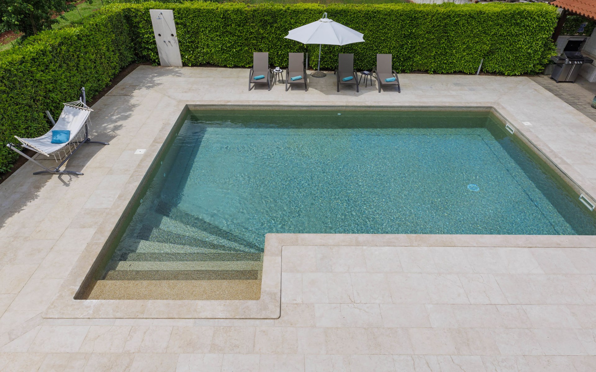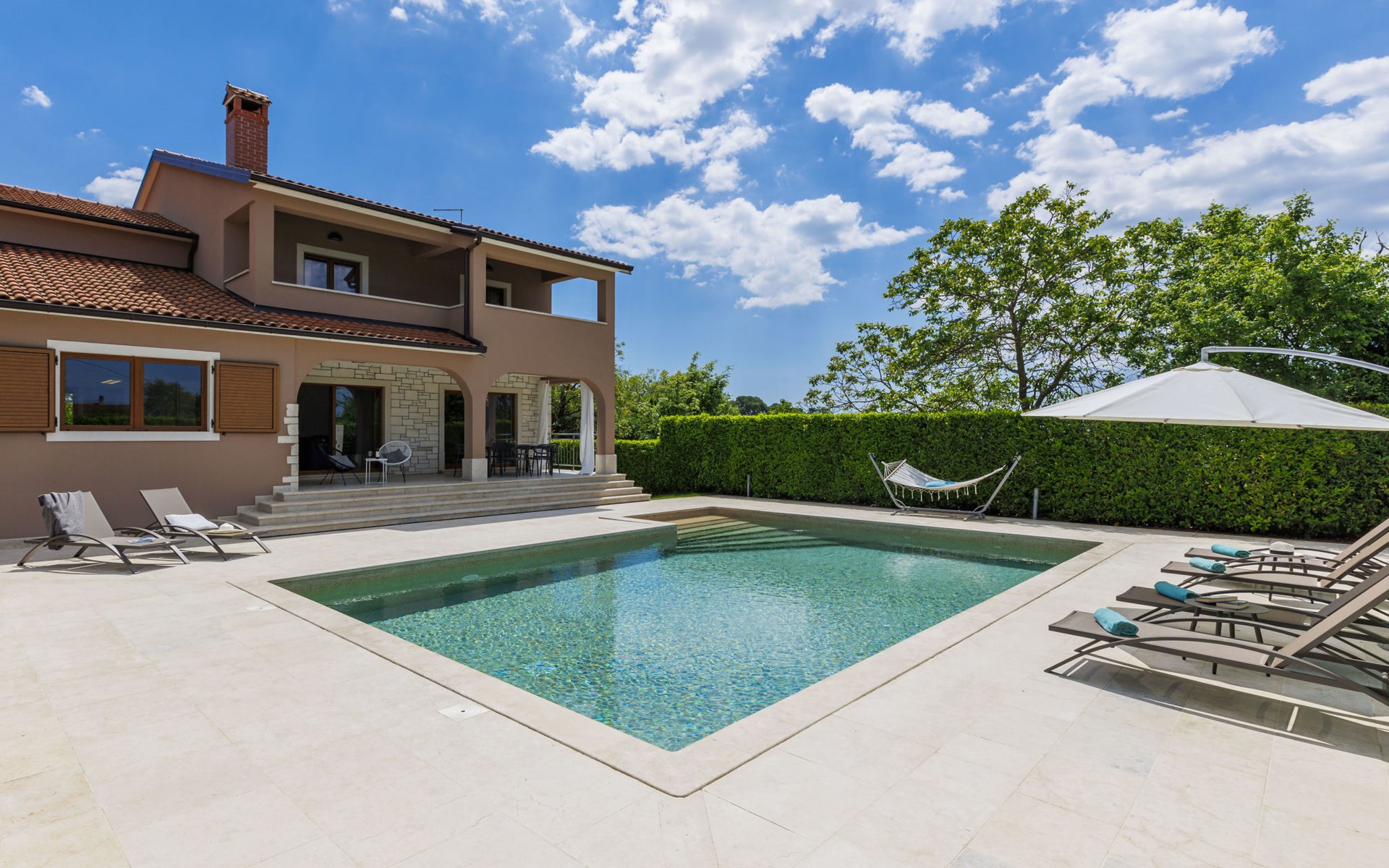 Child friendly, beautiful, comfortable villa "Anastasia", 2 storeys. 6 km from the centre of Žminj, 13 km from the centre of Pazin, in a sunny position, 27 km from the sea, 27 km from the beach, in the countryside. Private: property 1'800 m2 (fenced), beautiful garden with lawn 200 m2, swimming pool (10 x 6 m, depth 140 cm, seasonal availability: 27.Apr. - 26.Oct.) with internal staircase. Outdoor shower, basketball, terrace, garden furniture, barbecue, children's playground. In the house: internet access, table football, washing machine, tumble dryer. Parking at the house on the premises. Shop 500 m, supermarket 6 km, restaurant 1 km, café 400 m, bus stop 6.9 km, railway station 1 km, pebble beach 27 km. Riding stable 7 km, walking paths from the house 1 km, cycle lane 1 km. Available: darts.