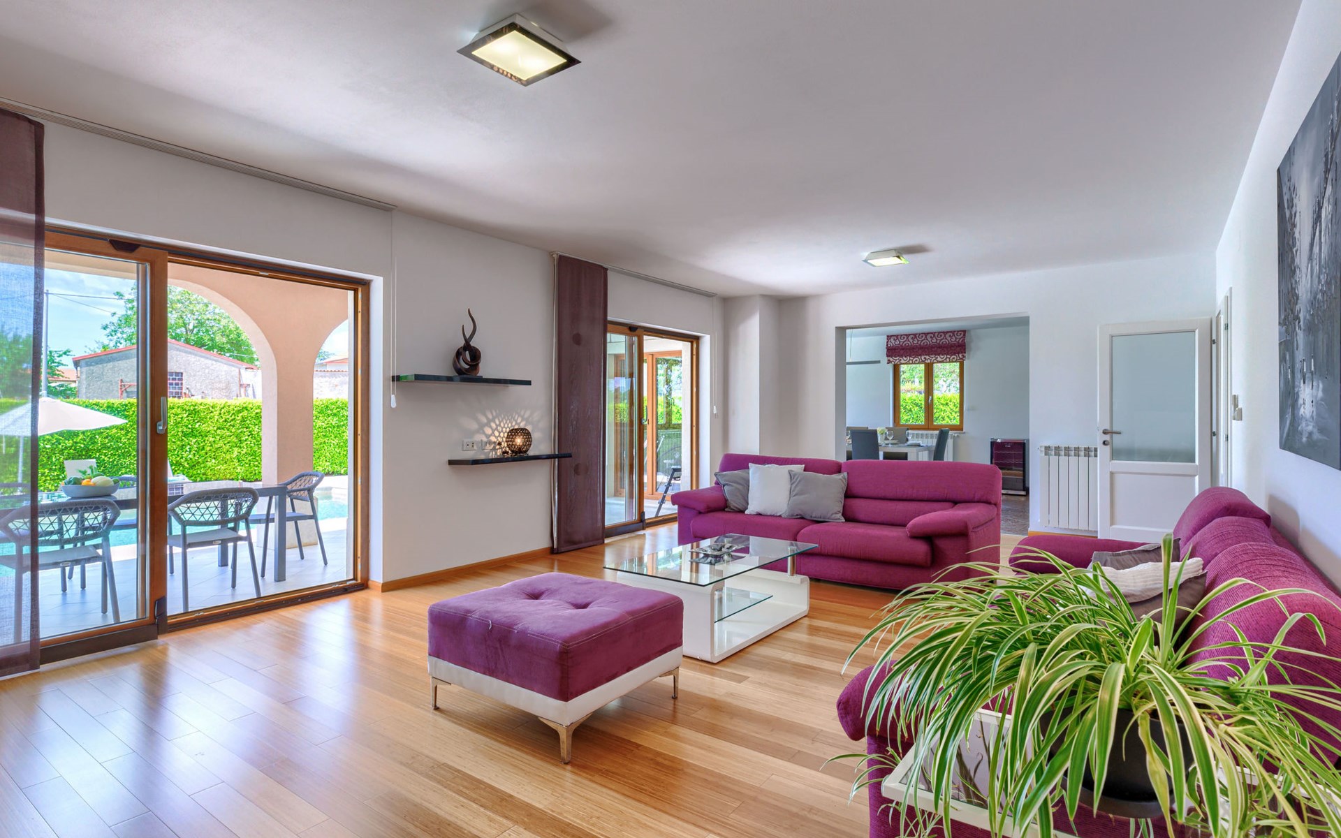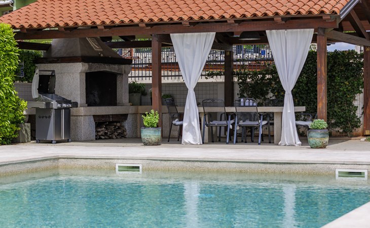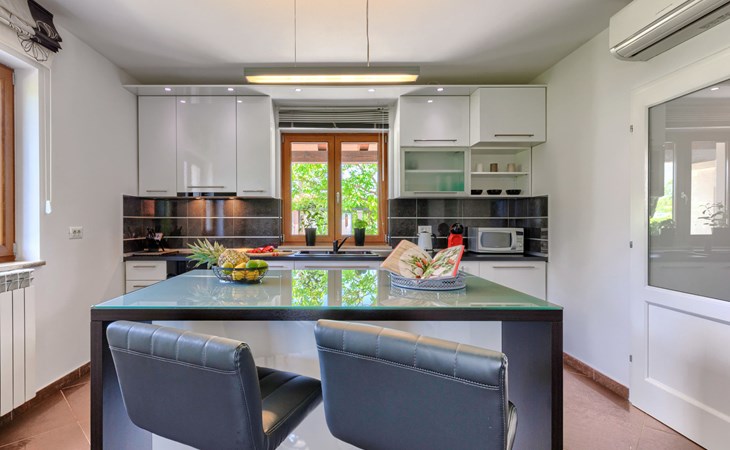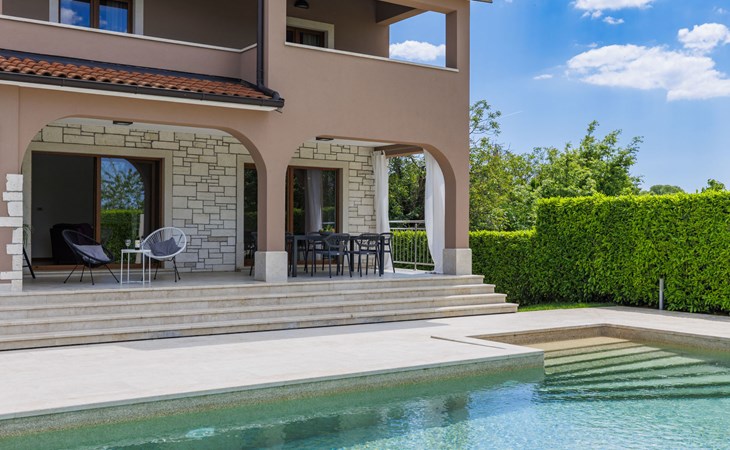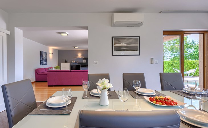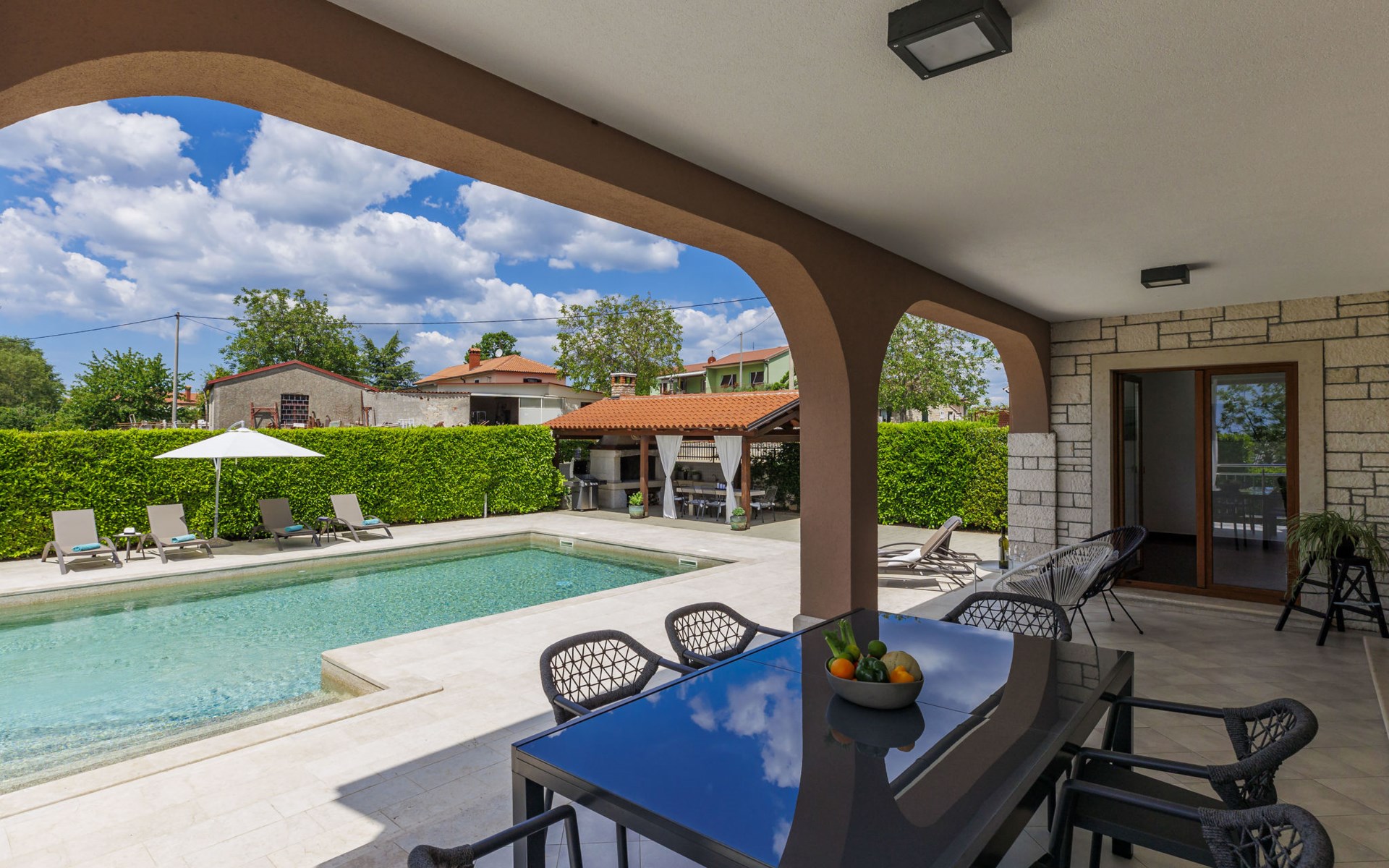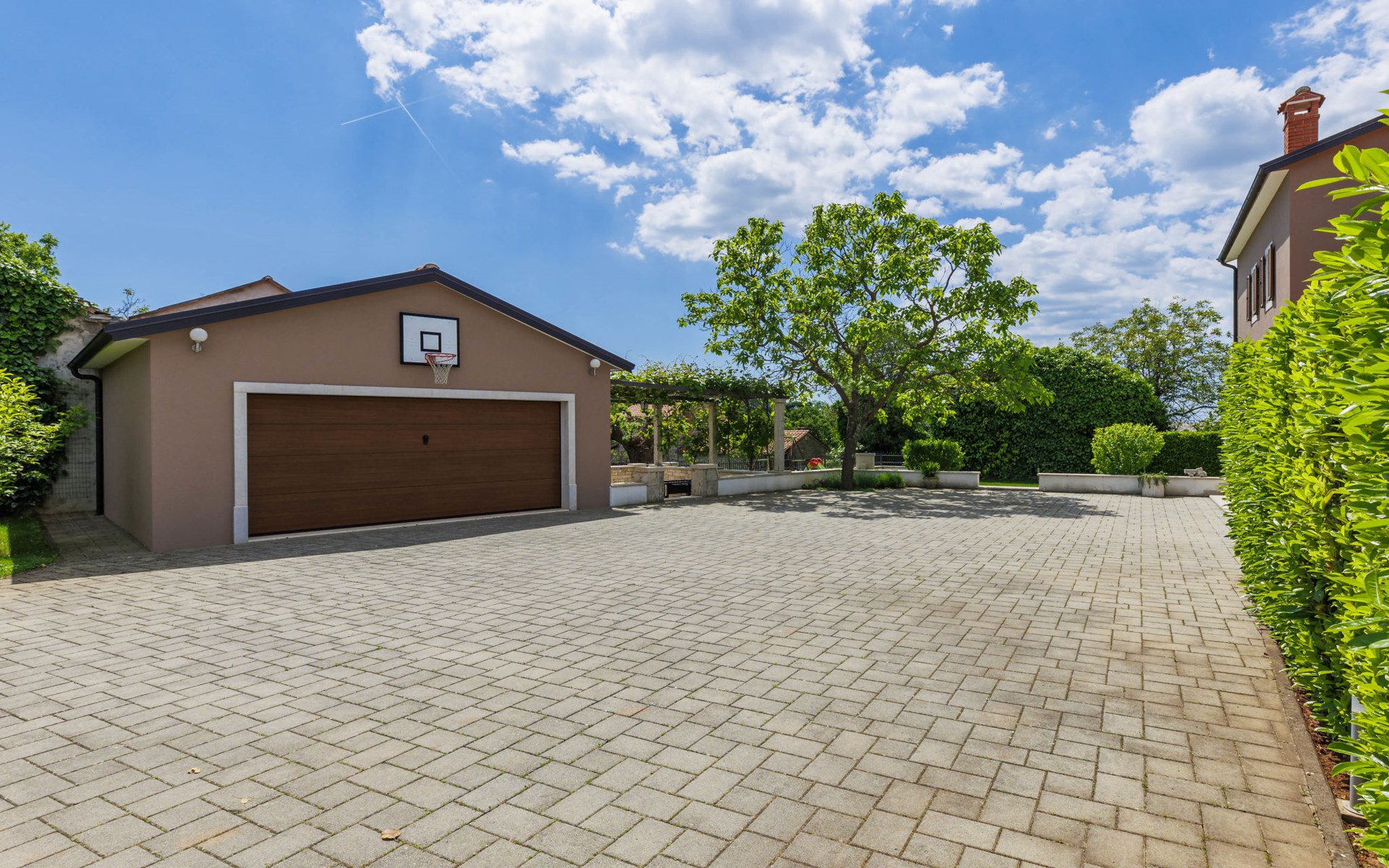 Child friendly, beautiful, comfortable villa "Anastasia", 2 storeys. 6 km from the centre of Žminj, 13 km from the centre of Pazin, in a sunny position, 27 km from the sea, 27 km from the beach, in the countryside. Private: property 1'800 m2 (fenced), beautiful garden with lawn 200 m2, swimming pool (10 x 6 m, depth 140 cm, seasonal availability: 27.Apr. - 26.Oct.) with internal staircase. Outdoor shower, basketball, terrace, garden furniture, barbecue, children's playground. In the house: internet access, table football, washing machine, tumble dryer. Parking at the house on the premises. Shop 500 m, supermarket 6 km, restaurant 1 km, café 400 m, bus stop 6.9 km, railway station 1 km, pebble beach 27 km. Riding stable 7 km, walking paths from the house 1 km, cycle lane 1 km. Available: darts.