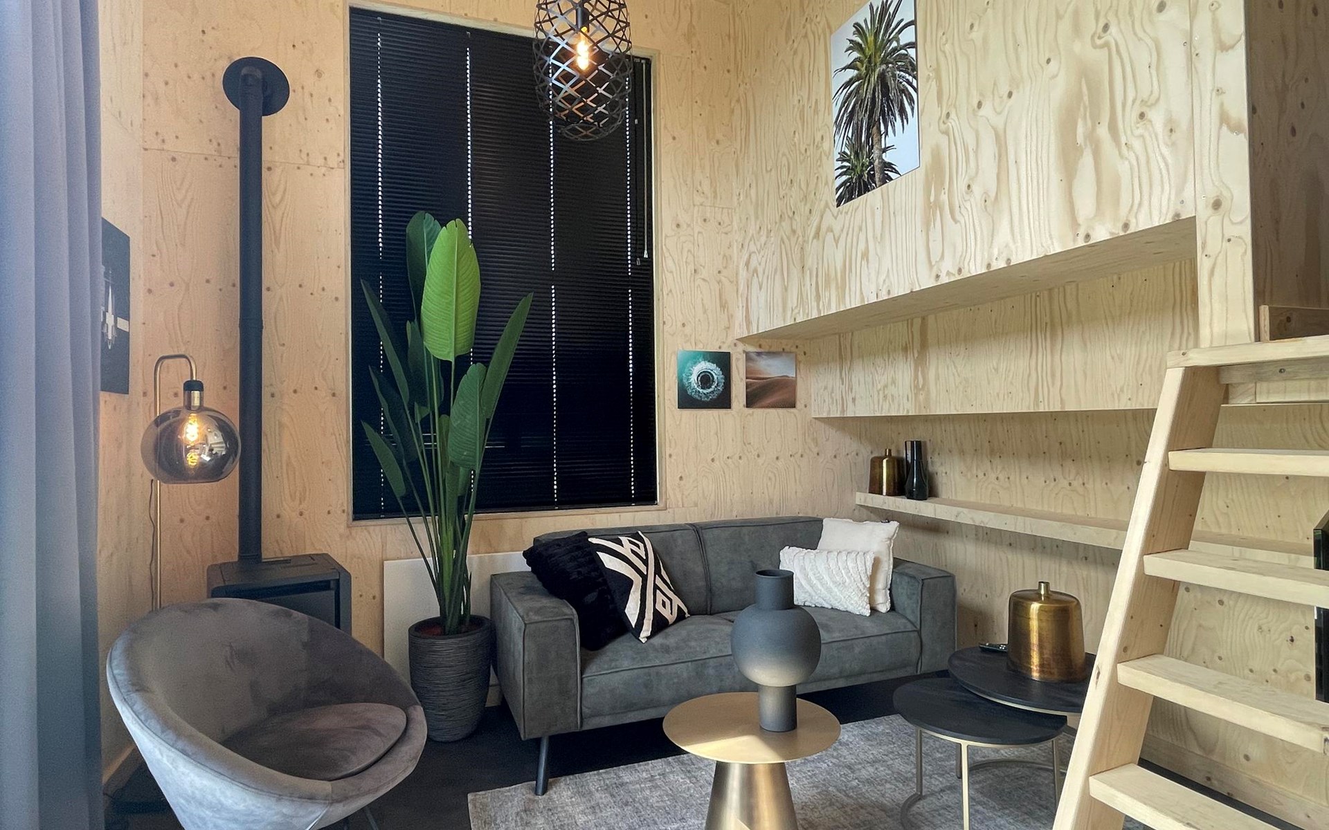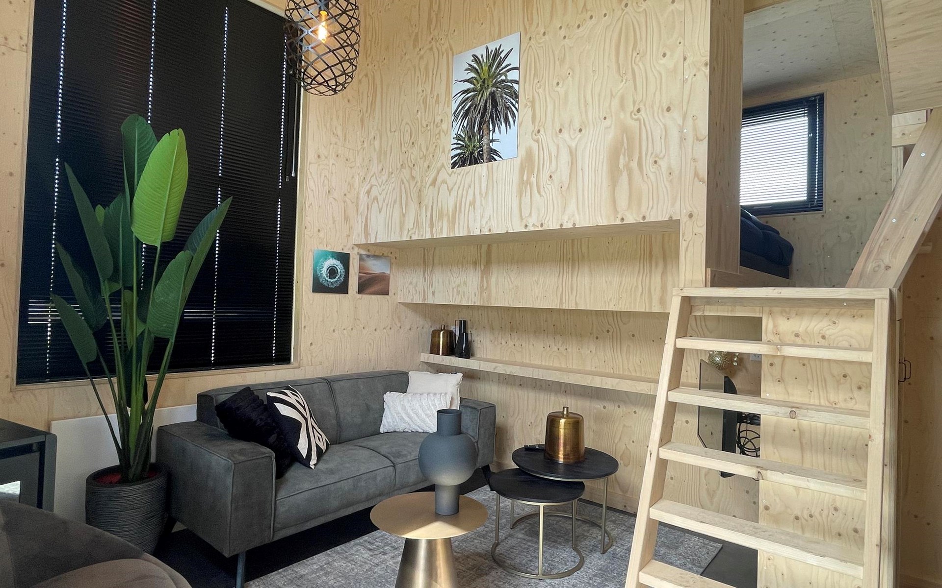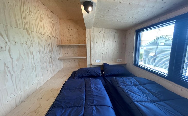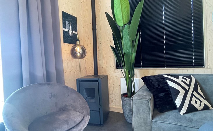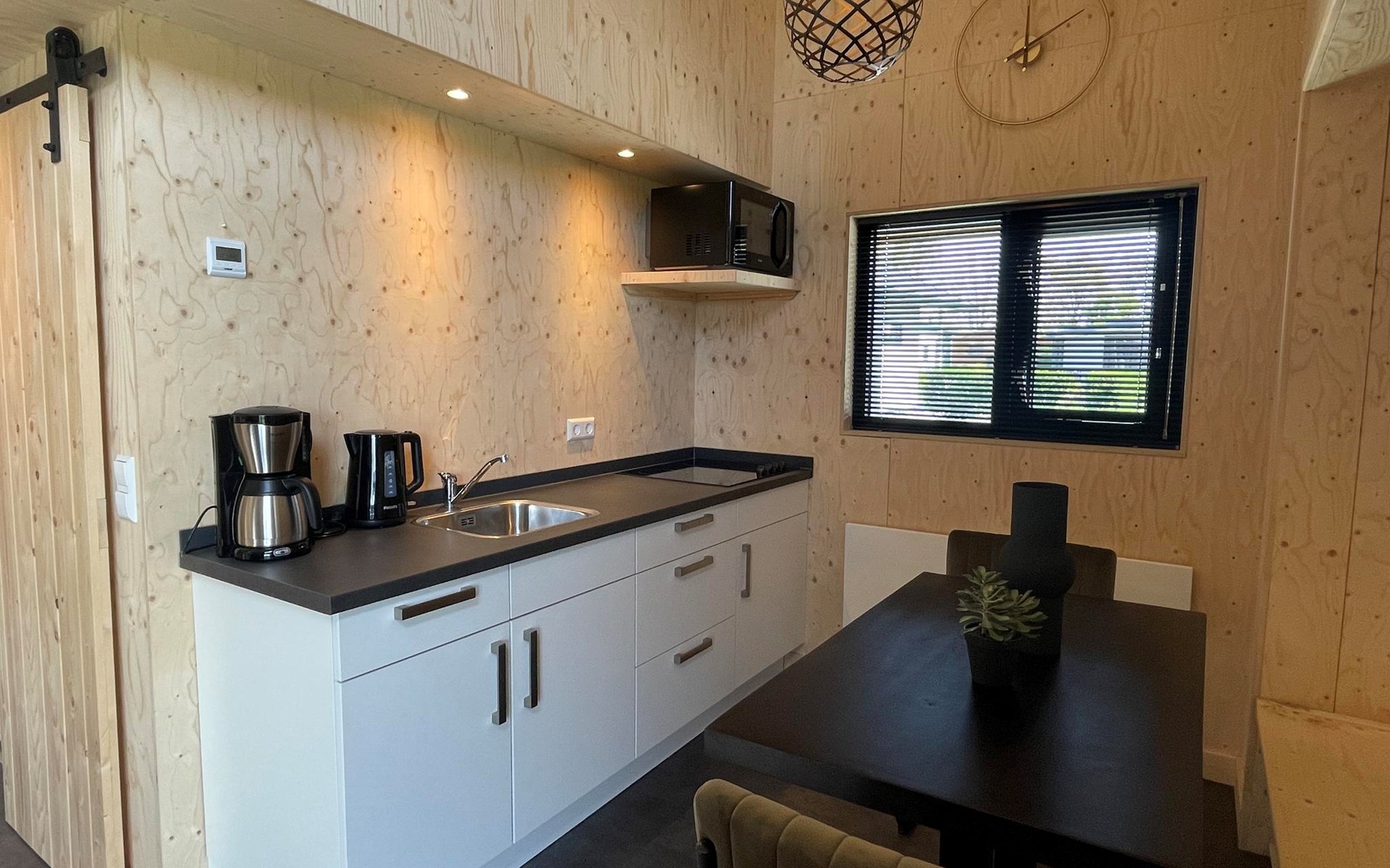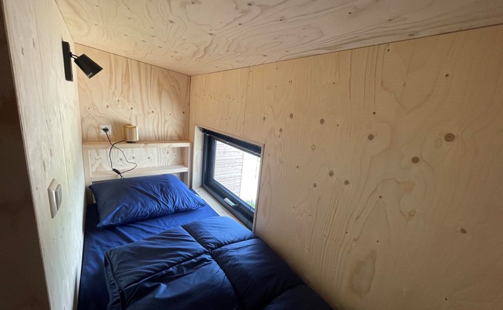 Tiny House 4 is a cosy and atmospheric chalet with a playful division. The Tiny House has a cosy sitting area with smart TV and a dining area where you can dine or work. The kitchen is equipped with a microwave, filter coffee maker, kettle and fridge freezer. Stairs lead to the two bedrooms, one of which has a box bed and the other has two single beds. The bathroom has a shower, toilet and sink. On the terrace with garden furniture and a parasol you can enjoy the surroundings. You can park your car near the chalet and use the free Wi-Fi.