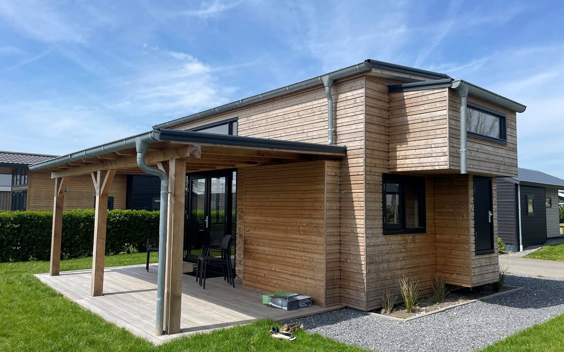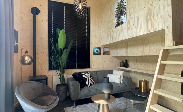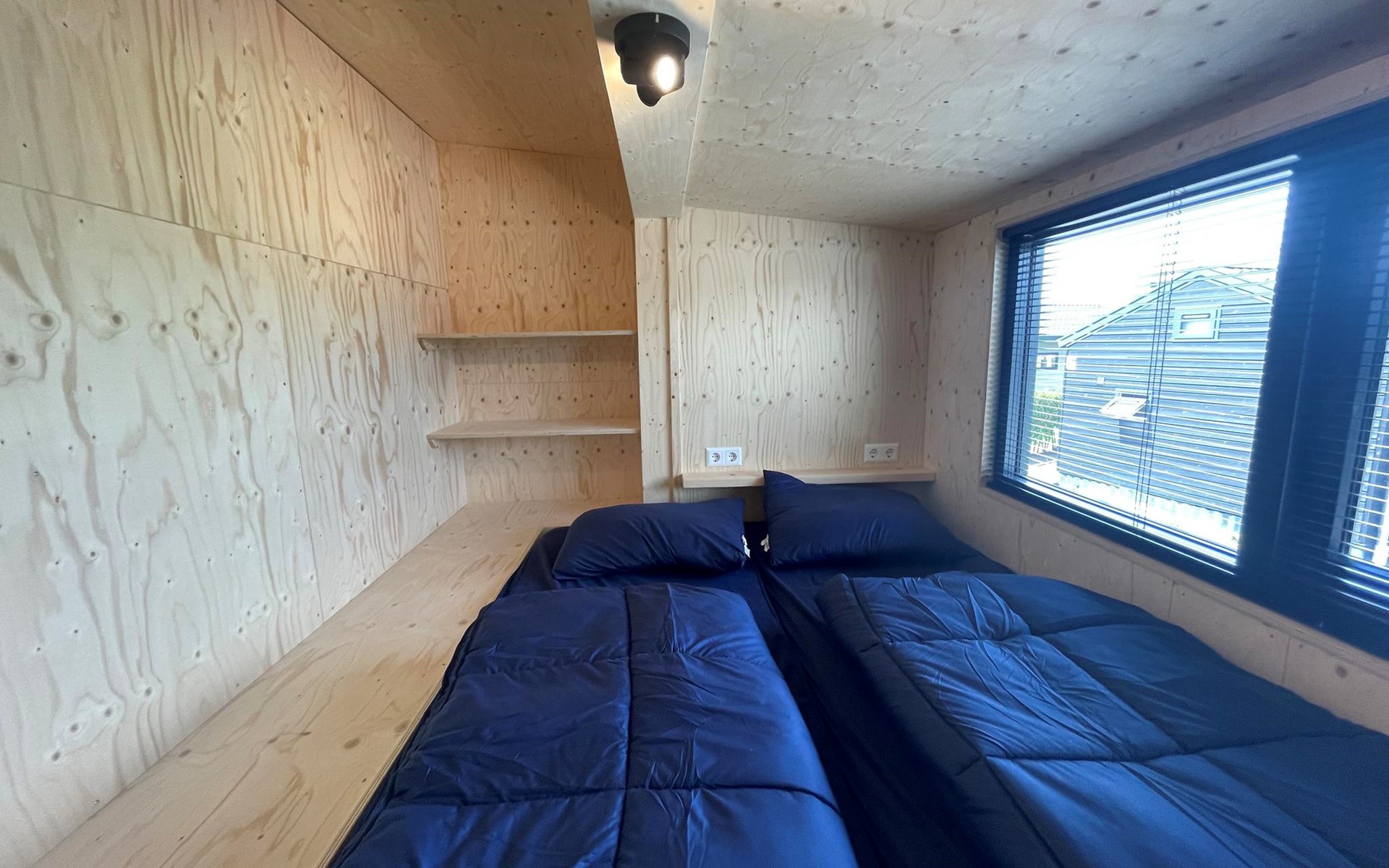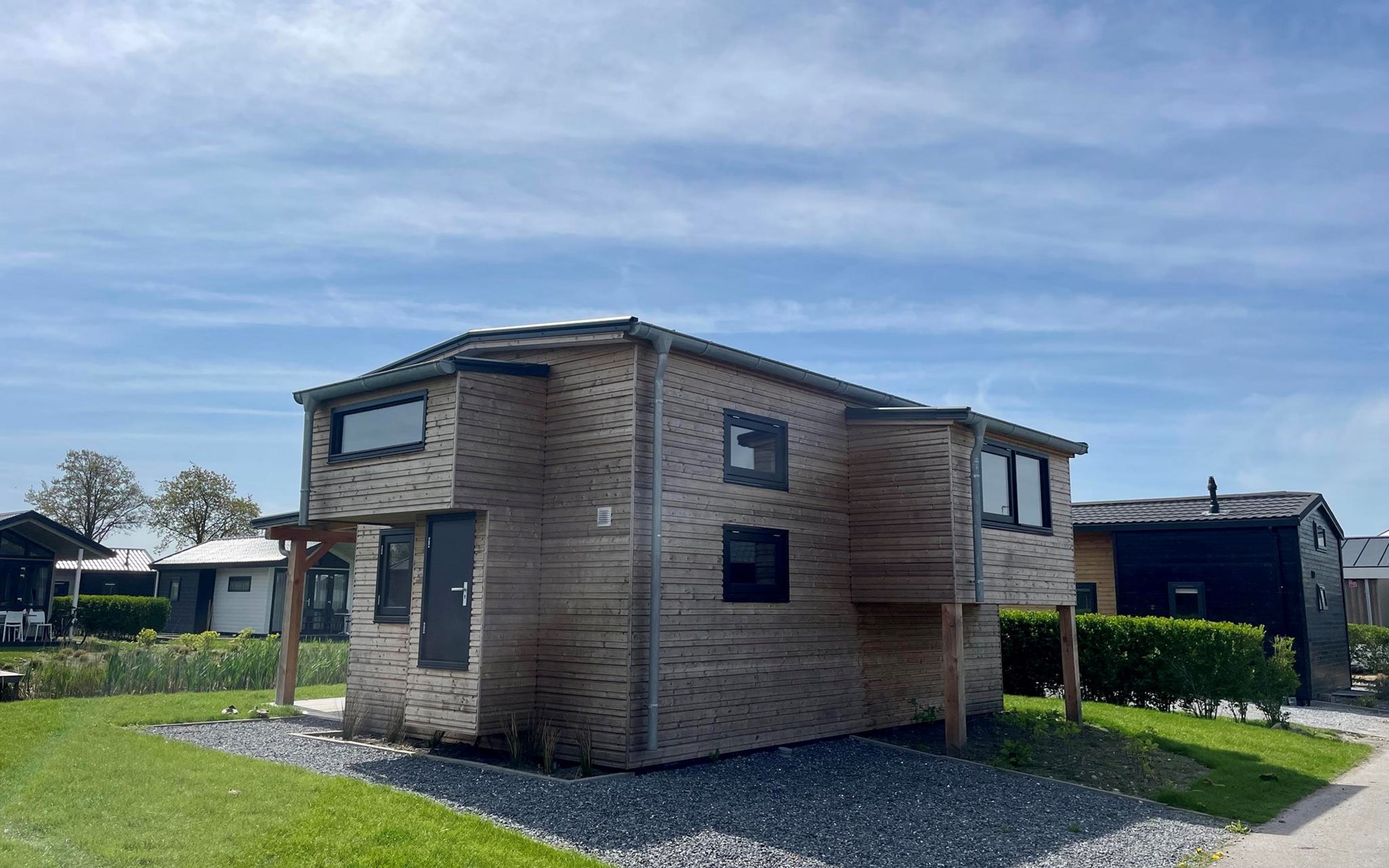 Tiny House 4 is a cosy and atmospheric chalet with a playful division. The Tiny House has a cosy sitting area with smart TV and a dining area where you can dine or work. The kitchen is equipped with a microwave, filter coffee maker, kettle and fridge freezer. Stairs lead to the two bedrooms, one of which has a box bed and the other has two single beds. The bathroom has a shower, toilet and sink. On the terrace with garden furniture and a parasol you can enjoy the surroundings. You can park your car near the chalet and use the free Wi-Fi.
