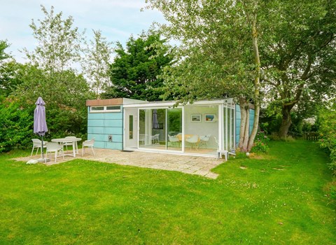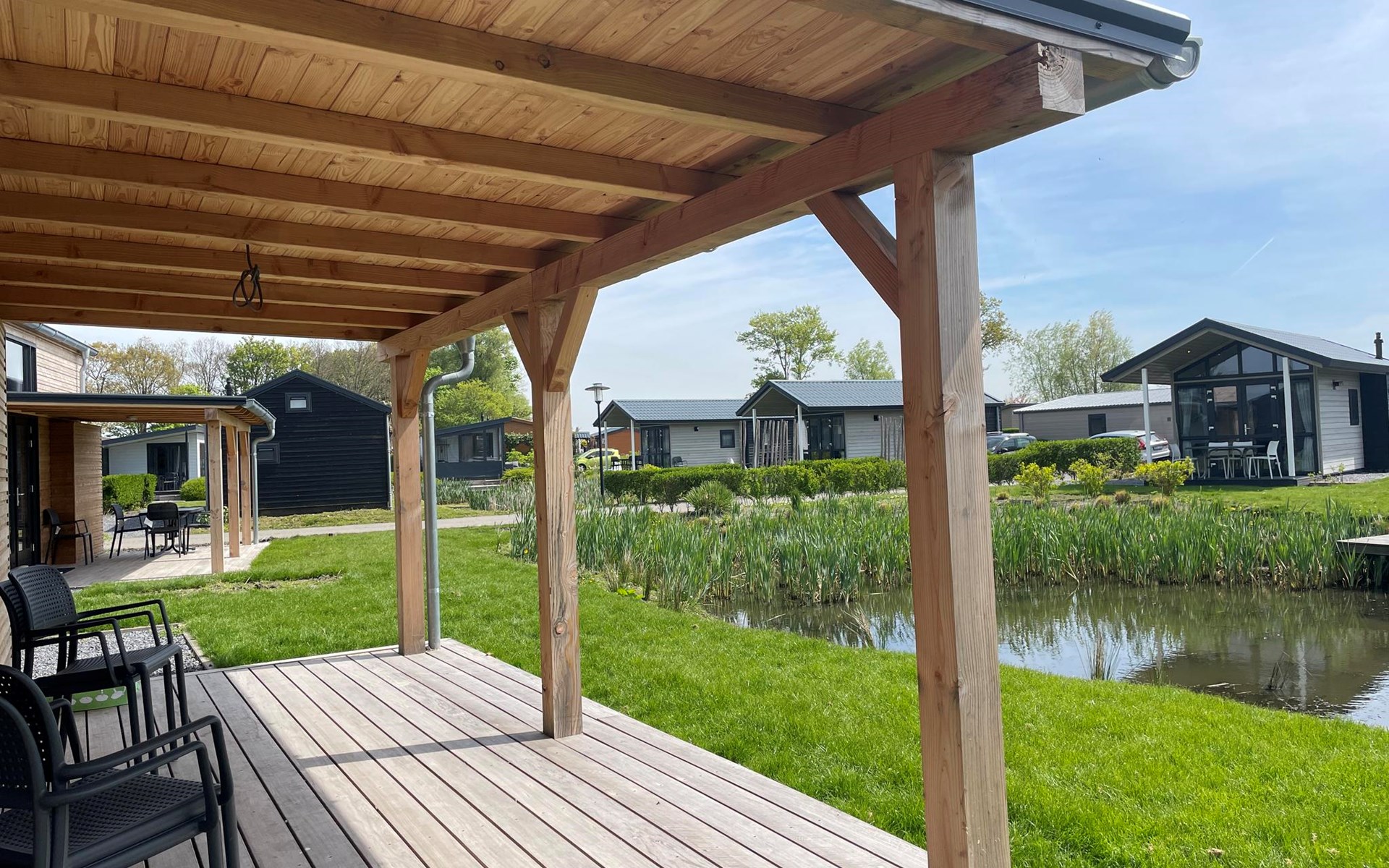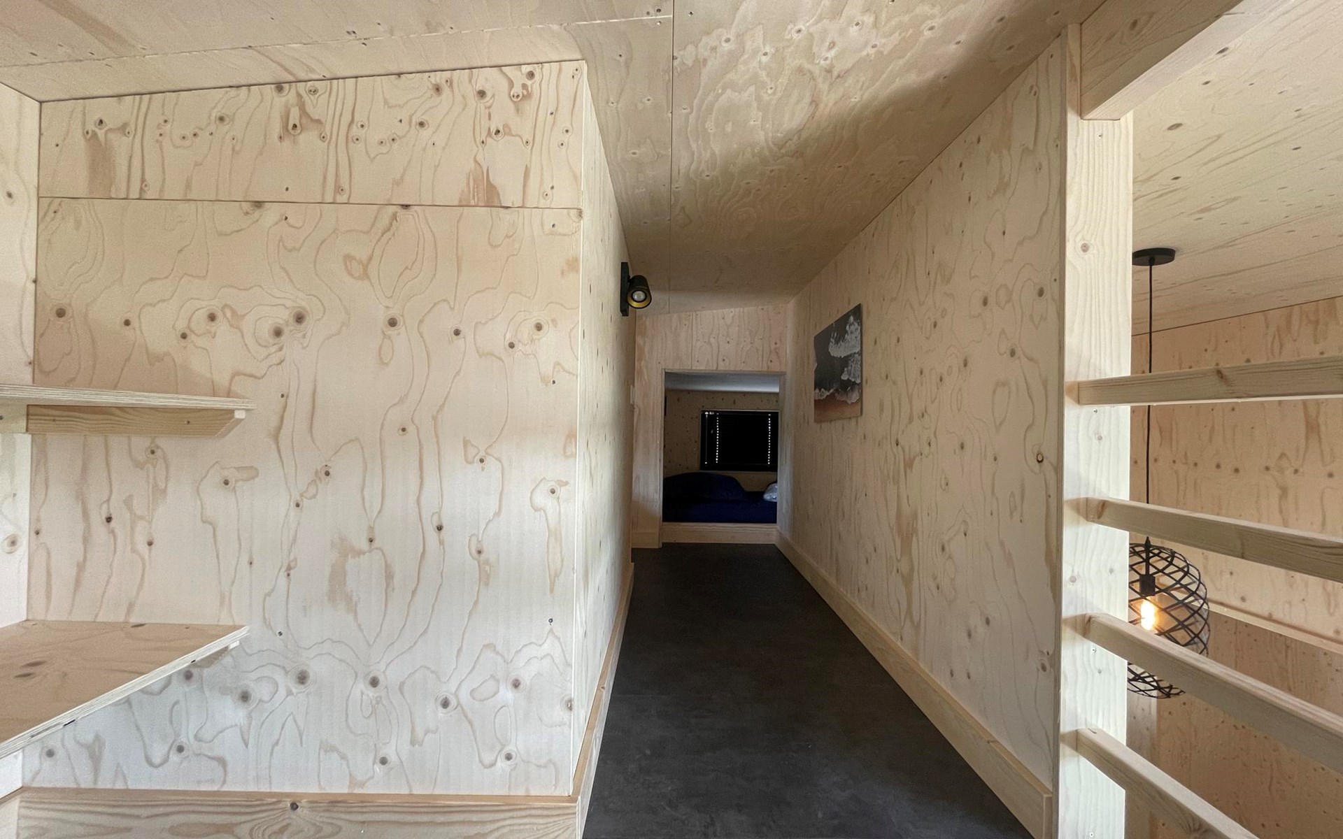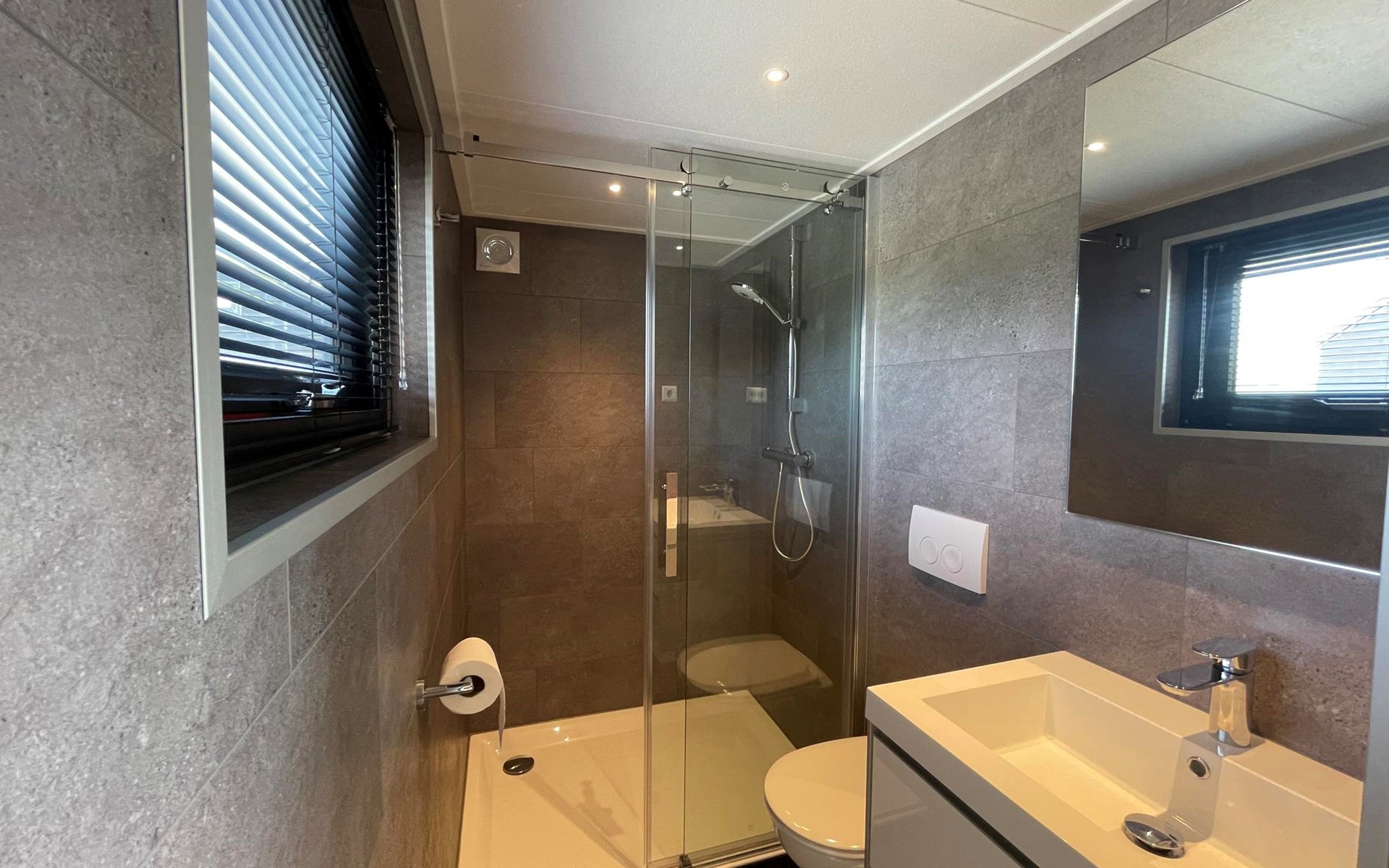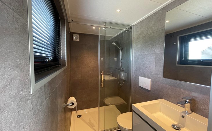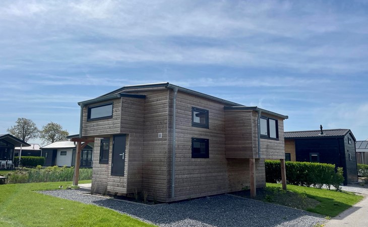 Tiny House 4 is a cosy and atmospheric chalet with a playful division. The Tiny House has a cosy sitting area with smart TV and a dining area where you can dine or work. The kitchen is equipped with a microwave, filter coffee maker, kettle and fridge freezer. Stairs lead to the two bedrooms, one of which has a box bed and the other has two single beds. The bathroom has a shower, toilet and sink. On the terrace with garden furniture and a parasol you can enjoy the surroundings. You can park your car near the chalet and use the free Wi-Fi.