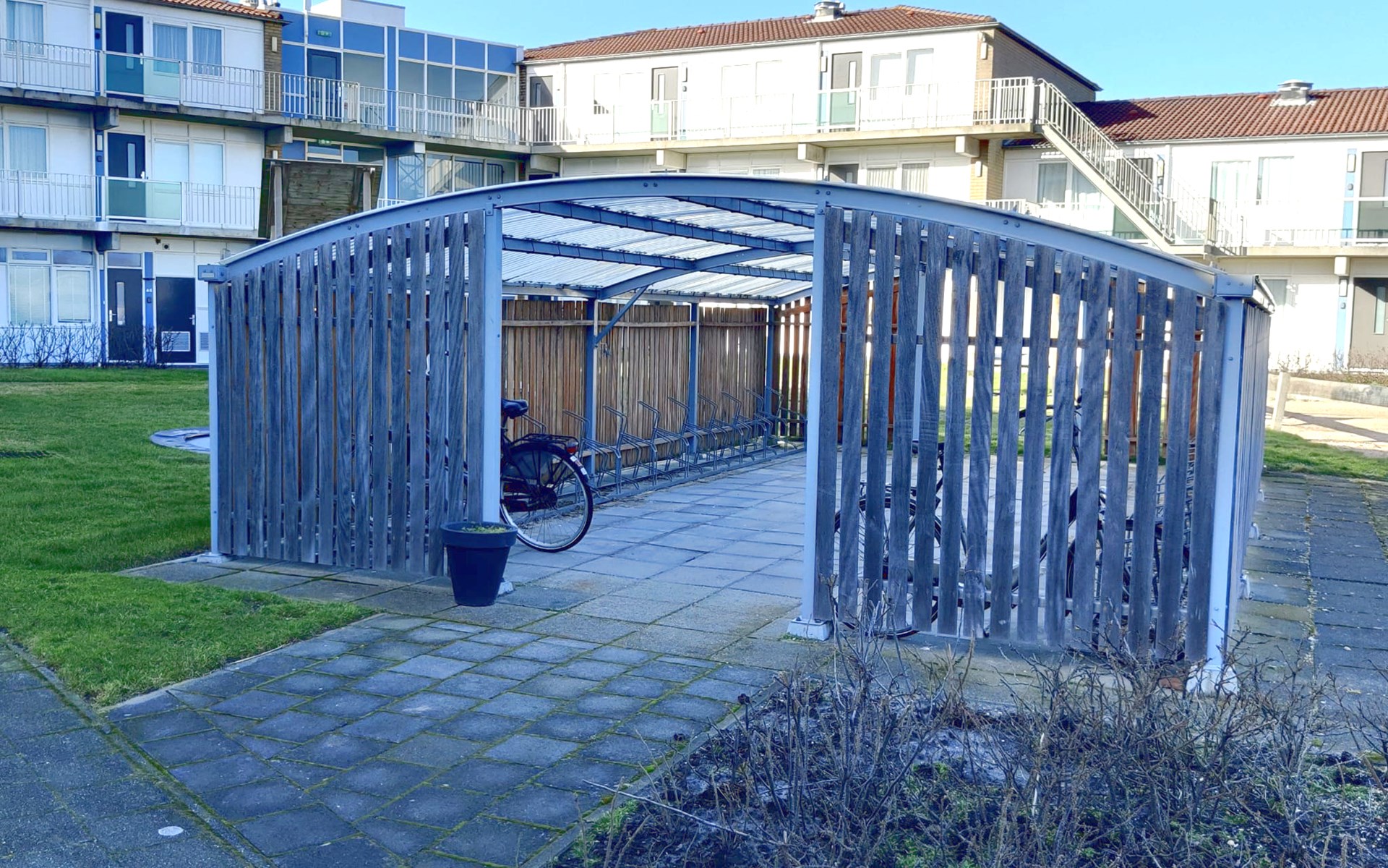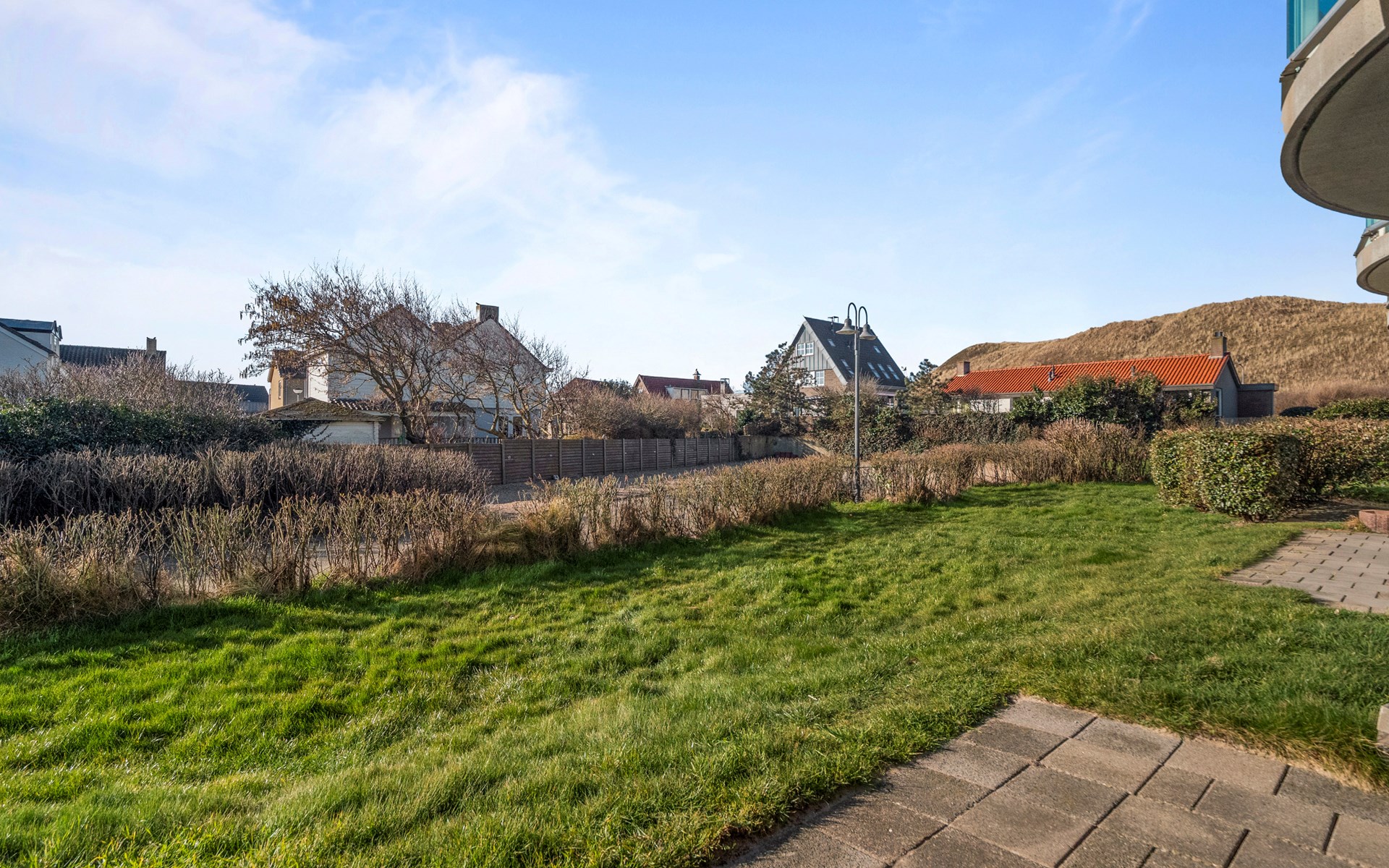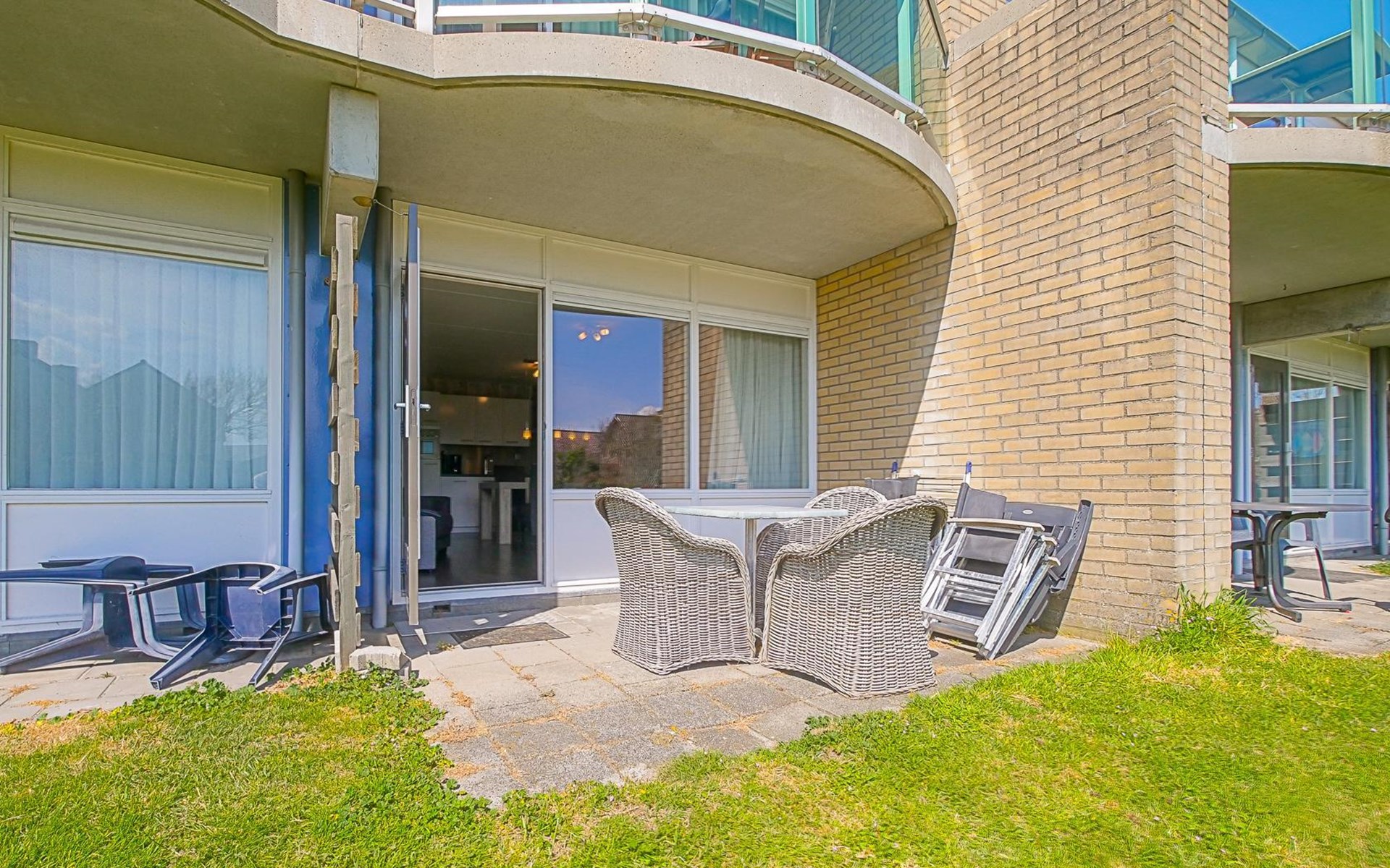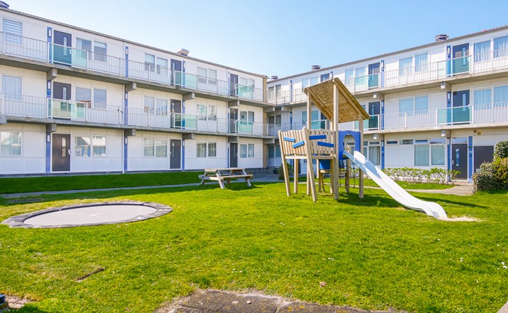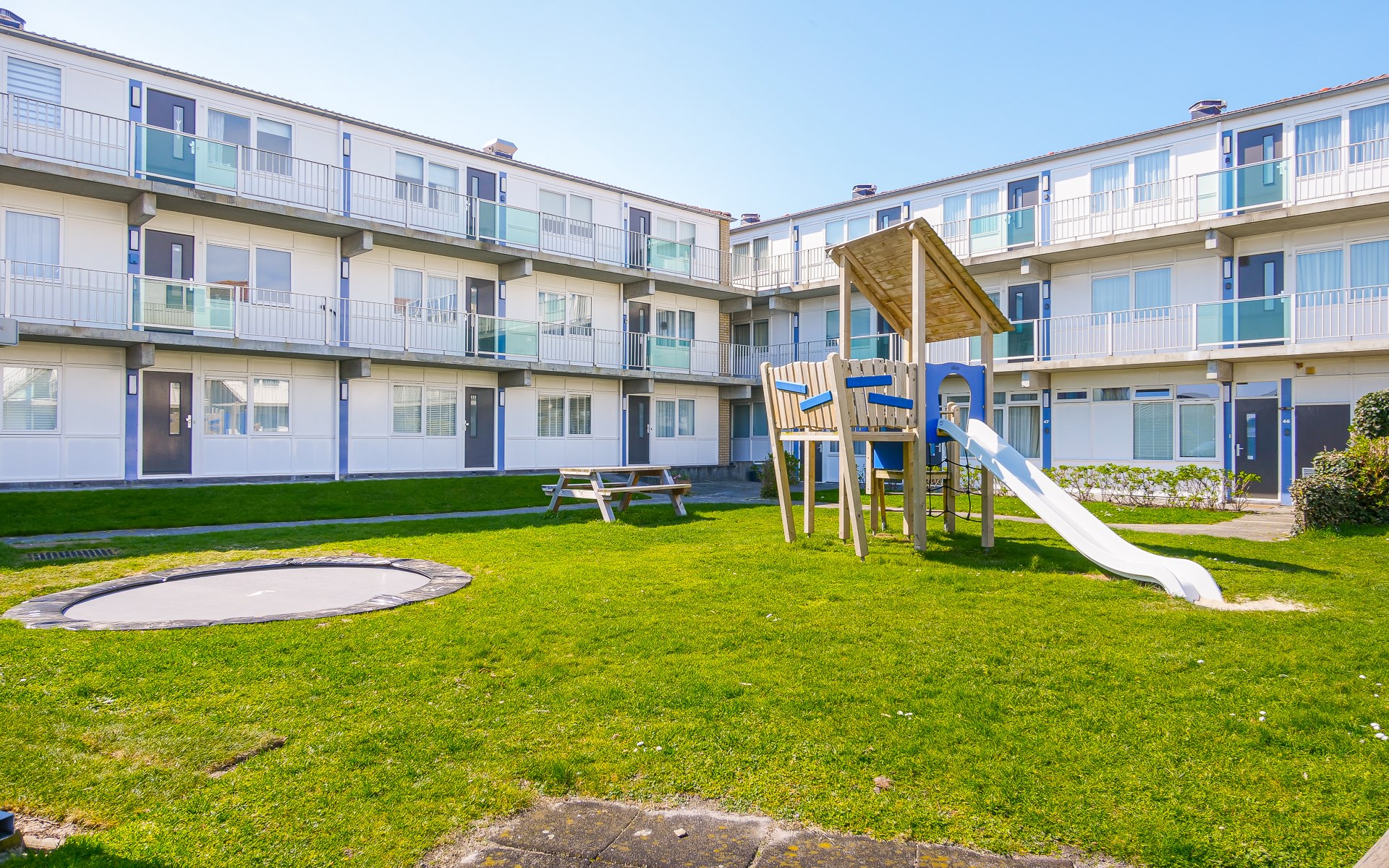 The inner courtyard of the complex features a fun playground with a trampoline, slide, and swings. While the kids are playing, you can relax on your private terrace and enjoy the peaceful view of the dunes and lawn.