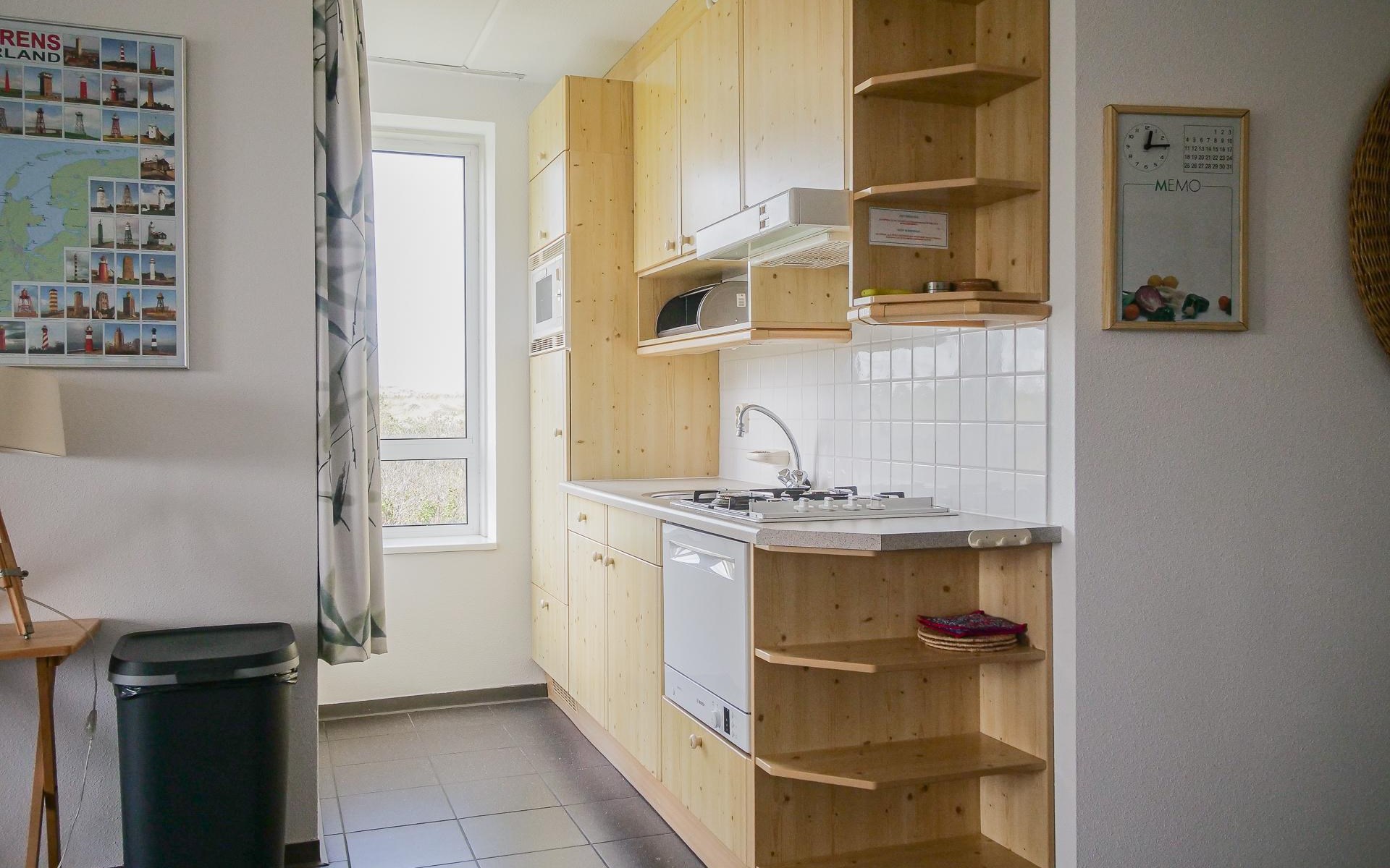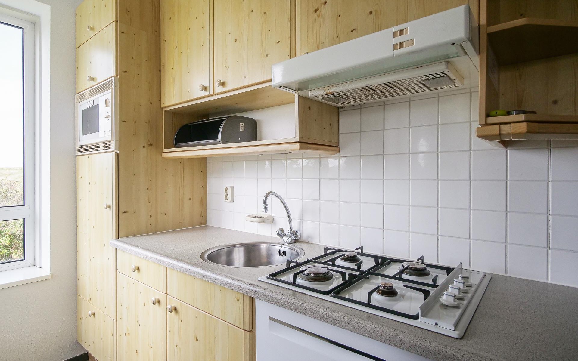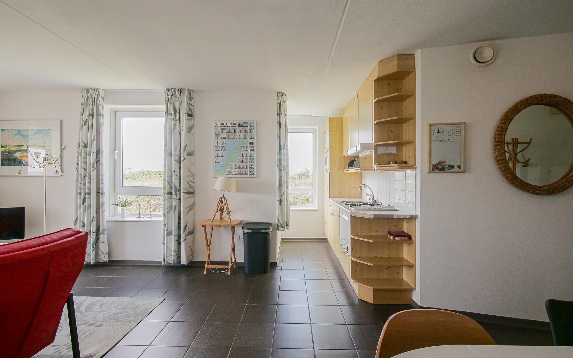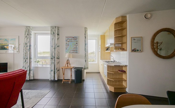 The spacious living room offers a cosy sitting area with two sofas and large windows overlooking the dunes. The open kitchen is fully equipped and features a dining table, perfect for cooking and enjoying meals with a view.