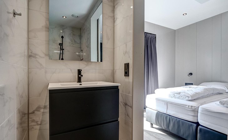 What makes vacation home Zee truly unique are the bedrooms. Each bedroom has comfortable single beds, offering flexibility when you wish to sleep separately. But the real highlight is that each bedroom has its own bathroom! So there are a total of 4 bathrooms (2 per cottage) which are very luxuriously appointed with beautiful marble walls, luxurious vanities and round mirrors with LED lighting and heating.
