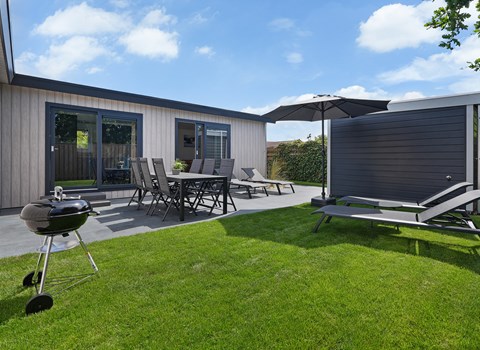 Inside, the lodge immediately feels bright and atmospheric. Thanks to the air conditioning, you can heat or cool the lodge as needed, ideal for warm summer days and cooler evenings. The fully equipped kitchen, including a fridge-freezer, dishwasher and complete kitchen inventory, makes cooking truly enjoyable. The sleeping arrangements are as follows: