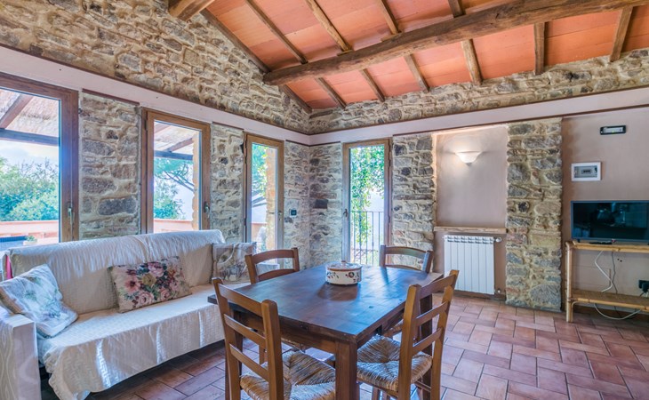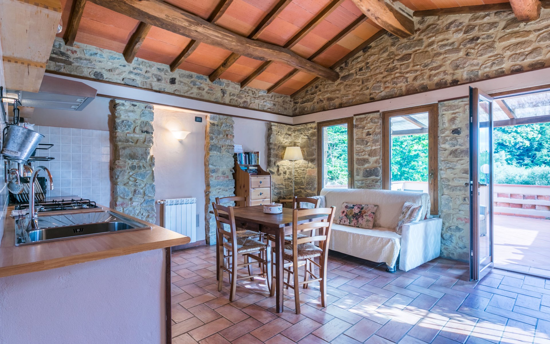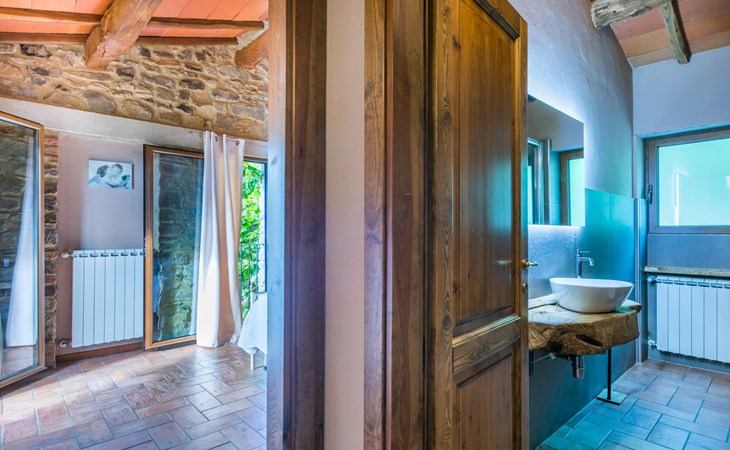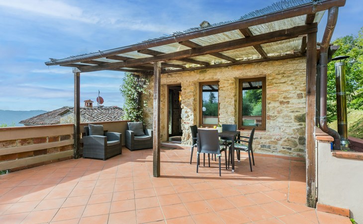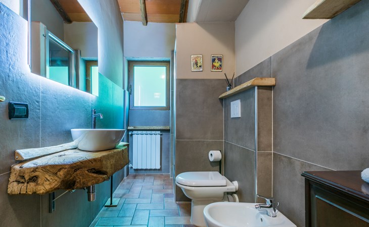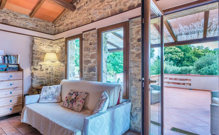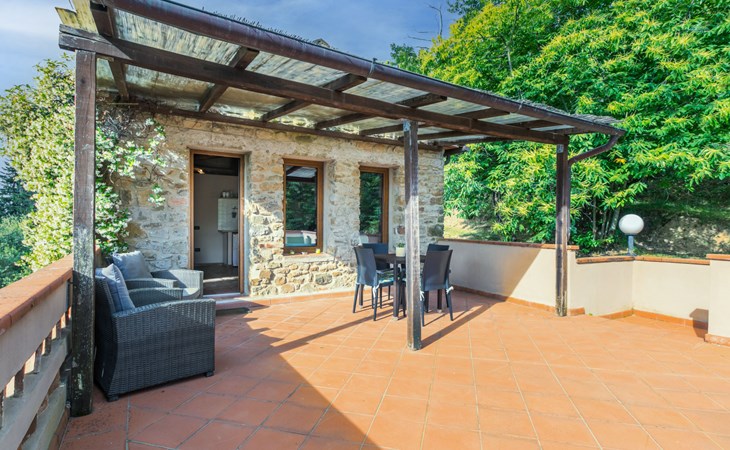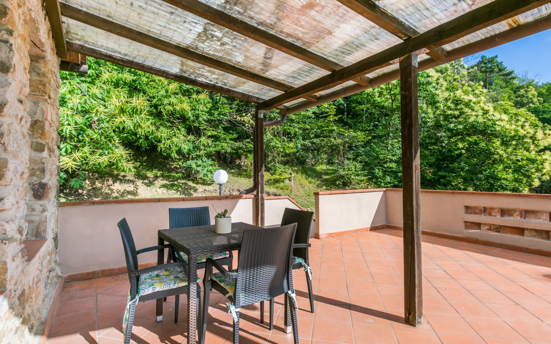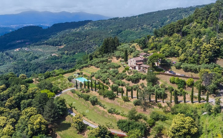 Agriturismo "La Cupola", 500 m a.s.l., surrounded by trees and vineyards. 3 houses in the residence. 4 apartments in the residence. 5.5 km from the centre of Pescia, 20 km from the centre of Lucca, 45 km from the centre of Pisa, in a secluded position on a slope, 57 km from the sea, in the countryside. For shared use: property 40'000 m2, terraced garden (not fenced) with plants, meadow, swimming pool (19 x 8 m, depth 120 - 160 cm, seasonal availability: 26.Apr. - 27.Sep.). Children's pool, pergola, garden furniture, barbecue. In the house: WiFi, central heating system, washing machine (for shared use), heating to be paid on the spot, heating available only from 01.Nov. - 30.Mar.. 600 m long steep motor access (via unmade road). Parking on the premises. E-charging station. Supermarket 5.5 km, bus stop 3 km, sandy beach "Viareggio" 57 km. Golf course (18 hole) 14 km. Nearby attractions: Collodi 9 km, Montecarlo 11 km, Montecatini Terme 13 km, Vinci, Pistoia 32 km, San Miniato 38 km. Residence with electric gates.