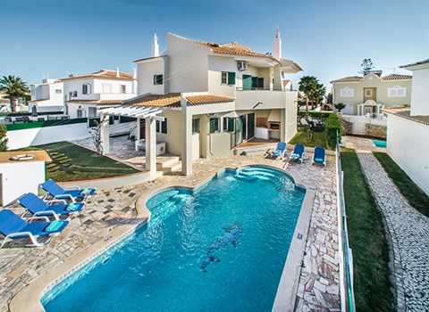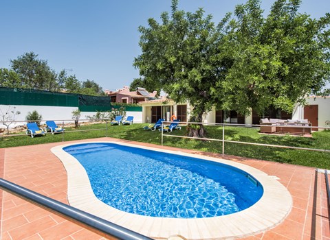 Resort "Golf". 4 km from the centre of Portimão, 3 km from the sea, on the golf course. Private: property 1'500 m2 (fenced) with lawn and trees, swimming pool (15 x 6 m, depth 160 - 200 cm, seasonal availability: 01.Jan. - 31.Dec.). Outdoor shower, pool maintenance by the owner/gardener. Roofed, parking (for 2 cars) on the premises. Shop 4 km, restaurant 1.5 km, bus stop 2.3 km, sandy beach "Alvor" 3 km. Golf course (18 hole), tennis 150 m. Please note: airfield close by 400 m from the property. Single lane runway for sports planes 400 m.