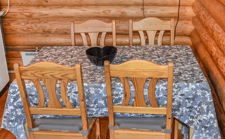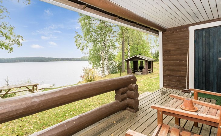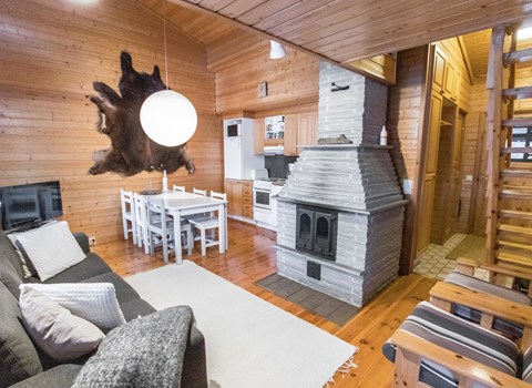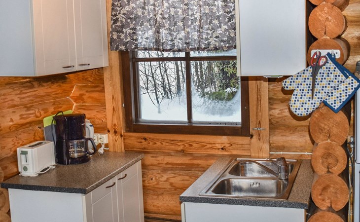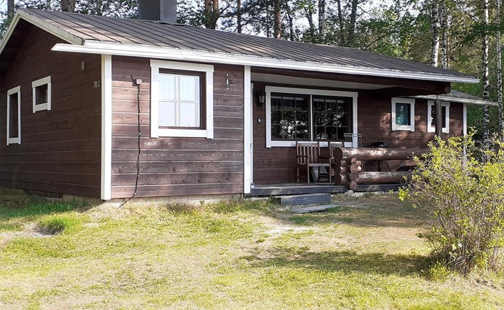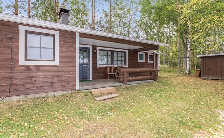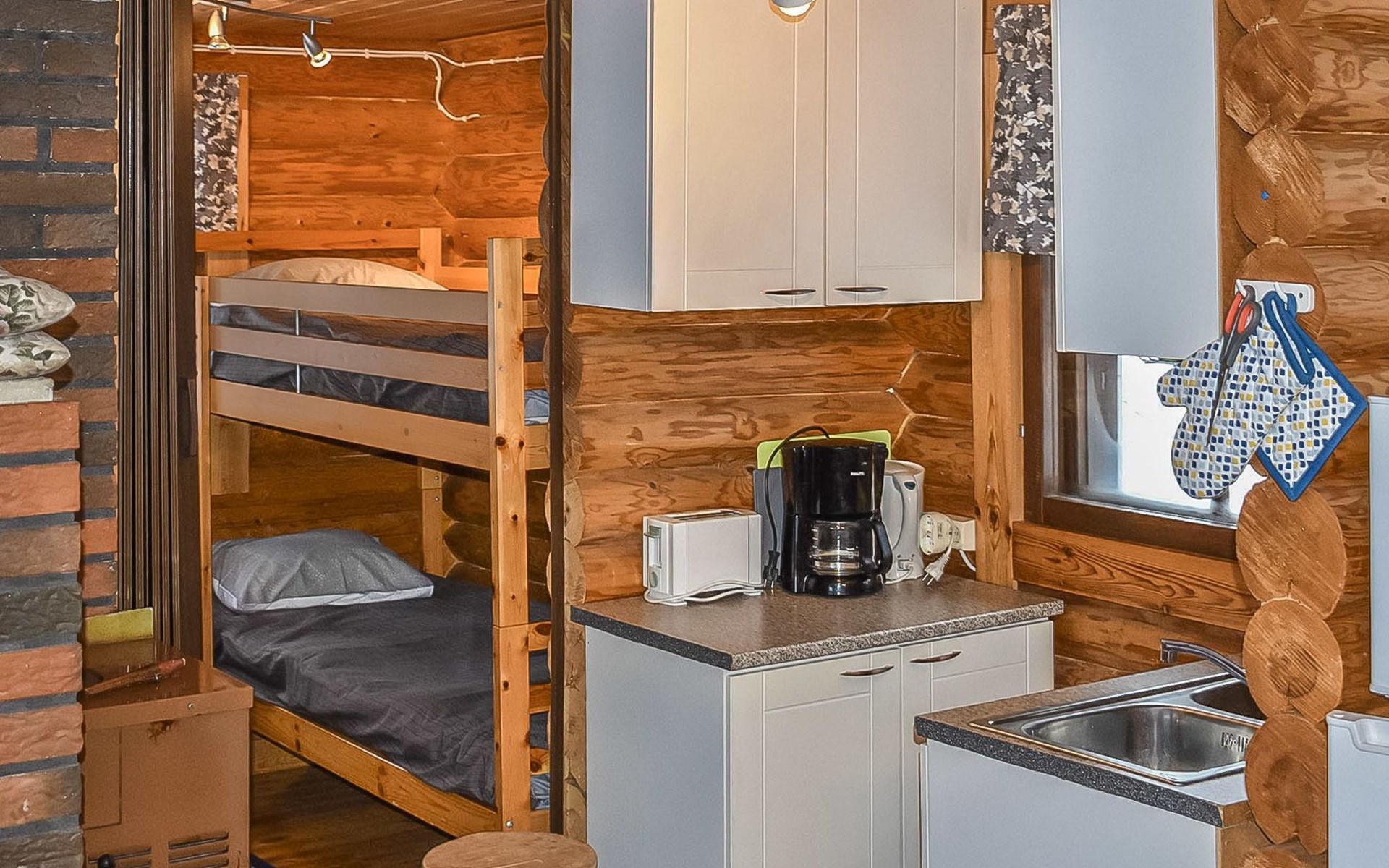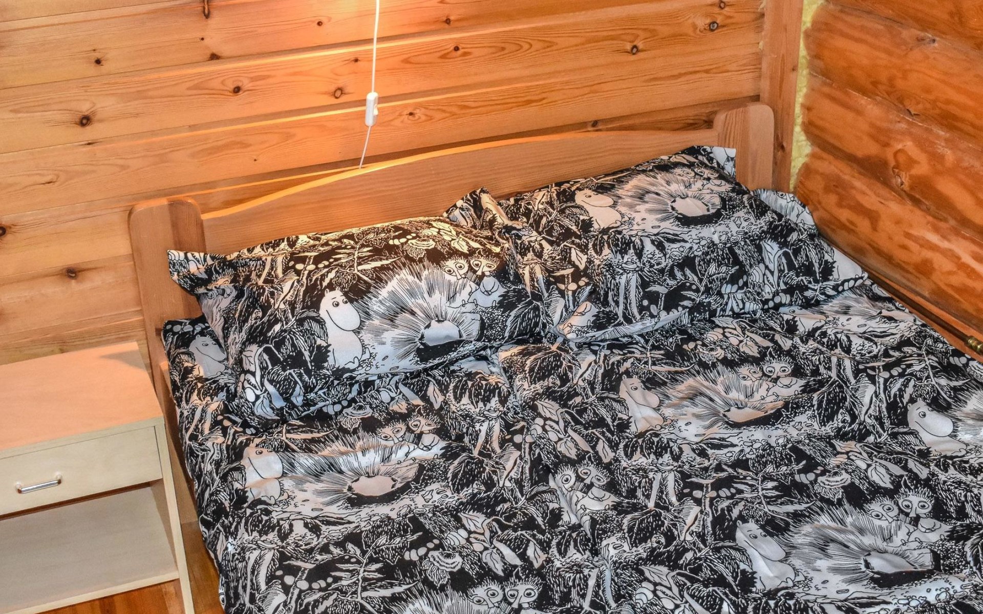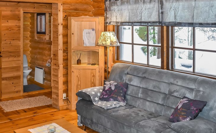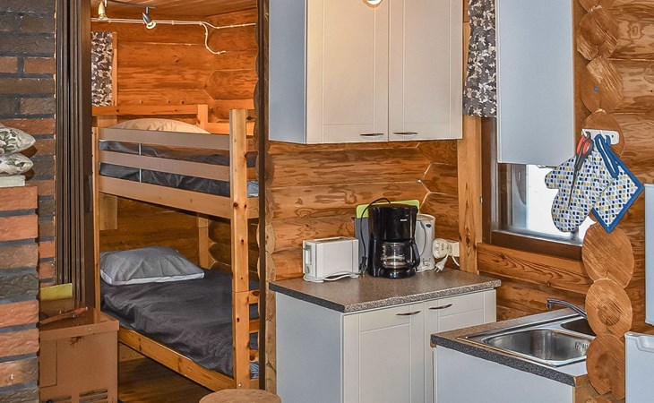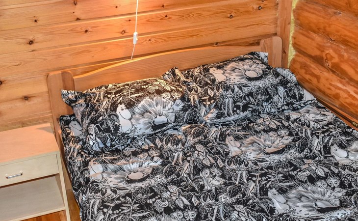 In cottage living room/kitchen with 1 extra bed, bedroom with double bed (120 x 200 cm), alcove bunk bed, sauna, dressing room, open veranda. Access to shower/sauna from terrace. Cottage has also a wood stove. Extra fee for pets 20 eur/pet.